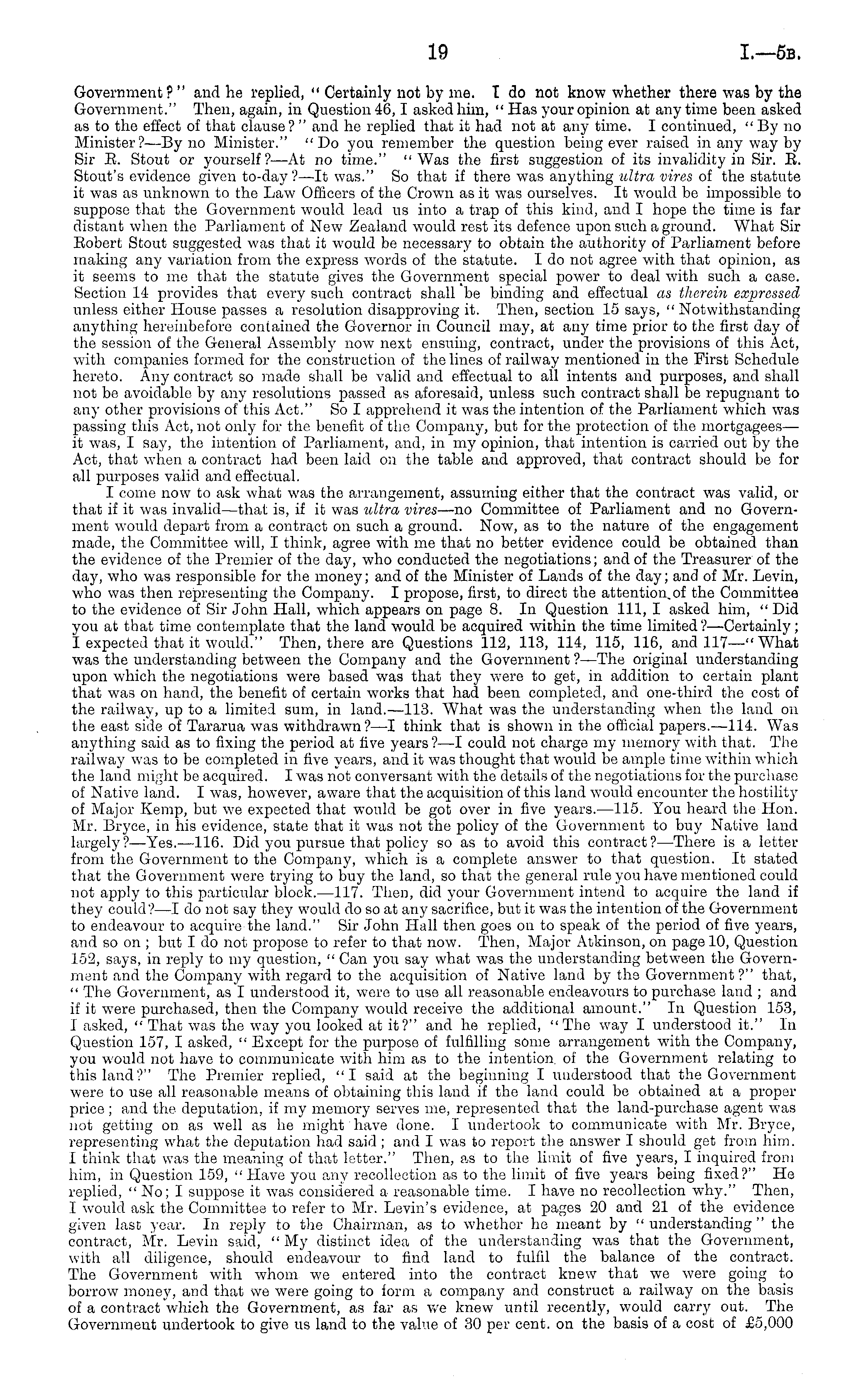 Government? " and he replied, " Certainly not by me. T do not know whether there was by the Government." Then, again, in Question 46,1 asked him, " Has your opinion at any time been askod as to the effect of that clause? " and he replied that it had not at any time. I continued, "By no Minister?—By no Minister." "Do you remember the question being ever raised in any way by Sir E. Stout or yourself?—At no time." "Was the first suggestion of its invalidity in Sir. R. Stout's evidence given to-day?—lt was." So that if there was anything ultra vires of the statute it was as unknown to the Law Officers of the Crown as it was ourselves. It would be impossible to suppose that the Government would lead us into a trap of this kind, and I hope the time is far distant when the Parliament of New Zealand would rest its defence upon such a ground. What Sir Eobert Stout suggested was that it would be necessary to obtain the authority of Parliament before making any variation from the express words of the statute. Ido not agree with that opinion, as it seems to me that the statute gives the Government special power to deal with such a case. Section 14 provides that every such contract shall be binding and effectual as therein expressed unless either House passes a resolution disapproving it. Then, section 15 says, " Notwithstanding anything hereinbefore contained the Governor in Council may, at any time prior to the first day of the session of the General Assembly now next ensuing, contract, under the provisions of this Act, with companies formed for the construction of the lines of railway mentioned in the First Schedule hereto. Any contract so made shall be valid and effectual to all intents and purposes, and shall not be avoidable by any resolutions passed as aforesaid, unless such contract shall be repugnant to any other provisions of this Act." So I apprehend it was the intention of the Parliament which was passing this Act, not only for the benefit of the Company, but for the protection of the mortgagees—■ it was, I say, the intention of Parliament, and, in my opinion, that intention is carried out by the Act, that when a contract had been laid on the table and approved, that contract should be for all purposes valid and effectual. I come now to ask what was the arrangement, assuming either that the contract was valid, or that if it was invalid—that is, if it was ultra vires —no Committee of Parliament and no Government would depart from a contract on such a ground. Now, as to the nature of the engagement made, the Committee will, I think, agree with me that no better evidence could be obtained than the evidence of the Premier of the day, who conducted the negotiations; and of the Treasurer of the day, who was responsible for the money; and of the Minister of Lands of the day; and of Mr. Levin, who was then representing the Company. I propose, first, to direct the attention, of the Committee to the evidence of Sir John Hall, which appears on page 8. In Question 111,1 asked him, " Did you at that time contemplate that the land would be acquired within the time limited ? —Certainly ; I expected that it would." Then, there are Questions 112, 113, 114, 115, 116, and 117—" What was the understanding between the Company and the Government ?—The original understanding upon which the negotiations were based was that they were to get, in addition to certain plant that was on hand, the benefit of certain works that had been completed, and one-third the cost of the railway, up to a limited sum, in land. —113. What was the understanding when the laud on the east side of Tararua was withdrawn?—l think that is shown in the official papers.—ll4. Was anything said as to fixing the period at five years?—l could not charge my memory with that. The railway was to be completed in five years, and it was thought that would be ample time within which the land might be acquired. I was not conversant with the details of the negotiations for the purchase of Native land. I was, however, aware that the acquisition of this land would encounter the hostility of Major Kemp, but we expected that would be got over in five years. —115. You heard the Hon. Mr. Bryce, in his evidence, state that it was not the policy of the Government to buy Native land largely?—Yes.—ll6. Did you pursue that policy so as to avoid this contract? —There is a letter from the Government to the Company, which is a complete answer to that question. It stated that the Government were trying to buy the land, so that the general rule you have mentioned could not apply to this particular block. —117. Then, did your Government intend to acquire the land if they could?—l do not say they would do so at any sacrifice, but it was the intention of the Government to endeavour to acquire the land." Sir John Hall then goes on to speak of the period of five years, and so on ; but Ido not propose to refer to that now. Then, Major Atkinson, on page 10, Question 152, says, in reply to my question, " Can you say what was the understanding between the Government and the Company with regard to the acquisition of Native land by the Government?" that, " The Government, as I understood it, were to use all reasonable endeavours to purchase land ; and if it were purchased, then the Company would receive the additional amount." In Question 153, I asked, " That was the way you looked at it?" and he replied, "The way I understood it." In Question 157, I asked, " Except for the purpose of fulfilling some arrangement with the Company, you would not have to communicate with him as to the intention, of the Government relating to this land?" The Premier replied, "I said at the beginning I understood that the Government were to use all reasonable means of obtaining this land if the land could be obtained at a proper price ; and the deputation, if my memory serves me, represented that the land-purchase agent was not getting on as well as he might have