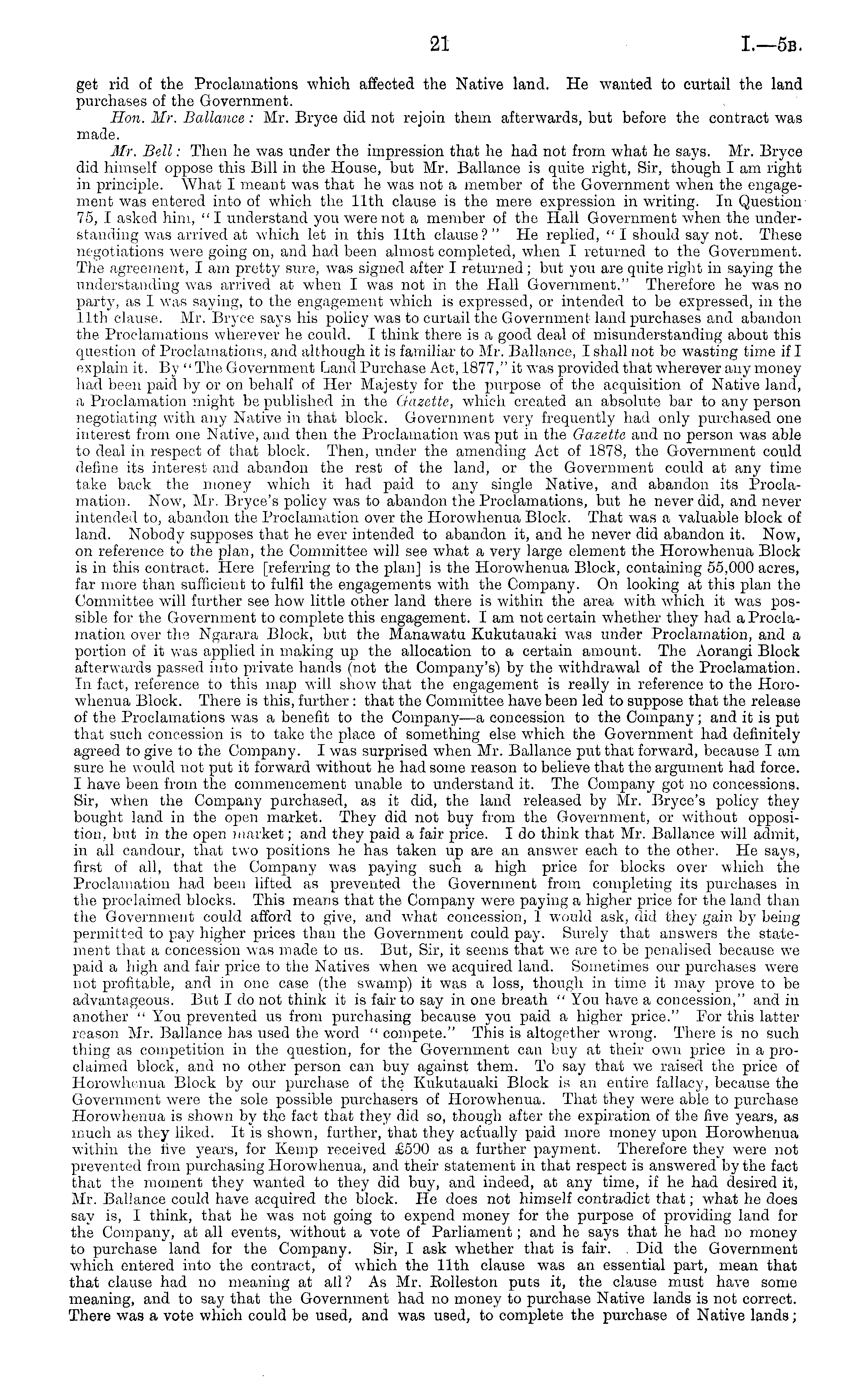 get rid of the Proclamations which affected the Native land. He wanted to curtail the land purchases of the Government. Hon. Mr. Ballance : Mr. Bryce did not rejoin them afterwards, but before the contract was made. Mr. Bell: Then he was under the impression that he had not from what he says. Mr. Bryce did himself oppose this Bill in the House, but Mr. Ballance is quite right, Sir, though I am right in principle. What I meant was that he was not a member of the Government when the engagement was entered into of which the 11th clause is the mere expression in writing. In Question 75, I asked him, "I understand you were not a member of the Hall Government when the understanding was arrived at which let in this 11th clause?" He replied, "I should say not. These negotiations were going on, and had been almost completed, when I returned to the Government. The agreement, lam pretty sure, was signed after I returned; but you are quite right in saying the understanding was arrived at when I was not in the Hall Government." Therefore he was no party, as I was saying, to the engagement which is expressed, or intended to be expressed, in the 11th clause. Mr. Bryce says his policy was to curtail the Government land purchases and abandon the Proclamations wherever he could. I think there is a good deal of misunderstanding about this question of Proclamations, and although it is familiar to Mr. Ballance, I shall not be wasting time if I explain it. By "The Government Land Purchase Act, 1877,' it was provided that wherever any money had been paid by or on behalf of Her Majesty for the purpose of the acquisition of Native land, a Proclamation might be published in the Gazette, which created an absolute bar to any person negotiating with any Native in that block. Government very frequently had only purchased one interest from one Native, and then the Proclamation was put in the Gazette and no person was able to deal in respect of that block. Then, under the amending Act of 1878, the Government could define its interest and abandon the rest of the land, or the Government could at any time take back the money which it had paid to any single Native, and abandon its Proclamation. Now, Mr. Bryce's policy was to abandon the Proclamations, but he never did, and never intended to, abandon the Proclamation over the Horowhenua Block. That was a valuable block of land. Nobody supposes that he ever intended to abandon it, and ho never did abandon it. Now, on reference to the plan, the Committee will see what a very large element the Horowhenua Block is in this contract. Here [referring to the plan] is the Horowhenua Block, containing 55,000 acres, far more than sufficient to fulfil the engagements with the Company. On looking at this plan the Committee will further see how little other land there is within the area with which it was possible for the Government to complete this engagement. I am not certain whether they had a Proclamation over the Ngarara Block, but the Manawatu Kukutauaki was under Proclamation, and a portion of it was applied in making up the allocation to a certain amount. The Aorangi Block afterwards passed into private hands (not the Company's) by the withdrawal of the Proclamation. In fact, reference to this map will show that the engagement is really in reference to the Horowhenua Block. There is this, further : that the Committee have been led to suppose that the release of the Proclamations was a benefit to the Company—a concession to the Company; and it is put that such concession is to take the place of something else which the Government had definitely agreed to give to the Company. I was surprised when Mr. Ballance put that forward, because lam sure he would not put it forward without he had some reason to believe that the argument had force. I have been from the commencement unable to understand it. The Company got no concessions. Sir, when the Company purchased, as it did, the land released by Mr. Bryce's policy they bought land in the open market. They did not buy from the Government, or without opposition, but in the open market; and they paid a fair price. Ido think that Mr. Ballance will admit, in all candour, that two positions he has taken up are an answer each to the other. He says, first of all, that the Company was paying such a high price for blocks over which the Proclamation had been lifted as prevented the Government from completing its pure-liases in the proclaimed blocks. This means that the Company were paying a higher price for the land than the Government could afford to give, and what concession, I would ask, did they gain by being permitted to pay higher prices than the Government could pay. Surely that answers the statement that a concession was made to us. But, Sir, it seems that we are to be penalised because we paid a high and fair price to the Natives when we acquired land. Sometimes our purchases were not profitable, and in one case (the swamp) it was a loss, though in time it may prove to be advantageous. But Ido not think it is fair to say in one breath " You have a concession," and in another " You prevented us from purchasing because you paid a higher price." For this latter reason Mr. Ballance has used the word " compete." This is altogether wrong. There is no such thing as competition in the question, for the Government can buy at their own price in a proclaimed block, and no other person can buy against them. To say that we raised the price of Horowhenua Block by our purchase of the Kukutauaki Block is an entire fallacy, because the Government were the sole possible purchasers of Horowhenua. That they were able to purchase Horowhenua is shown by the fact that they did so, though after the expiration of the five years, as much as they liked. It is shown, further, that they actually paid more money upon Horowhenua within the five years, for Kemp received £500 as a further payment. Therefore they were not prevented from purchasing Horowhenua, and their s