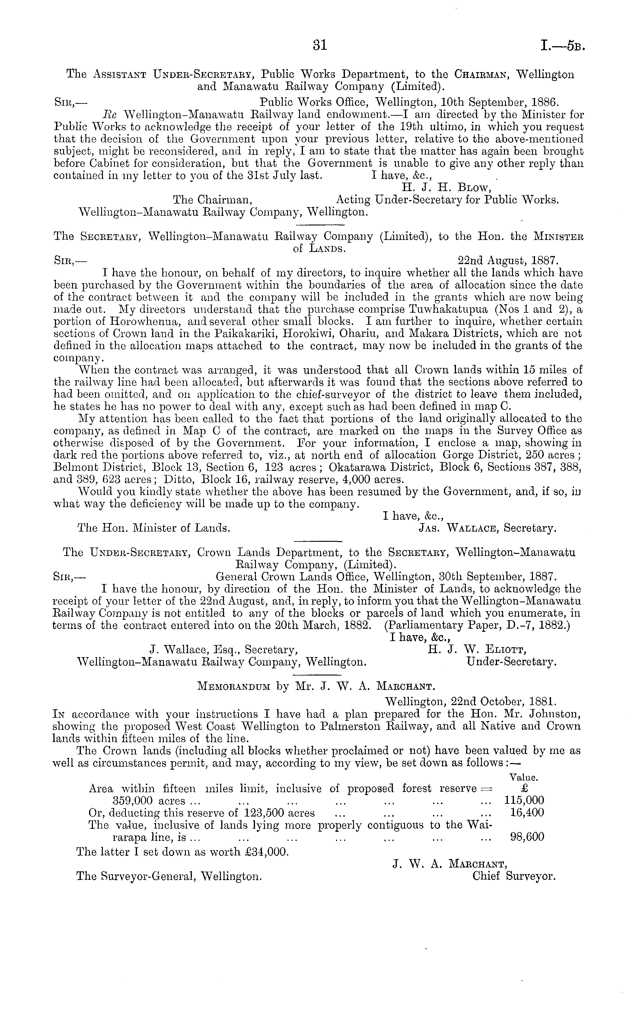 The Seceetaby, Wellington-Manawatu Railway Company (Limited), to the Hon. the Ministee of Lands. Sib,— 22nd August, 1887. I have the honour, on behalf of my directors, to inquire whether all the lands which have been purchased by the Government within the boundaries of the area of allocation since tho date of the contract between it and the company will be included in the grants which are now being made out. My directors understand that the purchase comprise Tuwhakatupua (Nos 1 and 2), a portion of Horowhenua, and several other small blocks. lam further to inquire, whether certain sections of Crown land in the Paikakariki, Horokiwi, Ohariu, and Makara Districts, which are not defined in the allocation maps attached to the contract, may now be included in the grants of the company. When the contract was arranged, it was understood that all Crown lands within 15 miles of the railway line had been allocated, but afterwards it was found that the sections above referred to had been omitted, and on application to the chief-surveyor of the district to leave them included, he states he has no power to deal with any, except such as had been defined in map C. My attention has been called to the fact that portions of the land originally allocated to the company, as defined in Map C of the contract, are marked on the maps in the Survey Office as otherwise disposed of by the Government. For your information, I enclose a map, showing in dark red the portions above referred to, viz., at north end of allocation Gorge District, 250 acres ; Bolmont District, Block 13, Section 6, 123 acres ; Okatarawa District, Block 6, Sections 387, 388, and 389, 623 acres; Ditto, Block 16, railway reserve, 4,000 acres. Would you kindly state whether the above has been resumed by the Government, and, if so, in what way the deficiency will be made up to the company. I have, &c, The Hon. Minister of Lands. Jas. Wallace, Secretary.