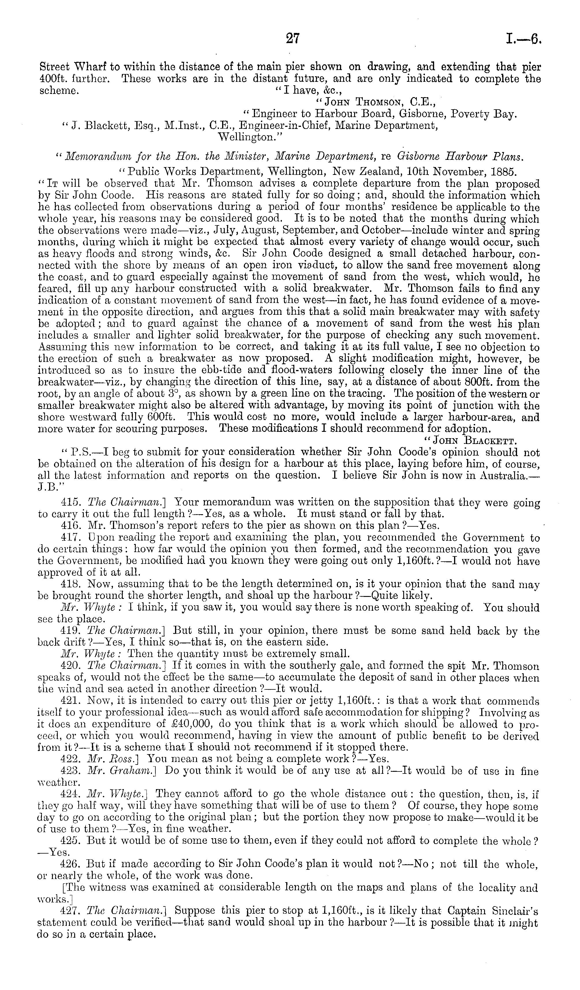 Street Wharf to within the distance of the main pier shown on drawing, and extending that pier 400ft. further. These works are in the distant future, and are only indicated to complete the scheme. "I have, &c., "John Thomson, C.E., " Engineer to Harbour Board, Gisborne, Poverty Bay. " J. Blackett, Esq., M.lnst., C.E., Engineer-in-Chief, Marine Department, Wellington." " Memorandum for the Hon. the Minister, Marine Department, re Gisborne Harbour Plans. "Public Works Department, Wellington, New Zealand, 10th November, 1885. "It will be observed that Mr. Thomson advises a complete departure from the plan proposed by Sir John Coode. His reasons are stated fully for so doing; and, should the information which he has collected from observations during a period of four months' residence be applicable to the whole year, his reasons may be considered good. It is to be noted that the months during which the observations were made—viz., July, August, September, and October—include winter and spring months, during which it might be expected that almost every variety of change would occur, such as heavy floods and strong winds, &c. Sir John Coode designed a small detached harbour, connected with the shore by moans of an open iron viaduct, to allow the sand free movement along the coast, and to guard especially against the movement of sand from the w 7est, which would, he feared, fill up any harbour constructed with a solid breakwater. Mr. Thomson fails to find any indication of a constant movement of sand from the west—in fact, he has found evidence of a movement in the opposite direction, and argues from this that a solid main breakwater may with safety be adopted; and to guard against the chance of a movement of sand from the west his plan includes a smaller and lighter solid breakwater, for the purpose of checking any such movement. Assuming this new information to be correct, and taking it at its full value, I see no objection to the erection of such a breakwater as now proposed. A slight modification might, however, be introduced so as to insure the ebb-tide and flood-waters following closely the inner line of the breakwater—viz., by changing the direction of this line, say, at a distance of about 800ft. from the root, by an angle of about 3°, as shown by a green line on the tracing. The position of the western or smaller breakwater might also be altered with advantage, by moving its point of junction with the shore westward fully 600ft. This would cost no more, would include a larger harbour-area, and more water for scouring purposes. These modifications I should recommend for adoption. "John Blackett. " P.S.—I beg to submit for your consideration whether Sir John Coode's opinion should not be obtained on the alteration of his design for a harbour at this place, laying before him, of course, all the latest information and reports on the question. I believe Sir John is now in Australia.— J.8." 415. The Chairman.] Your memorandum was written on the supposition that they were going to carry it out the full length ?—Yes, as a whole. It must stand or fall by that. 416. Mr. Thomson's report refers to the pier as shown on this plan ?—Yes. 417. Upon reading the report and examining the plan, you recommended the Government to do certain things: how far would the opinion you then formed, and the recommendation you gave the Government, be modified had you known they were going out only 1,160ft.? —I would not have approved of it at all. 418. Now, assuming that to be the length determined on, is it your opinion that the sand may be brought round the shorter length, and shoal up the harbour'?—Quite likely. Mr. Whyte : I think, if you saw it, you would say there is none worth speaking of. You should see the place. 419. The Chairman.] But still, in your opinion, there must be some sand held back by the back drift ?—Yes, I think so—that is, on the eastern side. Mr. Whyte : Then the quantity must be extremely small. 420. The Chairman.] If it comes in with the southerly gale, and formed the spit Mr. Thomson speaks of, would not the effect be the same—to accumulate the deposit of sand in other places when the wind and sea acted in another direction ?—lt would. 421. Now, it is intended to carry out this pier or jetty 1,160ft. : is that a work that commends itself to your professional idea—such as would afford safe accommodation for shipping? Involving as it docs an expenditure of £40,000, do you think that is a work which should be allowed to proceed, or which you would recommend, having in view the amount of public benefit to be derived from it? —It is a scheme that I should not recommend if it stopped there. 422. Mr. Boss.] You mean as not being a complete work ?—Yes. 423. Mr. Graham.] Do you think it would be of any use at all?—It would be of use in fine weather. 424. Mr. Whyte.] They cannot afford to go the whole distance out : the question, then, is, if they go half way, will they have something that will be of use to them ? Of course, they hope some day to go on according to the original plan ; but the portion they now propose to make—would it bo of use to them ? —Yes, in fine weather. 425. But it would be of some use to them, even if they could not afford to complete the whole ? —Yes. 426. But if made according to Sir John Coode's plan it would not ?—No ; not till the whole, or nearly the whole, of the work was done. [The witness was examined at considerable length on the maps and plans of the locality and works.] 427. The Chairman.] Suppose this pier to stop at 1,160ft., is it likely that Captain Sinclair's statement could be verified—that sand would shoal up in the harbour ?—lt is possible that it might do so in a certain place.