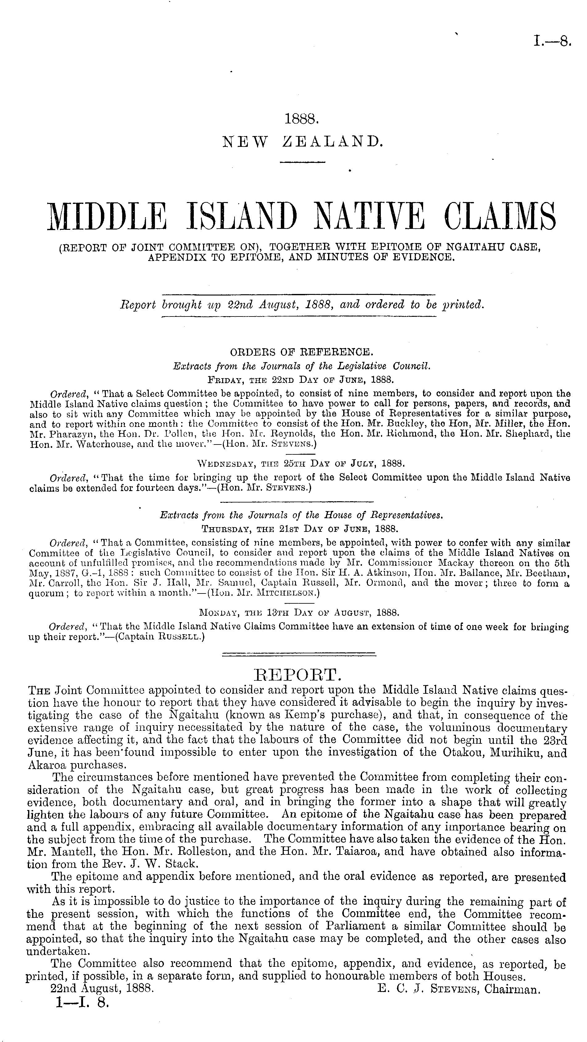 ORDERS OP REFERENCE. Extracts from the Journals of the Legislative Council. Friday, the 22nd Day of June, 1888. Ordered, " That a Select Committee be appointed, to consist of nine members, to consider and report upon tho Middle Island Native claims question ; the Committee to have power to call for persons, papers, and records, and also to sit with any Committee which may be appointed by the House of Representatives for a similar purpose, and to report within one month: the Committee to consist of the Hon. Mr. Buckley, the Hon, Mr. Miller, the Hon. Mr. Pharazyn, the Hon. Dr. Pollen, the Hon. Mr. Reynolds, the Hon. Mr. Richmond, the Hon. Mr. Shephard, the Hon. Mr. Waterhouse, and the mover."—(Hon, Mr. STEVENS.)