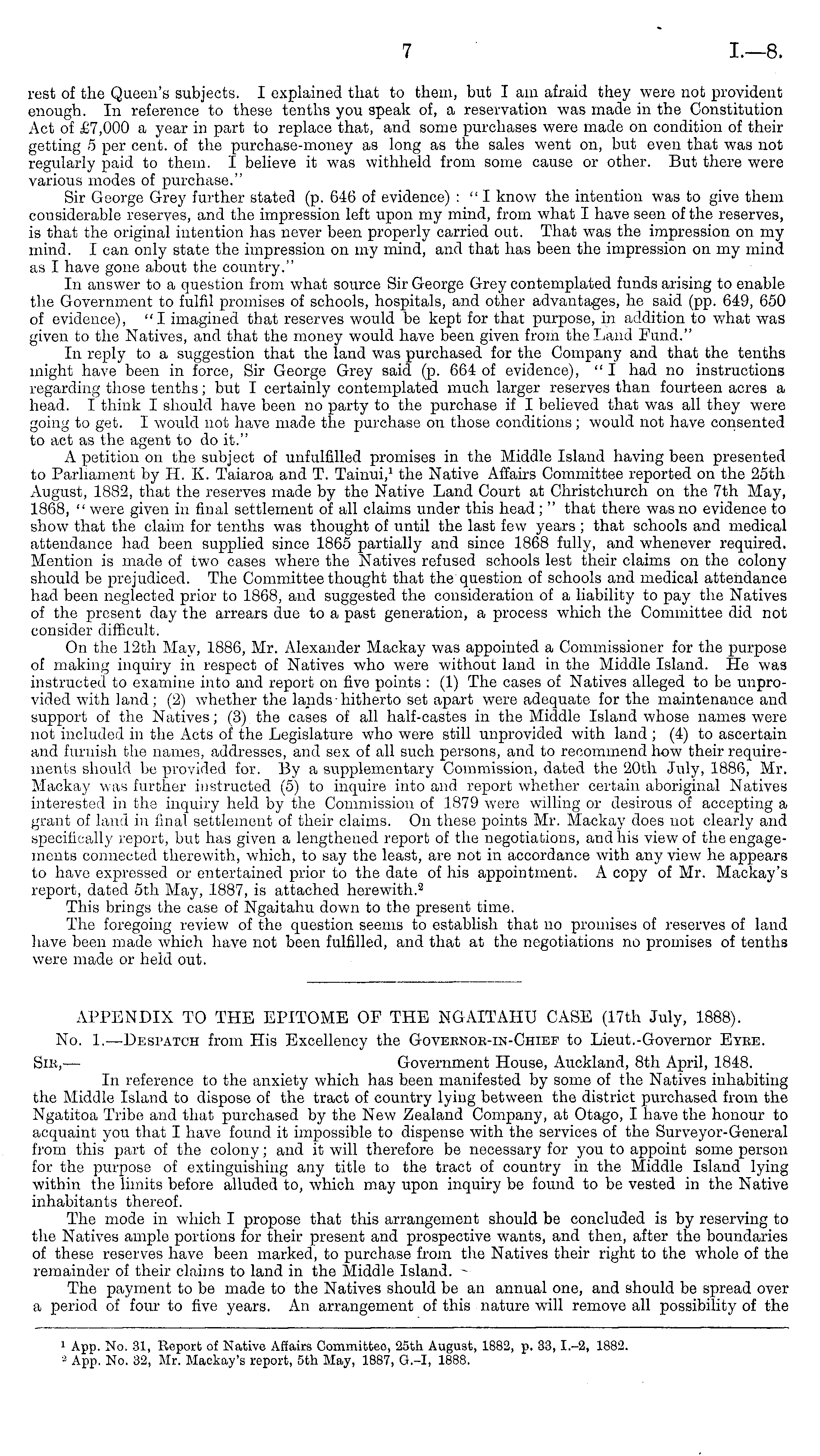 rest of the Queen's subjects. I explained that to them, but lam afraid they were not provident enough. In reference to these tenths you speak of, a reservation was made in the Constitution Act of £7,000 a year in part to replace that, and some purchases were made on condition of their getting 5 per cent, of the purchase-money as long as the sales went on, but even that was not regularly paid to them. I believe it was withheld from some cause or other. But there were various modes of purchase." Sir George Grey further stated (p. 646 of evidence) : " I know the intention was to give them considerable reserves, and the impression left upon my mind, from what I have seen of the reserves, is that the original intention has never been properly carried out. That was the impression on my mind. I can only state the impression on my mind, and that has been the impression on my mind as I have gone about the country." In answer to a question from what source Sir George Grey contemplated funds arising to enable the Government to fulfil promises of schools, hospitals, and other advantages, he said (pp. 649, 650 of evidence), "I imagined that reserves would be kept for that purpose, in addition to what was given to the Natives, and that the money would have been given from the Land Fund." In reply to a suggestion that the land was purchased for the Company and that the tenths might have been in force, Sir George Grey said (p. 664 of evidence), " I had no instructions regarding those tenths; but I certainly contemplated much larger reserves than fourteen acres a head. I think I should have been no party to the purchase if I believed that was all they were going to get. I would not have made the purchase on those conditions; would not have consented to act as the agent to do it." A petition on the subject of unfulfilled promises in the Middle Island having been presented to Parliament by H. K. Taiaroa and T. Tainui, 1 the Native Affairs Committee reported on the 25th August, 1882, that the reserves made by the Native Land Court at Christchurch on the 7th May, 1868, " were given in final settlement of all claims under this head; " that there was no evidence to show that the claim for tenths was thought of until the last few years ; that schools and medical attendance had been supplied since 1865 partially and since 1868 fully, and whenever required. Mention is made of two cases where the Natives refused schools lest their claims on the colony should be prejudiced. The Committee thought that the question of schools and medical attendance had been neglected prior to 1868, and suggested the consideration of a liability to pay the Natives of the present day the arrears due to a past generation, a process which the Committee did not consider difficult. On the 12th May, 1886, Mr. Alexander Mackay was appointed a Commissioner for the purpose of making inquiry in respect of Natives who w7ere without land in the Middle Island. He was instructed to examine into and report on five points : (1) The cases of Natives alleged to be unprovided with land ; (2) whether the lands ■ hitherto set apart were adequate for the maintenance and support of the Natives; (3) the cases of all half-castes in the Middle Island whose names were not included in the Acts of the Legislature wdio were still unprovided with land ; (4) to ascertain and furnish the names, addresses, and sex of all such persons, and to recommend how their requirements should .be provided for. By a supplementary Commission, dated the 20th July, 1886, Mr. Mackay was further instructed (5) to inquire into and report whether certain aboriginal Natives interested in the inquiry held by the Commission of 1879 were willing or desirous of accepting a grant of land in final settlement of their claims. On these points Mr. Mackay does not clearly and specifically report, but has given a lengthened report of the negotiations, and his view of the engagements connected therewith, which, to say the least, are not in accordance with any view he appears to have expressed or entertained prior to the date of his appointment. A copy of Mr. Mackay's report, dated sth May, 1887, is attached herewith. 3 This brings the case of Ngaitahu down to the present time. The foregoing review of the question seems to establish that no promises of reserves of land have been made which have not been fulfilled, and that at the negotiations no promises of tenths were made or held out.