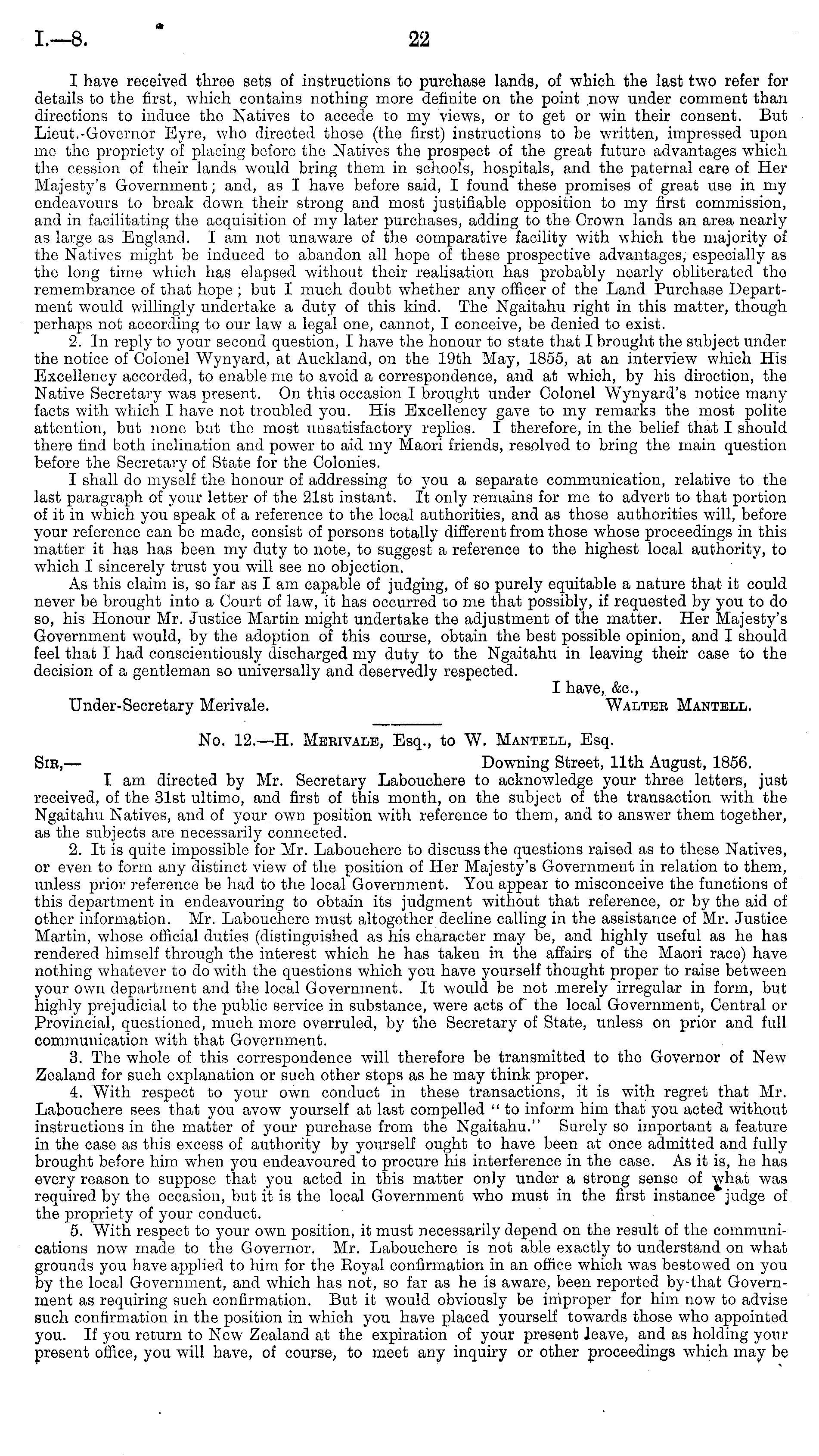 No. 12.—H. Merivale, Esq., to W. Mantell, Esq. Sir, — Downing Street, 11th August, 1856. I am directed by Mr. Secretary Labouchere to acknowledge your throe letters, just received, of the 31st ultimo, and first of this month, on the subject of the transaction with the Ngaitahu Natives, and of your own position with reference to them, and to answer them together, as the subjects are necessarily connected. 2. It is quite impossible for Mr. Labouchere to discuss the questions raised as to these Natives, or even to form any distinct view of the position of Her Majesty's Government in relation to them, unless prior reference be had to the local Government. You appear to misconceive the functions of this department in endeavouring to obtain its judgment without that reference, or by the aid of other information. Mr. Labouchere must altogether decline calling in the assistance of Mr. Justice Martin, whose official duties (distinguished as his character may be, and highly useful as he has rendered himself through the interest which he has taken in the affairs of the Maori race) have nothing whatever to do with the questions which you have yourself thought proper to raise between your own department and the local Government. It would be not merely irregular in form, but highly prejudicial to the public service in substance, were acts of the local Government, Central or Provincial, questioned, much more overruled, by the Secretary of State, unless on prior and full communication with that Government. 3. The whole of this correspondence will therefore be transmitted to the Governor of New Zealand for such explanation or such other steps as he may think proper. 4. With respect to your own conduct in these transactions, it is with regret that Mr. Labouchere sees that you avow yourself at last compelled " to inform him that you acted without instructions in the matter of your purchase from the Ngaitahu." Surely so important a feature in the case as this excess of authority by yourself ought to have been at once admitted and fully brought before him when you endeavoured to procure his interference in the case. As it is, he has every reason to suppose that you acted in this matter only under a strong sense of what was required by the occasion, but it is the local Government who must in the first instance judge of the propriety of your conduct. 5. With respect to your own position, it must necessarily depend on the result of the communications now made to the Governor. Mr. Labouchere is not able exactly to understand on what grounds you have applied to him for the Royal confirmation in an office which was bestowed on you by the local Government, and which has not, so far as he is aware, been reported by-that Government as requiring such confirmation. But it would obviously be improper for him now to advise such confirmation in the position in which you have placed yourself towards those who appointed you. If you return to New Zealand at the expiration of your present leave, and as holding your present office, you will have, of course, to meet any inquiry or other proceedings which may be