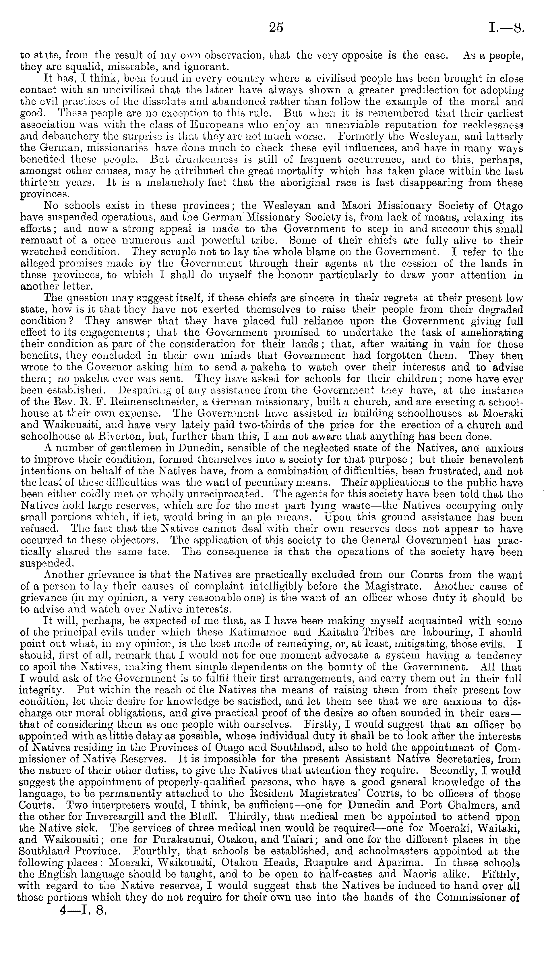 to stite, from the result of my own observation, that the very opposite is the case. As a people, they are squalid, miserable, and ignorant. It has, I think, been found in every country where a civilised people has been brought in close contact with an uncivilised that the latter have always shown a greater predilection for adopting the evil practices of the dissolute and abandoned rather than follow the example of the moral and good. These people are no exception to this rule. But when it is remembered that their earliest association was with the class of Europeans who enjoy an unenviable reputation for recklessness and debauchery the surprise is that they are not much worse. Formerly the Wesleyan, and latterly the German, missionaries have done much to check these evil influences, and have in many ways benefited these people. But drunkenness is still of frequent occurrence, and to this, perhaps, amongst other causes, may be attributed the great mortality which has taken place within the last thirteen years. It is a melancholy fact that the aboriginal race is fast disappearing from these provinces. No schools exist in these provinces; the Wesleyan and Maori Missionary Society of Otago have suspended operations, and the German Missionary Society is, from lack of means, relaxing its efforts; and now a strong appeal is made to the Government to step in and succour this small remnant of a once numerous and powerful tribe. Some of their chiefs are fully alive to their wretched condition. They scruple not to lay the whole blame on the Government. I refer to the alleged promises made by the Government through their agents at the cession of the lands in these provinces, to which I shall do myself the honour particularly to draw your attention in another letter. The question may suggest itself, if these chiefs are sincere in their regrets at their present low state, how is it that they have not exerted themselves to raise their people from their degraded condition ? They answer that they have placed full reliance upon the Government giving full effect to its engagements ; that the Government promised to undertake the task of ameliorating their condition as part of the consideration for their lands ; that, after waiting in vain for these benefits, they concluded in their own minds that Government had forgotten them. They then wrote to the Governor asking him to send a pakeha to watch over their interests and to advise them ; no pakeha ever was sent. They have asked for schools for their children ; none have ever been established. Despairing of any assistance from the Government they have, at the instance of the Rev. E. F. Eeimenschneider, a German missionary, built a church, and are erecting a schoolhouse at their own expense. The Government have assisted in building schoolhouses at Moeraki and Waikouaiti, and have very lately paid two-thirds of the price for the erection of a church and schoolhouse at Eiverton, but, further than this, I am not aware that anything has been done. A number of gentlemen in Dunedin, sensible of the neglected state of the Natives, and anxious to improve their condition, formed themselves into a society for that purpose ; but their benevolent intentions on behalf of the Natives have, from a combination of difficulties, been frustrated, and not the least of these difficulties was the want of pecuniary means. Their applications to the public have been either coldly met or wholly unreciprocated. The agents for this society have been told that the Natives hold large reserves, which are for the most part lying waste —the Natives occupying only small portions which, if let, would bring in ample means. Upon this ground assistance has been refused. The fact that the Natives cannot deal with their own reserves does not appear to have occurred to these objectors. The application of this society to the General Government has practically shared the same fate. The consequence is that the operations of the society have been suspended. Another grievance is that the Natives are practically excluded from our Courts from the want of a person to lay their causes of complaint intelligibly before the Magistrate. Another cause of grievance (in my opinion, a very reasonable one) is the want of an officer whose duty it should be to advise and watch over Native interests. It will, perhaps, be expected of me that, as I have been making myself acquainted with some of the principal evils under which these Katimamoe and Kaitahu Tribes are labouring, I should point out what, in my opinion, is the best mode of remedying, or, at least, mitigating, those evils. I should, first of all, remark that I would not for one moment advocate a system having a tendency to spoil the Natives, making them simple dependents on the bounty of the Government. All that I would ask of the Government is to fulfil their first arrangements, and carry them out in their full integrity. Put within the reach of the Natives the means of raising them from their present low condition, let their desire for knowledge be satisfied, and let them see that we are anxious to discharge our moral obligations, and give practical proof of the desire so often sounded in their ears— that of considering them as one people with ourselves. Firstly, I would suggest that an officer be appointed with as little delay as possible, whose individual duty it shall be to look after the interests of Natives residing in the Provinces of Otago and Southland, also to hold the appointment of Commissioner of Native Reserves. It is impossible for the present Assistant Native Secretaries, from the nature of their other duties, to give the Natives that attention they require. Secondly, I would suggest the appointment of properly-qualified persons, who have a good general knowledge of the language, to be permanently attached to the Resident Magistrates' Courts, to be officers of those Courts. Two interpreters would, I think, be sufficient—one for Dunedin and 
