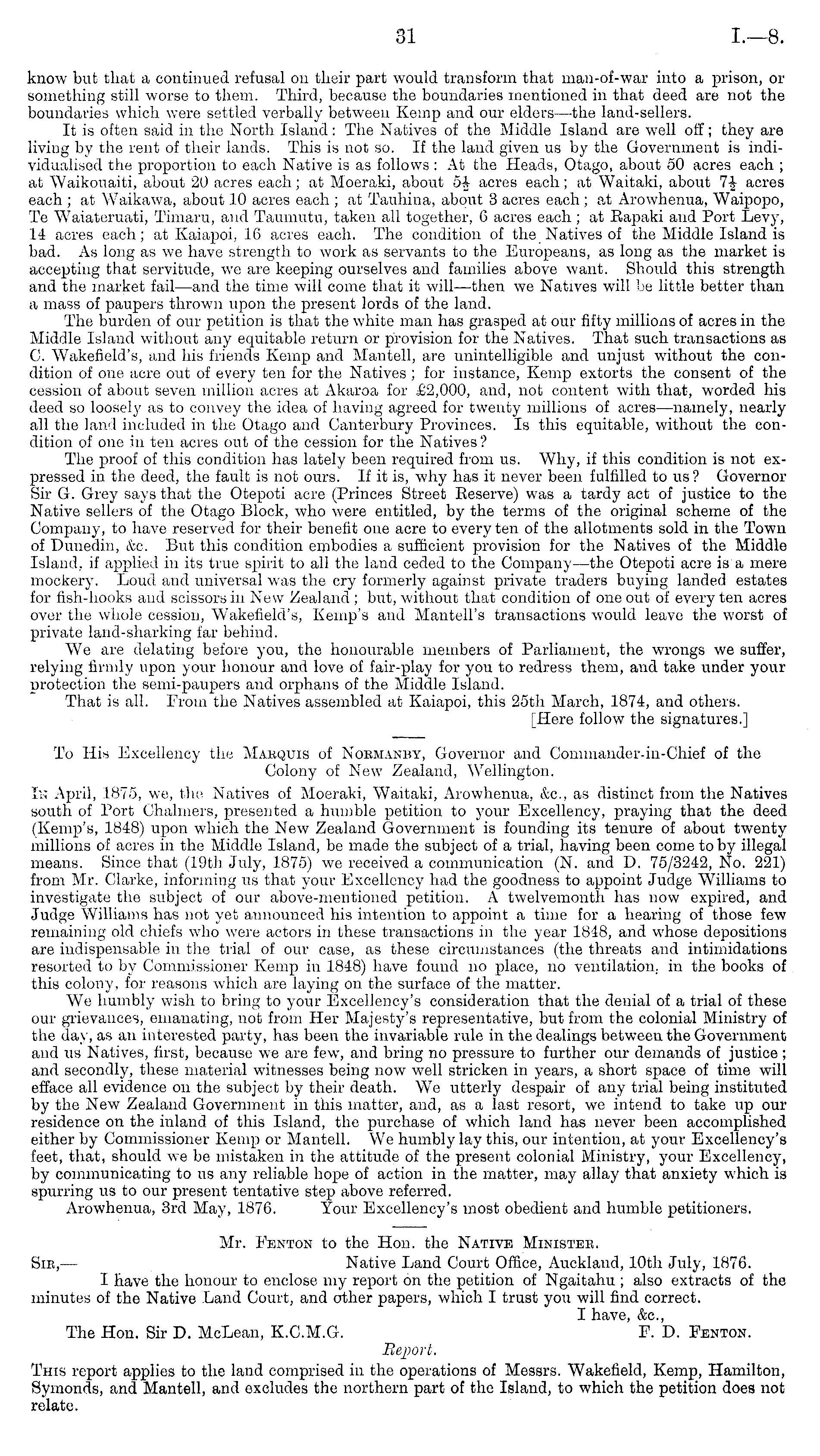 Mr. Fenton to the Hon. the Native Minister. Sir, — Native Land Court Office, Auckland, 10th July, 1876. I have the honour to enclose my report on the petition of Ngaitahu ; also extracts of the minutes of the Native Land Court, and other papers, which I trust you will find correct. I have, &c, The Hon. Sir D. McLean, K.C.M.G. F. D. Fenton. Report. This report applies to the land comprised in the operations of Messrs. Wakefield, Kemp, Hamilton, Symonds, and Mantell, and excludes the northern part of the Island, to which the petition does not relate.