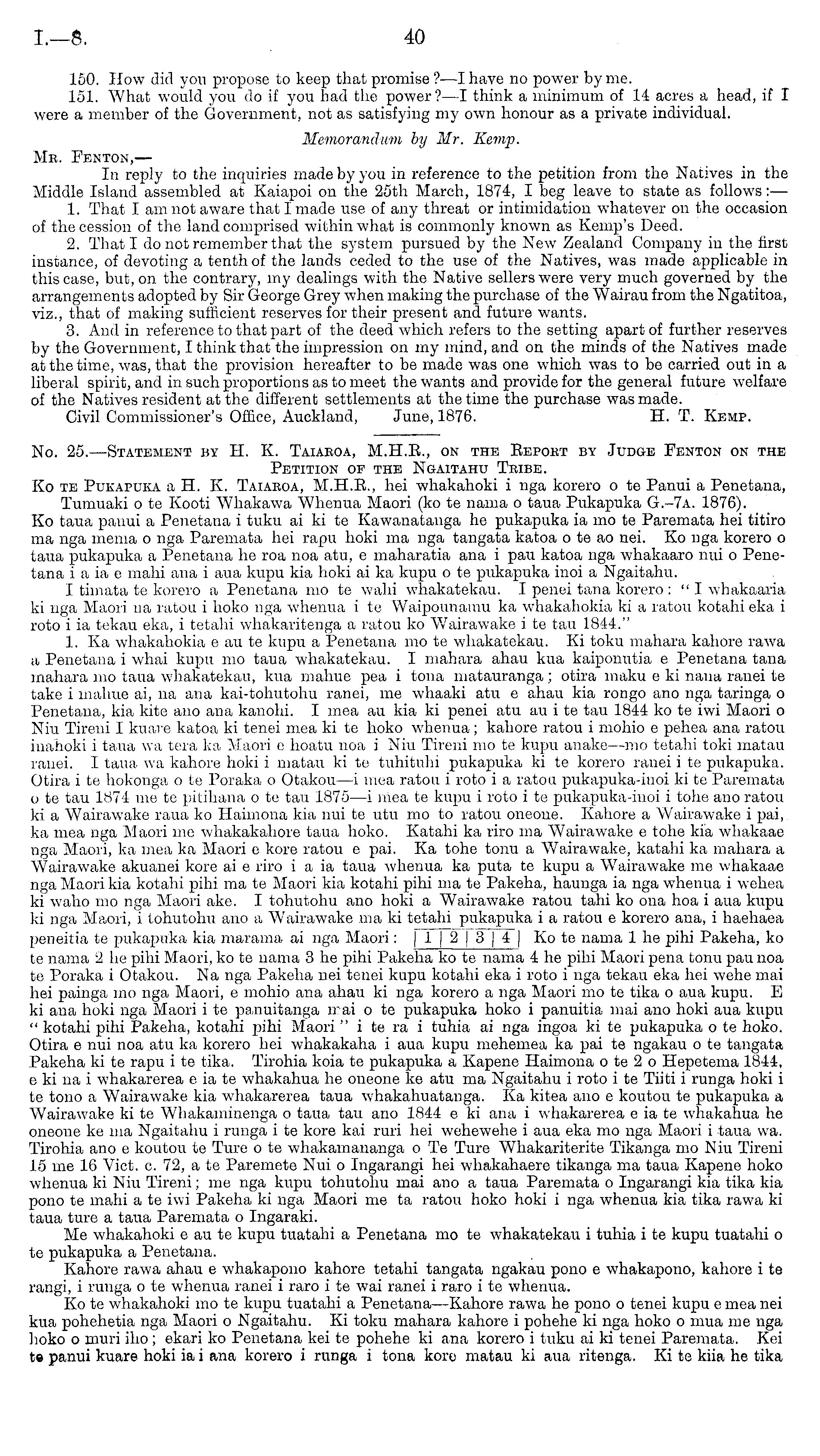 150. How did you propose to keep that promise ?—I have no power by me. 151. What would you do if you had the power?—l think a minimum of 14 acres a head, if I were a member of the Government, not as satisfying my own honour as a private individual. Memorandum by Mr. Kemp. Mr. Fenton, — In reply to the inquiries made by you in reference to the petition from the Natives in the Middle Island assembled at Kaiapoi on the 25th March, 1874, I beg leave to state as follows: — 1. That I am not aware that I made use of any threat or intimidation whatever on the occasion of the cession of the land comprised within what is commonly known as Kemp's Deed. 2. That I do not remember that the system pursued by the New Zealand Company in the first instance, of devoting a tenth of the lands ceded to the use of the Natives, was made applicable in this case, but, on the contrary, my dealings with the Native sellers were very much governed by the arrangements adopted by Sir George Grey when making the purchase of the Wairau from the Ngatitoa, viz., that of making sufficient reserves for their present and future wants. 3. And in reference to that part of the deed which refers to the setting apart of further reserves by the Government, I think that the impression on my mind, and on the minds of the Natives made at the time, was, that the provision hereafter to be made was one which was to be carried out in a liberal spirit, and in such proportions as to meet the wants and provide for the general future welfare of the Natives resident at the different settlements at the time the purchase was made. Civil Commissioner's Office, Auckland, June, 1876. H. T. Kemp.