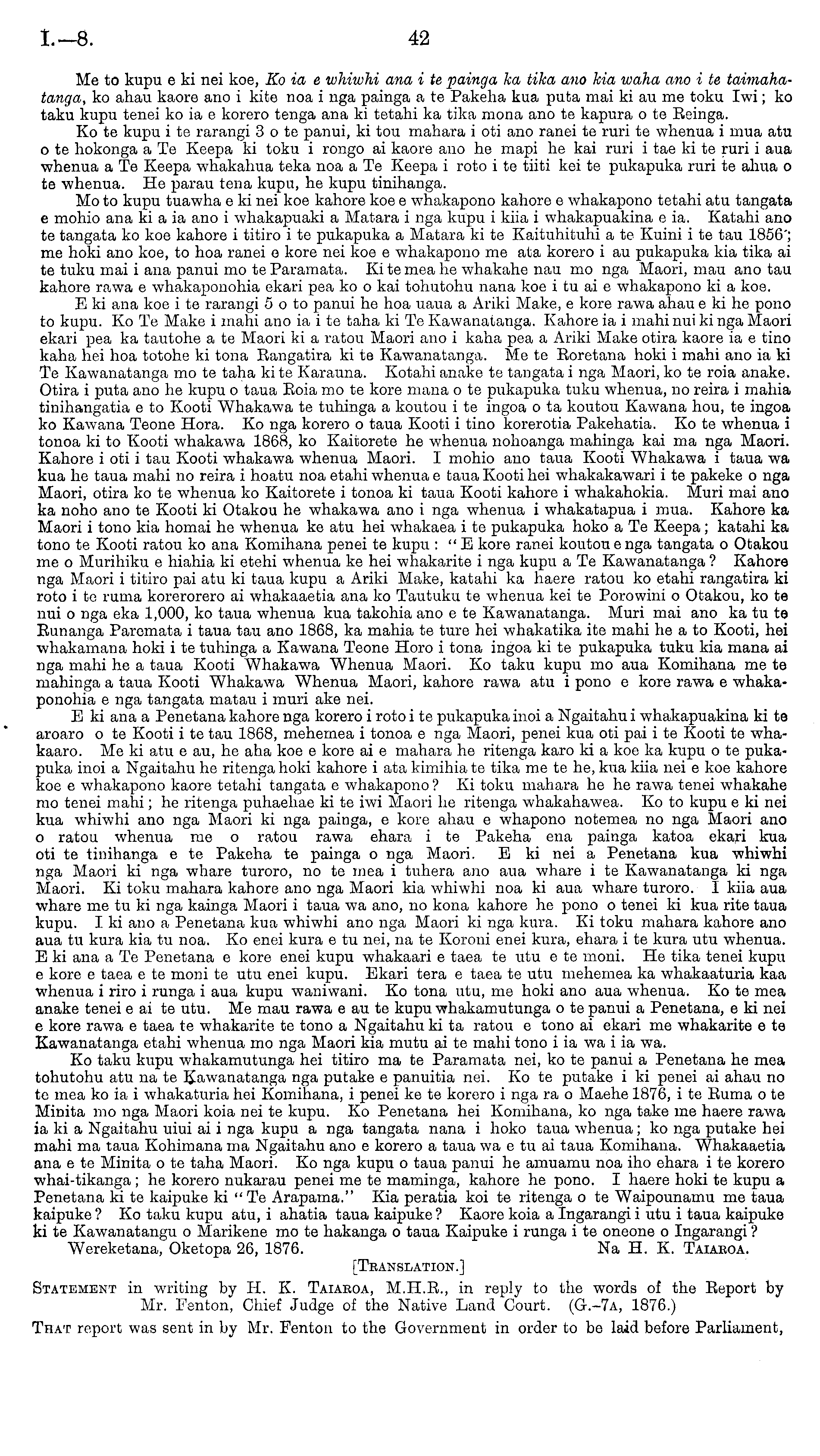 Me to kupu e ki nei koe, Ko ia e whiwhi ana i te painga ka tika ano kia ivaha ano i te taimahatanga, ko ahau kaore ano i kite noa i nga painga ate Pakeha kua puta mai ki au me toku Iwi; ko taku kupu tenei ko ia e korero tenga ana ki tetahi ka tika mona ano te kapura o te Eeinga. Ko te kupu i te rarangi 3 o te panui, ki tou mahara i oti ano ranei te ruri te whenua i mua atu o te hokonga a Te Keepa ki toku i rongo ai kaore ano he mapi he kai ruri i tae ki te ruri i aua whenua a Te Keepa whakahua teka noa a Te Keepa i roto i te tiiti kei te pukapuka ruri te ahua o te whenua. He parau tena kupu, he kupu tinihanga. Mo to kupu tuawha e ki nei koe kahore koe e whakapono kahore e whakapono tetahi atu tangata e mohio ana ki aia ano i whakapuaki a Matara i nga kupu i kiia i whakapuakina e ia. Katahi ano te tangata ko koe kahore i titiro i te pukapuka a Matara ki to Kaituhituhi a te Kuini i te tau 1856'; me hoki ano koe, to hoa ranei e kore nei koe e whakapono me ata korero i au pukapuka kia tika ai te tuku mai i ana panui mo te Paramata. Ki te mea he whakahe nau mo nga Maori, mau ano tau kahore rawa e whakaponohia ekari pea ko o kai tohutohu nana koe i tu ai e whakapono ki a koe. E ki ana koe i te rarangi 5 o to panui he hoa uaua a Ariki Make, e kore rawa ahau e ki he pono to kupu. Ko Te Make i mahi ano ia i te taha ki Te Kawanatanga. Kahore ia i mahi nui ki nga Maori ekari pea ka tautohe a te Maori ki a ratou Maori ano i kaha pea a Ariki Make otira kaore ia e tino kaha hei hoa totohe ki tona Eangatira ki te Kawanatanga. Me te Eoretana hoki i mahi ano ia ki Te Kawanatanga mo te taha ki te Karauna. Kotahi anake te tangata i nga Maori, ko te roia anake. Otira i puta ano he kupu o taua Eoia mo te kore mana o te pukapuka tuku whenua, no reira i mahia tinihangatia e to Kooti Whakawa te tuhinga a koutou i te ingoa o ta koutou Kawana hou, te ingoa ko Kawana Teone Hora. Ko nga korero o taua Kooti i tino korerotia Pakehatia. Ko te whenua i tonoa ki to Kooti whakawa 1868, ko Kaitorete he whenua nohoanga mahinga kai ma nga Maori. Kahore i oti i tau Kooti whakawa whenua Maori. I mohio ano taua Kooti Whakawa i taua wa kua he taua mahi no reira i hoatu noa etahi whenua e taua Kooti hei whakakawari i te pakeke o nga Maori, otira ko te whenua ko Kaitorete i tonoa ki taua Kooti kahore i whakahokia. Muri mai ano ka noho ano te Kooti ki Otakou he whakawa ano i nga whenua i whakatapua i mua. Kahore ka Maori i tono kia homai he whenua ke atu hei whakaea ite pukapuka hoko aTe Keepa; katahi ka tono te Kooti ratou ko ana Komihana penei te kupu : " E kore ranei koutou e nga tangata o Otakou me o Murihiku e hiahia ki etehi whenua ke hei whakarite i nga kupu aTe Kawanatanga ? Kahore nga Maori i titiro pai atu ki taua kupu a Ariki Make, katahi ka haere ratou ko etahi rangatira ki roto i te ruma korerorero ai whakaaetia ana ko Tautuku te whenua kei te Porowini o Otakou, ko te nui o nga eka 1,000, ko taua whenua kua takohia ano ete Kawanatanga. Muri mai ano ka tu te Eunanga Paremata i taua tau ano 1868, ka mahia te ture hei whakatika ite mahi he a to Kooti, hei whakamana hoki i te tuhinga a Kawana Teone Horo i tona ingoa ki te pukapuka tuku kia mana ai nga mahi he a taua Kooti Whakawa Whenua Maori. Ko taku kupu mo aua Komihana me te mahinga a taua Kooti Whakawa Whenua Maori, kahore rawa atu i pono e kore rawa e whakaponohia e nga tangata matau i muri ake nei. E ki ana a Penetana kahore nga korero i roto i te pukapuka inoi a Ngaitahu i whakapuakina ki te aroaro o te Kooti i te tau 1868, mehemea i tonoa e nga Maori, penei kua oti pai i te Kooti te whakaaro. Me ki atu e au, he aha koe e kore ai e mahara he ritenga karo ki a koe ka kupu ote pukapuka inoi a Ngaitahu he ritenga hoki kahore i ata kimihiate tika me te he, kua kiia nei e koe kahore koe e whakapono kaore tetahi tangata e whakapono ? Ki toku mahara he he rawa tenei whakahe mo tenei mahi; he ritenga puhaehae ki te iwi Maori he ritenga whakahawea. Ko to kupu eki nei kua whiwhi ano nga Maori ki nga painga, e kore ahau e whapono notemea no nga Maori ano o ratou whenua me o ratou rawa ehara i te Pakeha ena painga katoa ekari kua oti te tinihanga ete Pakeha te painga o nga Maori. E ki nei a Penetana kua whiwhi nga Maori ki nga whare turoro, no te mea i tuhera ano aua whare i te Kawanatanga ki nga Maori. Ki toku mahara kahore ano nga Maori kia whiwhi noa ki aua whare turoro. 1 kiia aua whare me tu ki nga kainga Maori i taua wa ano, no kona kahore he pono o tenei ki kua rite taua kupu. Iki ano a Penetana kua whiwhi ano nga Maori ki nga kura. Ki toku mahara kahore ano aua tu kura kia tu noa. Ko enei kura etu nei, na te Koroni enei kura, ehara ite kura utu whenua. Eki ana aTe Penetana e kore enei kupu whakaari e taea te utu ete moni. He tika tenei kupu e kore e taea ete moni te utu enei kupu. Ekari tera e taea te utu mehemea ka whakaaturia kaa whenua i riro i runga i aua kupu waniwani. Ko tona utu, me hoki ano aua whenua. Ko te mea anake tenei eai te utu. Me mau rawa eau te kupu whakamutunga ote panui a Penetana, eki nei e kore rawa e taea te whakarite te tono a Ngaitahu ki ta ratou e tono ai ekari me whakarite e te Kawanatanga etahi whenua mo nga Maori kia mutu ai te mahi tono i ia wa i ia wa. Ko taku kupu whakamutunga hei titiro ma te Paramata nei, ko te panui a Penetana he mea tohutohu atu na te Kawanatanga nga putake e panuitia nei. Ko te putake iki penei ai ahau no te mea ko ia i whakaturia hei Komihana, i penei ke te korero i nga ra o Maehe 1876, i te Euma o te Minita mo nga Maori koia nei te kupu. Ko Penetana hei Komihana, ko nga take me haere rawa ia ki a Ngaitahu uiui ai i nga kupu a nga tangata nana i hoko taua whenua; ko nga putake hei mahi ma taua Kohimana ma Ngaitahu ano e korero a taua wa etu ai taua Komihana. Whakaaetia ana ete Minita ote taha Maori. Ko nga kupu o taua panui he amuamu noa iho ehara ite korero whai-tikanga; he korero nukarau penei me te mamiuga, kahore he pono. I haere hoki te kupu a Penetana ki te kaipuke ki "Te Arapama." Kia peratia koi te ritenga 