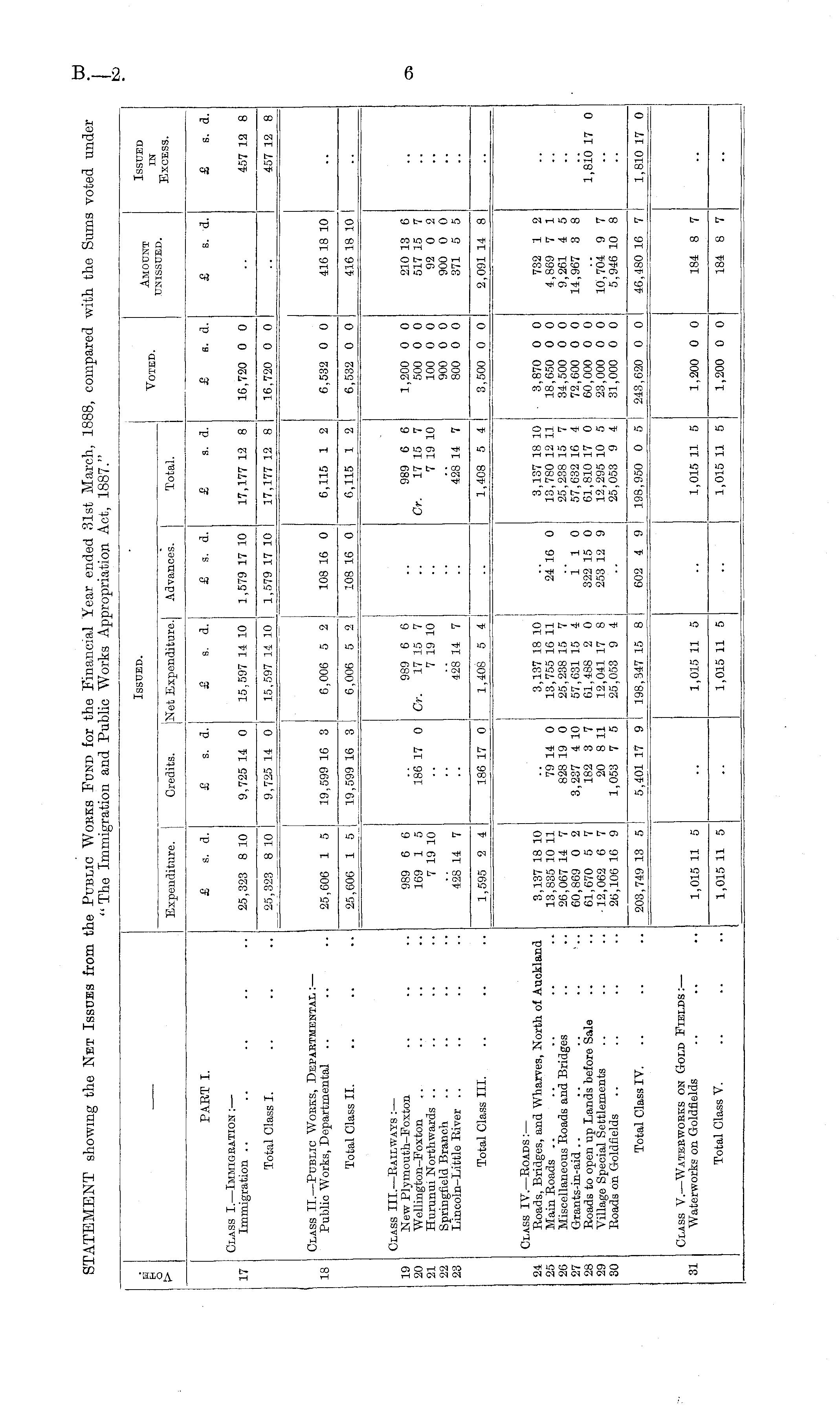 STATEMENT showing the Net Issues from the Public Works Fund for the Financial Year ended 31st March, 1888, compared with the Sums voted under "The Immigration and Public Works Appropriation Act, 1887."