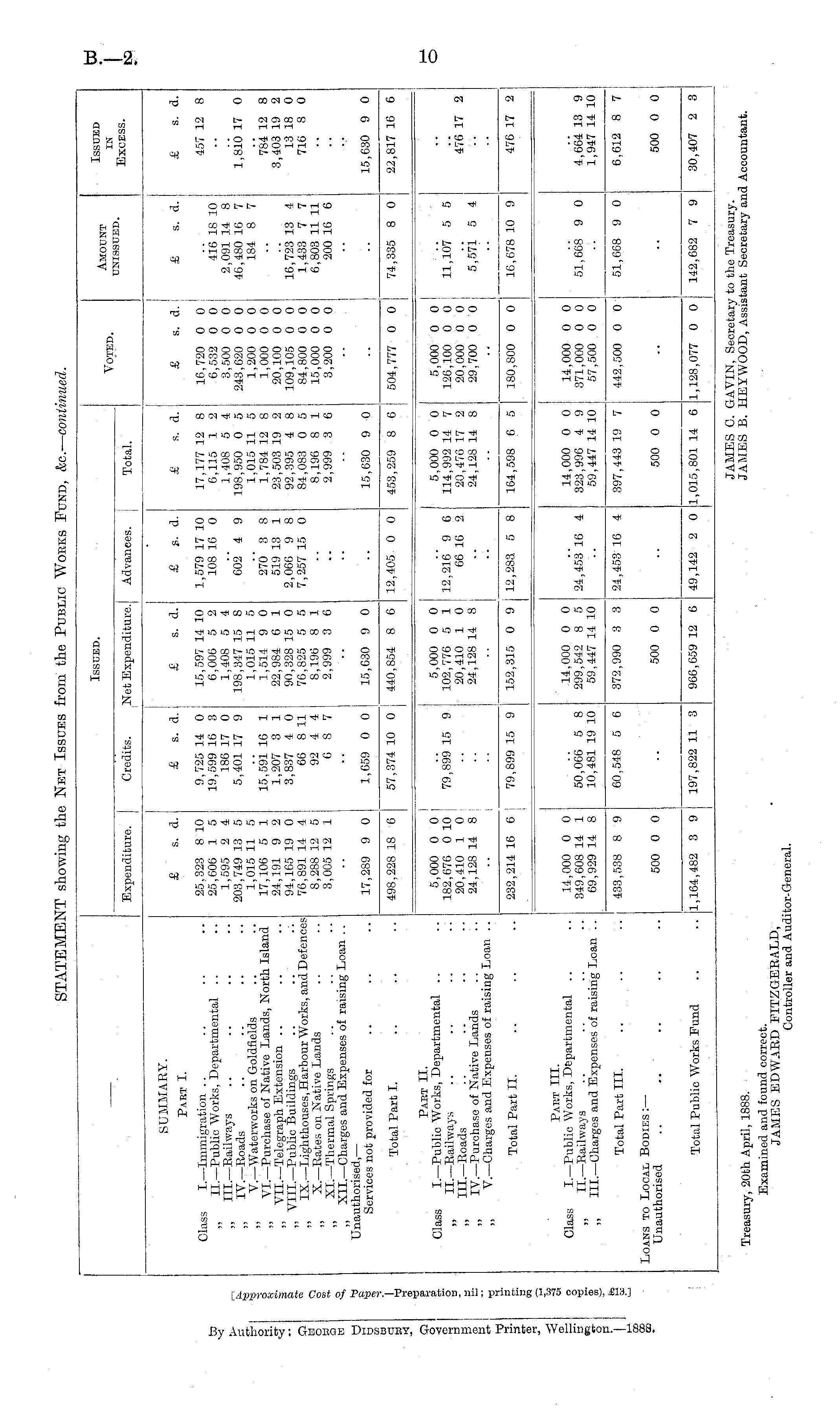 JAMES 0. GAVIN, Secretary to the Treasury. Treasury, 20th April, 1888. JAMES B. HEYWOOD, Assistant Secretary and Accountant. Examined and found correct. JAMES EDWARD FITZGEEALD, Controller and Auditor-General.