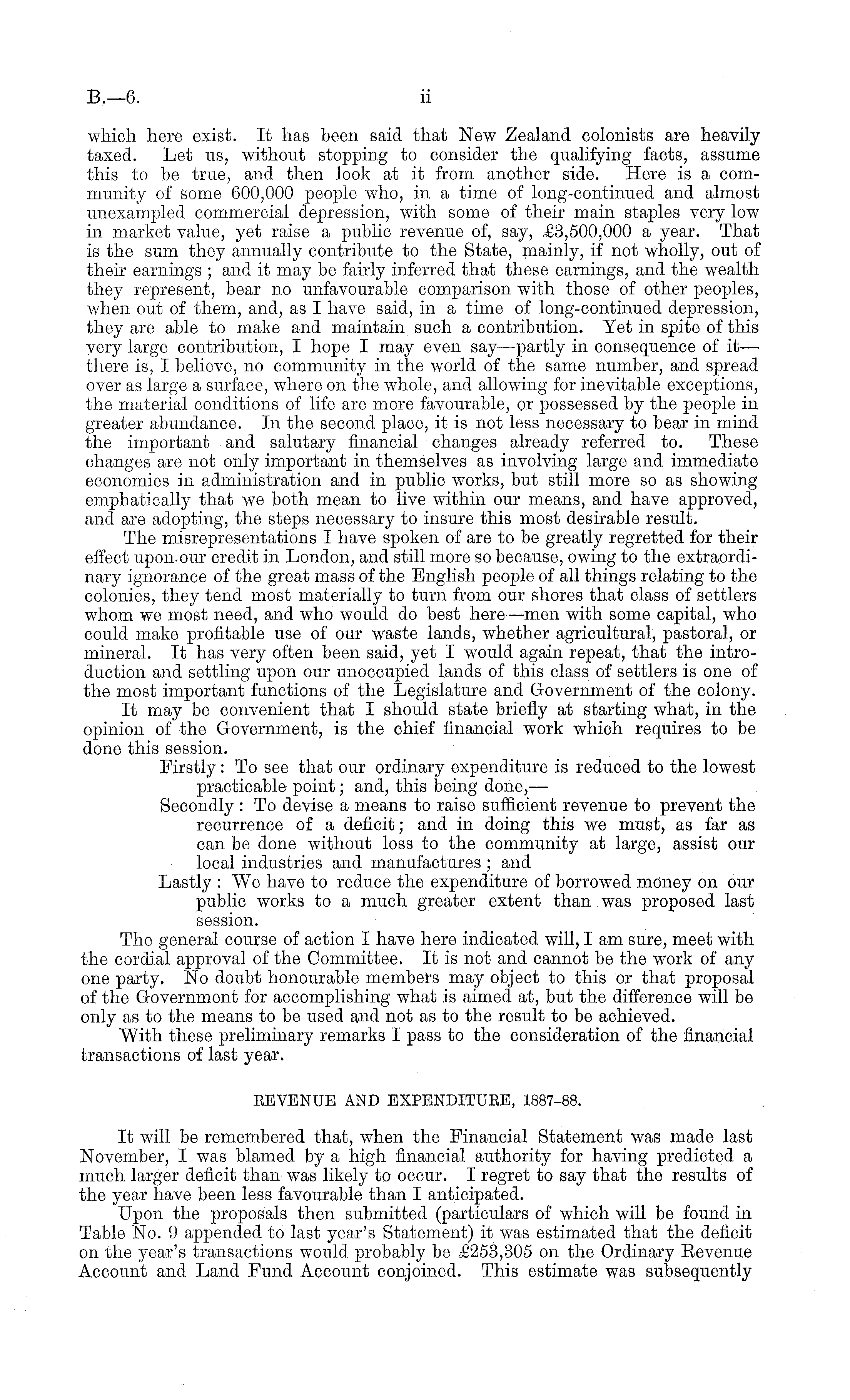 which here exist. It has been said that New Zealand colonists are heavily taxed. Let us, without stopping to consider the qualifying facts, assume this to be true, and then look at it from another side. Here is a community of some 600,000 people who, in a time of long-continued and almost unexampled commercial depression, with some of their main staples very low in market value, yet raise a public revenue of, say, ,£3,500,000 a year. That is the sum they annually contribute to the State, mainly, if not wholly, out of their earnings ; and it may be fairly inferred that these earnings, and the wealth they represent, bear no unfavourable comparison with those of other peoples, when out of them, and, as I have said, in a time of long-continued depression, they are able to make and maintain such a contribution. Tet in spite of this very large contribution, I hope I may even say—partly in consequence of it— there is, I believe, no community in the world of the same number, and spread over as large a surface, where on the whole, and allowing for inevitable exceptions, the material conditions of life are more favourable, or possessed by the people in greater abundance. In the second place, it is not less necessary to bear in mind the important and salutary financial changes already referred to. These changes are not only important in themselves as involving large and immediate economies in administration and in public works, but still more so as showing emphatically that we both mean to live within our means, and have approved, and are adopting, the steps necessary to insure this most desirable result. The misrepresentations I have spoken of are to be greatly regretted for their effect upon-our credit in London, and still more so because, owing to the extraordinary ignorance of the great mass of the English people of all things relating to the colonies, they tend most materially to turn from our shores that class of settlers whom we most need, and who would do best here —men with some capital, who could make profitable use of our waste lands, whether agricultural, pastoral, or mineral. It has very often been said, yet I would again repeat, that the introduction and settling upon our unoccupied lands of this class of settlers is one of the most important functions of the Legislature and Government of the colony. It may be convenient that I should state briefly at starting what, in the opinion of the Government, is the chief financial work which requires to be done this session. Firstly: To see that our ordinary expenditure is reduced to the lowest practicable point; and, this being done, —- Secondly : To devise a means to raise sufficient revenue to prevent the recurrence of a deficit; and in doing this we must, as far as can be done without loss to the community at large, assist our local industries and manufactures ; and Lastly : We have to reduce the expenditure of borrowed money on our public works to a much greater extent than was proposed last session. The general course of action I have here indicated will, I am sure, meet with the cordial approval of the Committee. It is not and cannot be the work of any one party. No doubt honourable members may object to this or that proposal of the Government for accomplishing what is aimed at, but the difference will be only as to the means to be used and not as to the result to be achieved. With these preliminary remarks I pass to the consideration of the financial transactions of last year. EEVENUE AND EXPENDITUBE, 1887-88. It will be remembered that, when the Financial Statement was made last November, I was blamed by a high financial authority for having predicted a much larger deficit than was likely to occur. I regret to say that the results of the year have been less favourable than I anticipated. Upon the proposals then submitted (particulars of which will be found in Table No. 9 appended to last year's Statement) it was estimated that the deficit on the year's transactions would probably be £253,305 on the Ordinary Revenue Account and Land Fund Account conjoined. This estimate was subsequently