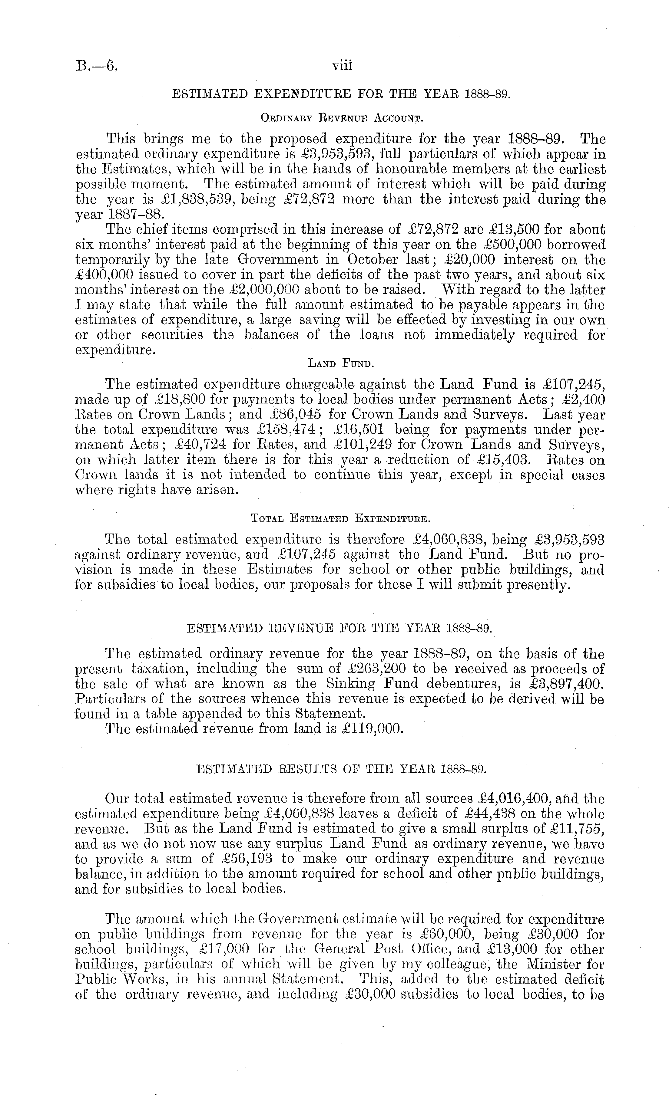 ESTIMATED EXPENDITUBE FOB THE YEAE 1888-89. Ordinary Bevenue Account. This brings me to the proposed expenditure for the year 1888-89. The estimated ordinary expenditure is £3,953,593, full particulars of which appear in the Estimates, which will be in the hands of honourable members at the earliest possible moment. The estimated amount of interest which will be paid during the year is £1,838,539, being £72,872 more than the interest paid during the year 1887-88. The chief items comprised in this increase of £72,872 are £13,500 for about six months' interest paid at the beginning of this year on the £500,000 borrowed temporarily by the late Government in October last; £20,000 interest on the £400,000 issued to cover in part the deficits of the past two years, and about six months' interest on the £2,000,000 about to be raised. With regard to the latter I may state that while the full amount estimated to be payable appears in the estimates of expenditure, a large saving will be effected by investing in our own or other securities the balances of the loans not immediately required for expenditure. Land Fund. The estimated expenditure chargeable against the Land Fund is £107,245, made up of £18,800 for payments to local bodies under permanent Acts; £2,400 Rates on Crown Lands; and £86,045 for Crown Lands and Surveys. Last year the total expenditure was £158,474; £16,501 being for payments under permanent Acts; £40,724 for Rates, and £101,249 for Crown Lands and Surveys, on which latter item there is for this year a reduction of £15,403. Rates on Crown lands it is not intended to continue this year, except in special cases where rights have arisen. Total Estimated Expenditure. The total estimated expenditure is therefore £4,060,838, being £3,953,593 against ordinary revenue, and £107,245 against the Land Fund. But no provision is made in these Estimates for school or other public buildings, and for subsidies to local bodies, our proposals for these I will submit presently. ESTIMATED BEVENUE FOB THE YEAB 1888-89. The estimated ordinary revenue for the year 1888-89, on the basis of the present taxation, including the sum of £263,200 to be received as proceeds of the sale of what are known as the Sinking Fund debentures, is £3,897,400. Particulars of the sources whence this revenue is expected to be derived will be found in a table appended to this Statement. The estimated revenue from land is £119,000. ESTIMATED BESULTS OF THE YEAB 1888-89. Our total estimated revenue is therefore from all sources £4,016,400, and the estimated expenditure being £4,060,838 leaves a deficit of £44,438 on the whole revenue. But as the Land Fund is estimated to give a small surplus of £11,755, and as we do not now use any surplus Land Fund as ordinary revenue, we have to provide a sum of £56,193 to make our ordinary expenditure and revenue balance, in addition to the amount required for school and other public buildings, and for subsidies to local bodies. The amount which the Government estimate will be required for expenditure on public buildings from revenue for the year is £60,000, being £30,000 for school buildings, £17,000 for the General Post Office, and £13^000 for other buildings, particulars of which will be given by my colleague, the Minister for Public Works, in his annual Statement. This, added to the estimated deficit of the ordinary revenue, and including £30,000 subsidies to local bodies, to be