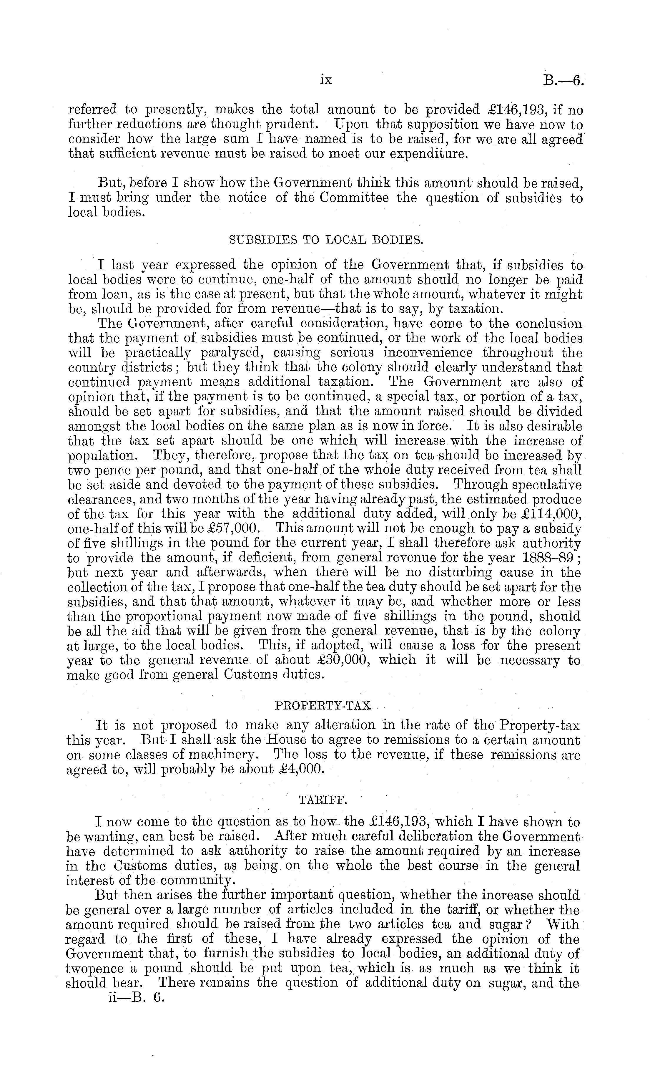 referred to presently, makes the total amount to be provided £146,193, if no further reductions are thought prudent. Upon that supposition we have now to consider how the large sum I have named is to be raised, for we are all agreed that sufficient revenue must be raised to meet our expenditure. But, before I show how the Government think this amount should be raised, I must bring under the notice of the Committee the question of subsidies to local bodies. SUBSIDIES TO LOCAL BODIES. I last year expressed the opinion of the Government that, if subsidies to local bodies were to continue, one-half of the amount should no longer be paid from loan, as is the case at present, but that the whole amount, whatever it might be, should be provided for from revenue —that is to say, by taxation. The Government, after careful consideration, have come to the conclusion that the payment of subsidies must be continued, or the work of the local bodies will be practically paralysed, causing serious inconvenience throughout the country districts; but they think that the colony should clearly understand that continued payment means additional taxation. The Government are also of opinion that, if the payment is to be continued, a special tax, or portion of a tax, should be set apart for subsidies, and that the amount raised should be divided amongst the local bodies on the same plan as is now in force. It is also desirable that the tax set apart should be one which will increase with the increase of population. They, therefore, propose that the tax on tea should be increased by two pence per pound, and that one-half of the whole duty received from tea shall be set aside and devoted to the payment of these subsidies. Through speculative clearances, and two months of the year having already past, the estimated produce of the tax for this year with the additional duty added, will only be £114,000, one-half of this will be £57,000. This amount will not be enough to pay a subsidy of five shillings in the pound for the current year, I shall therefore ask authority to provide the amount, if deficient, from general revenue for the year 1888-89 ; but next year and afterwards, when there will be no disturbing cause in the collection of the tax, I propose that one-half the tea duty should be set apart for the subsidies, and that that amount, whatever it may be, and whether more or less than the proportional payment now made of five shillings in the pound, should be all the aid that will be given from the general revenue, that is by the colony at large, to the local bodies. This, if adopted, will cause a loss for the present year to the general revenue of about £30,000, which it will be necessary to make good from general Customs duties. PEOPEBTY-TAX It is not proposed to make any alteration in the rate of the Property-tax this year. But I shall ask the House to agree to remissions to a certain amount on some classes of machinery. The loss to the revenue, if these remissions are agreed to, will probably be about £4,000. TABIFF. I now come to the question as to how_the £146,193, which I have shown to be wanting, can best be raised. After much careful deliberation the Government have determined to ask authority to raise the amount required by an increase in the Customs duties, as being on the whole the best course in the general interest of the community. But then arises the further important question, whether the increase should be general over a large number of articles included in the tariff, or whether the amount required should be raised from the two articles tea and sugar ? With regard to the first of these, I have already expressed the opinion of the Government that, to furnish the subsidies to local bodies, an additional duty of twopence a pound should be put upon tea, which is as much as we think it should bear. There remains the question of additional duty on sugar, and the ii—B. 6.
