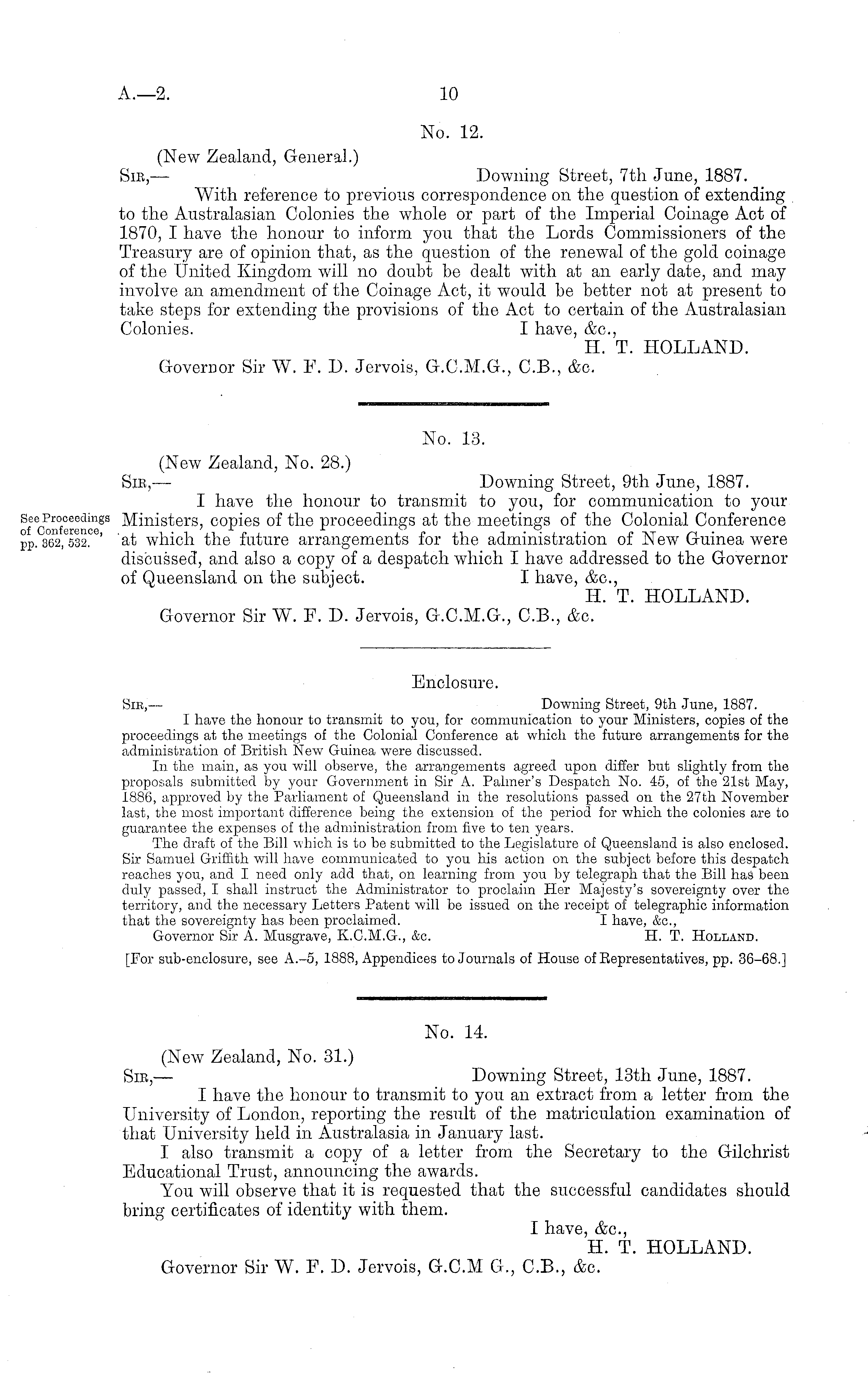 No. 13. (New Zealand, No. 28.) Sir,— Downing Street, 9th June, 1887. I have the honour to transmit to you, for communication to your Ministers, copies of the proceedings at the meetings of the Colonial Conference at which the future arrangements for the administration of New Guinea were discussed, and also a copy of a despatch which I have addressed to the Governor of Queensland on the subject. I have, &c, H. T. HOLLAND. Governor Sir W. F. D. Jervois, G.C.M.G., C.8., &c.
