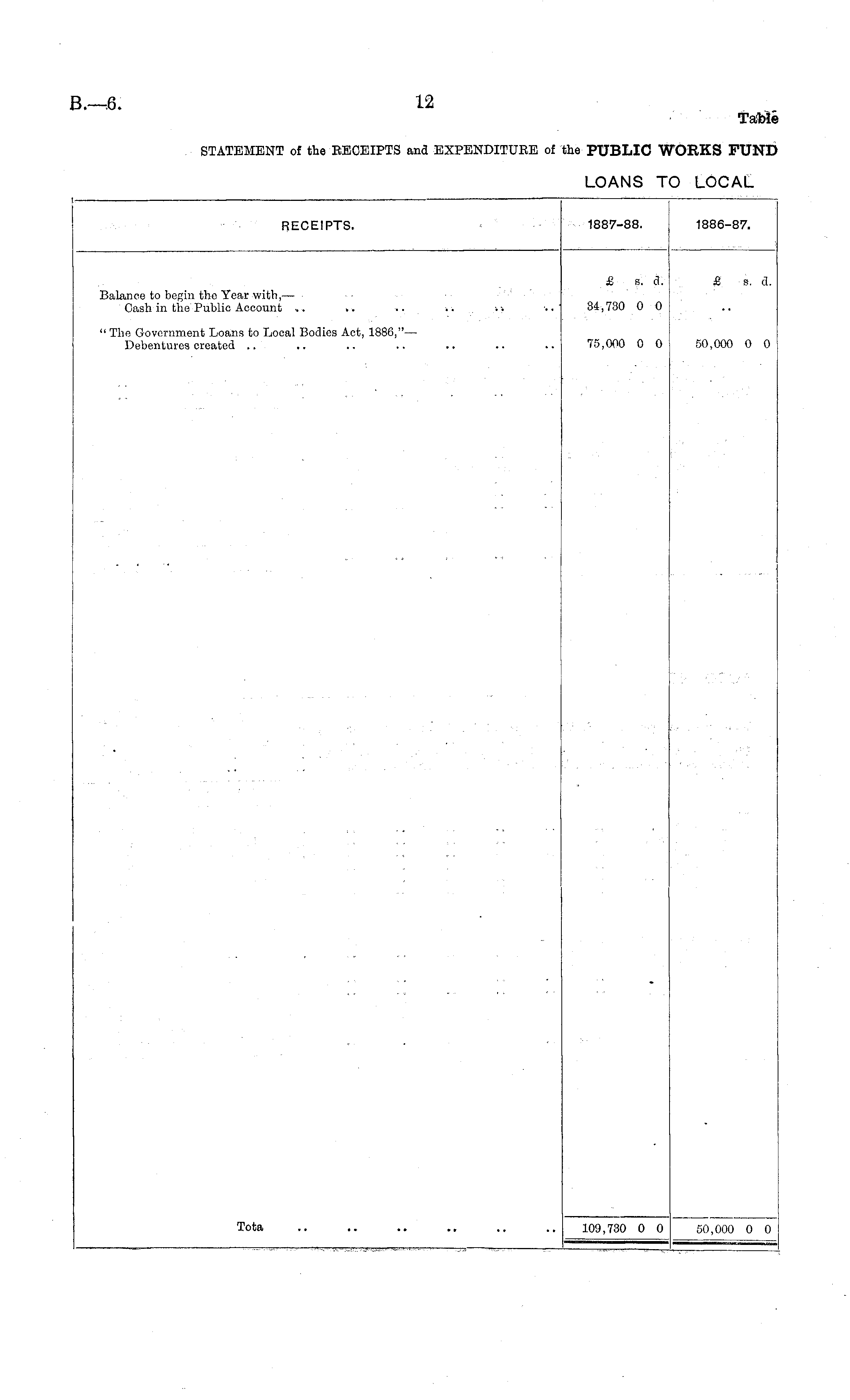 RECEIPTS. 1887-88. 1886-87. £ s. <r. £ s. d. Balance to begin tho Year with, — Cash in the Public Account 34,730 0 0 " The Government Loans to Local Bodies Act, 1886," — Debentures created 75,000 0 0 50,000 0 0 Tota 109,730 0 0 50,000 0 0