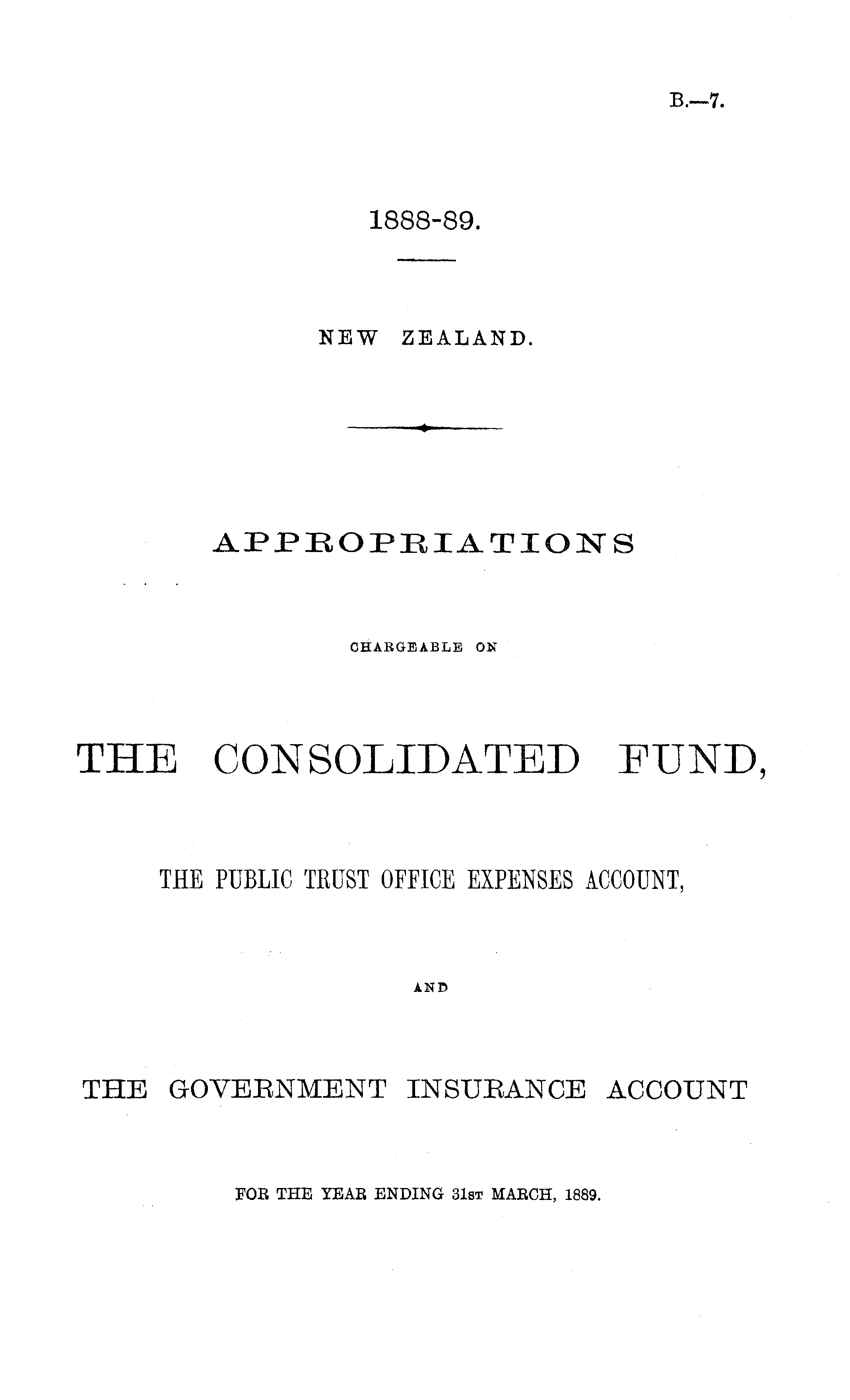 APPROPRIATIONS CHARGEABLE ON THE CONSOLIDATED FUND, THE PUBLIC TRUST OFFICE EXPENSES ACCOUNT, AND THE GOVERNMENT INSURANCE ACCOUNT FOR THE YEAR ENDING 31st MARCH, 1889.