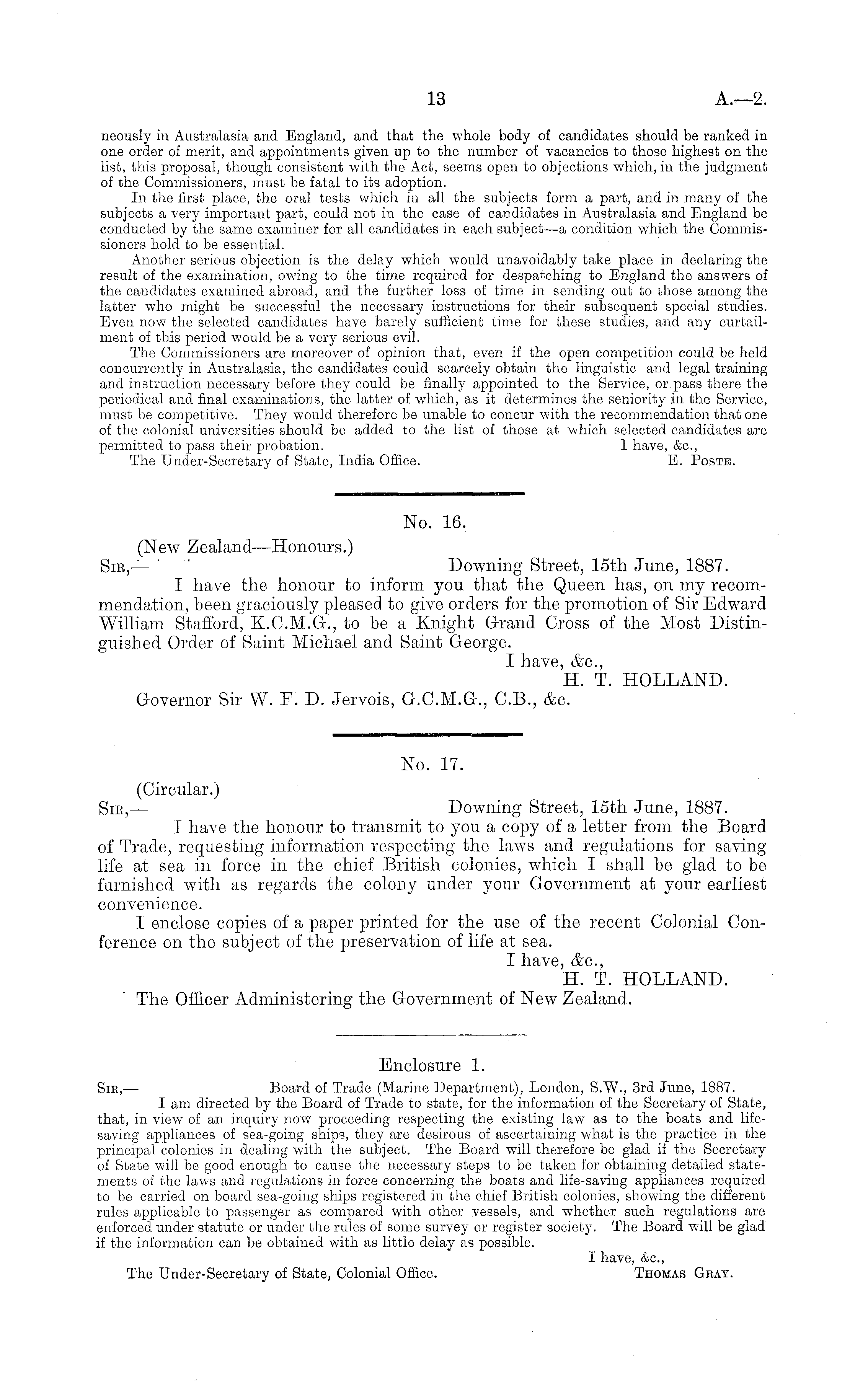 No. 17. (Circular.) Sir, — Downing Street, 15th June, 1887. I have the honour to transmit to you a copy of a letter from the Board of Trade, requesting information respecting the laws and regulations for saving life at sea in force in the chief British colonies, which I shall be glad to be furnished with as regards the colony under your Government at your earliest convenience. I enclose copies of a paper printed for the use of the recent Colonial Conference on the subject of the preservation of life at sea. I have, &c, H. T. HOLLAND. The Officer Administering the Government of New Zealand.