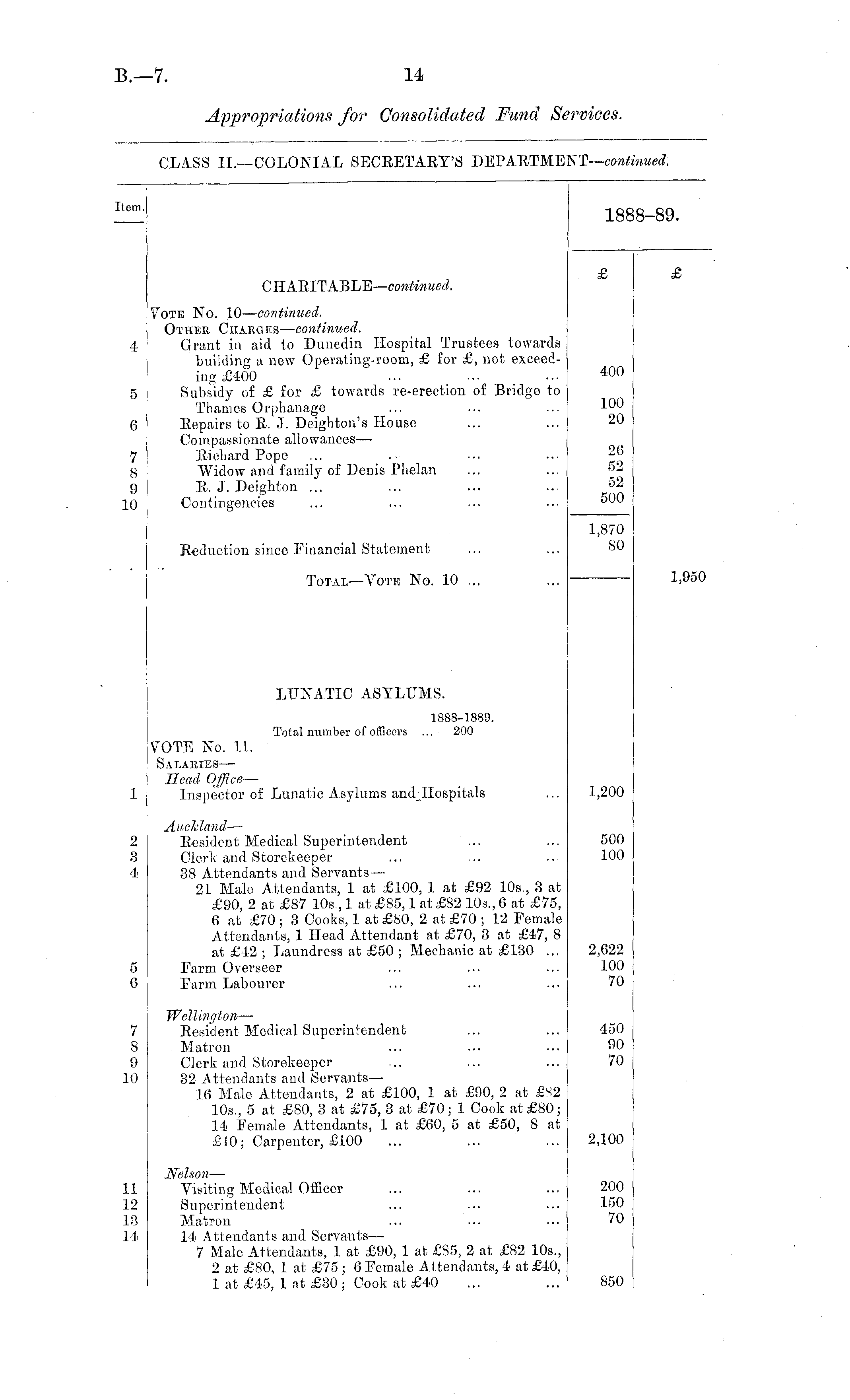 -tern. 18 8-89. C HABITABLE— continued. 5 6 Vote No. 10— continued. Other Charges— continued. Gjrant in aid to Dunedin Hospital Trustees towards building a new Operating-room, £ for £, not exceeding £100 Subsidy of £ for £ towards re-erection of Bridge to Thames Orphanage Eepairs to E. J. Deighton's House Compassionate allowances — Richard Pope Widow and family of Denis Phelan R. J. Deighton ... Contingencies 400 100 20 7 8 9 10 2G 52 52 500 Reduction since Financial Statement 1,870 SO Total —Vote No. 10 ... 1,950 LUNATIC ASYLUMS. 1888-1889. Total number of officers ... 200 VOTE No. 11. Salaries — Bead Office— Inspector of Lunatic Asylums andHospitals 1,200 2 3 4 Auckland — Resident Medical Superintendent Clerk and Storekeeper 38 Attendants and Servants — 21 Male Attendants, 1 at £100, 1 at £92 10s., 3 at £90, 2 at £87 10s., 1 at £85,1 at £82 10s., 6 at £75, 6 at £70 ; 3 Cooks, 1 at £80, 2 at £70 ; 12 Female Attendants, 1 Head Attendant at £70, 3 at £47, 8 at £42 ; Laundress at £50 ; Mechanic at £130 ... Farm Overseer Farm Labourer 500 100 5 G 2,622 100 70 7 8 9 10 Wellington —- Resident Medical Superintendent Matron Clerk and Storekeeper 32 Attendants and Servants — 16 Male Attendants, 2 at £100, 1 at £00, 2 at £S2 10s., 5 at £80, 3 at £75, 3 at £70; 1 Cook at £80; 14 Female Attendants, 1 at £60, 5 at £50, 8 at £10; Carpenter, £100 450 90 70 2,100 11 12 13 14 Nelson — Visiting Medical Officer Superintendent Matron 14 Attendants and Servants — 7 Male Attendants, 1 at £90, 1 at £85, 2 at £82 10s., 2 at £80, 1 at £75 ; G Female Attendants, 4 at £40, 1 at £45, 1 at £30; Cook at £40 200 150 70 850