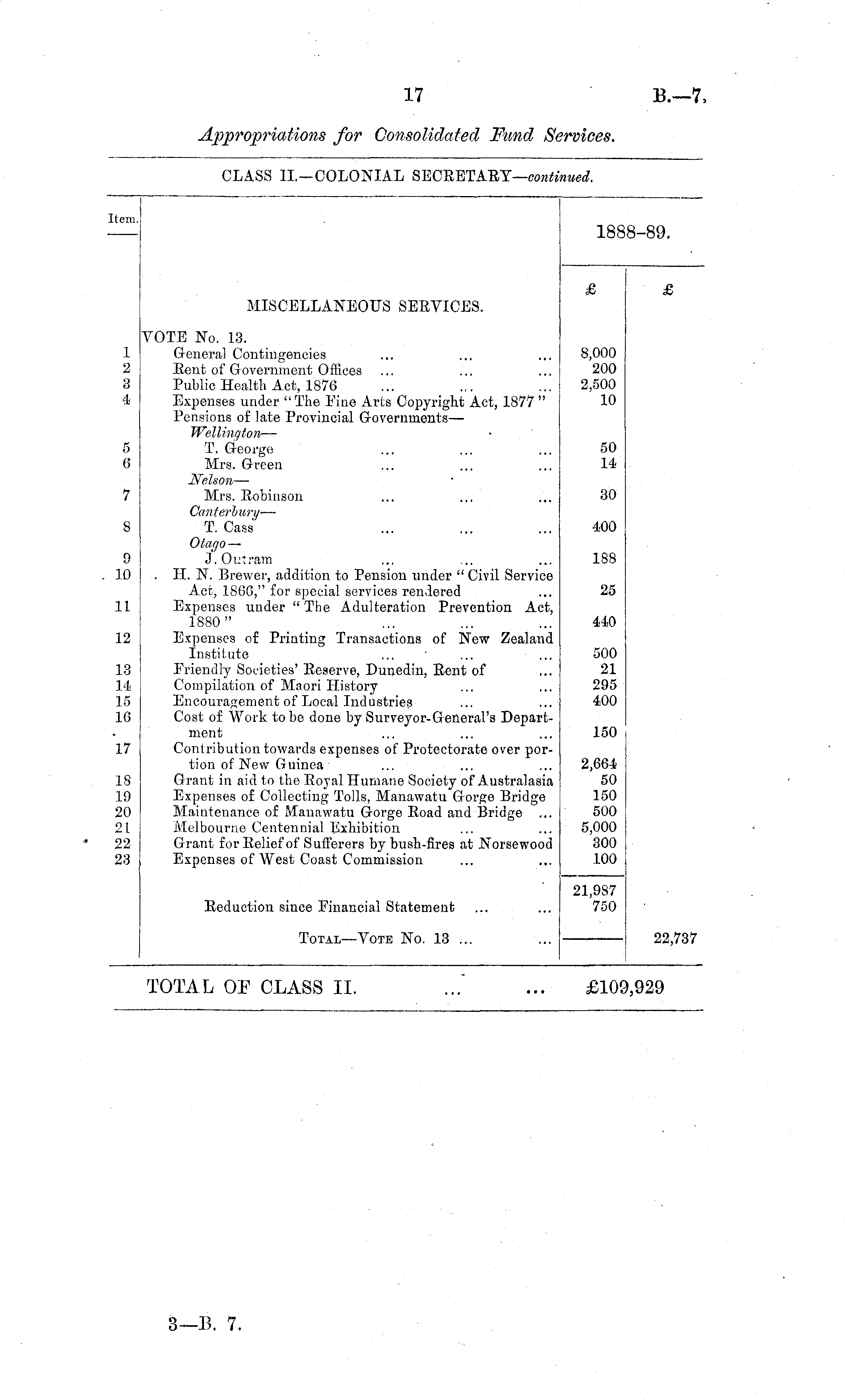 Item. 1888-89. MISCELLANEOUS SERVICES. £ l 2 3 4 VOTE No. 13. General Contingencies Kent of Government Offices Public Health Act, 1876 Expenses under "The Fine Arts Copyright Act, 1877 " Pensions of late Provincial Governments— Wellington —- T. George Mrs. Green Nelson — Mrs. Robinson Canterbury — T. Cass Ota jo — J.Outrarn . H. N. Brewer, addition to Pension under " Civil Service Act, 1866," for special services rendered Expenses under " The Adulteration Prevention Act, 1880" Expenses of Printing Transactions of New Zealand Institute Friendly Societies' Reserve, Dunedin, Rent of Compilation of Maori History Encouragement of Local Industries Cost of Work to be done by Surveyor-General's Department Contribution towards expenses of Protectorate over portion of New Guinea Grant in aid to the Royal Humane Society of Australasia Expenses of Collecting Tolls, Manawatu Gorge Bridge Maintenance of Manawatu Gorge Road and Bridge Melbourne Centennial Exhibition Grant for Relief of Sufferers by bush-fires at Norsewood Expenses of West Coast Commission 8,000 200 2,500 10 5 6 50 14 7 30 8 400 9 . 10 188 25 11 440 12 500 21 295 400 13 14 15 16 150 | 17 2,664 50 150 500 5,000 300 100 18 19 20 21 22 23 Reduction since Financial Statement 21,987 750 Total—Vote No. 13 ... 22,737 TOTAL OP CLASS II. £10' ',929 • • •
