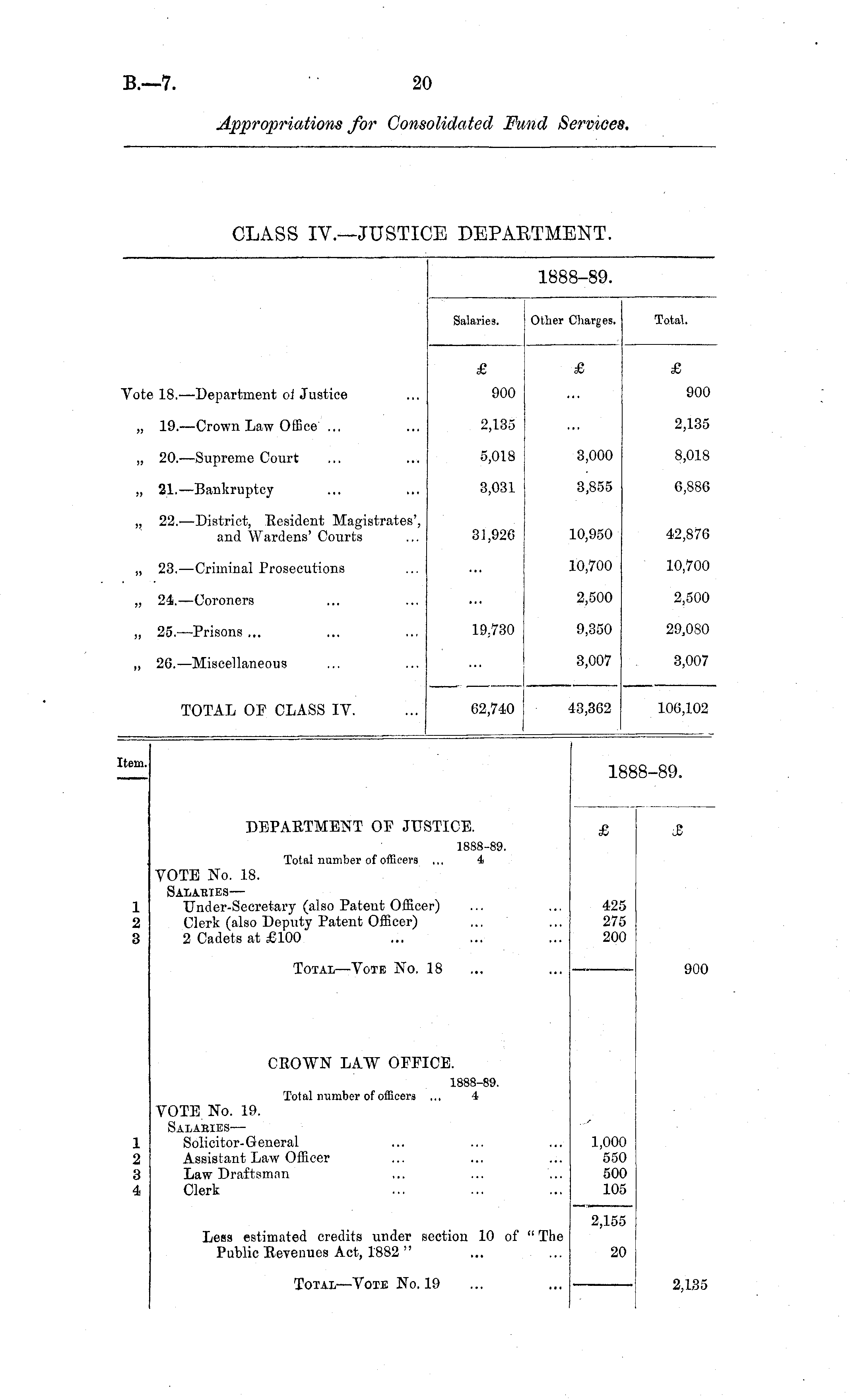 1888-89. Salaries. Other Charges. Total. £ £ £ Vote 18. —Department oi Justice 900 900 „ 19.—Crown Law Office ... 2,135 2,135 „ 20.—Supreme Court 5,018 3,000 8,018 „ 21.—Bankruptcy 3,031 3,855 6,886 ,, 22.—District, Resident Magistrates', and Wardens' Courts 31,926 10,950 42,876 „ 23.—Criminal Prosecutions 10,700 10,700 „ 24.—Coroners 2,500 2,500 ,, 25. —Prisons ... 19,730 9,350 29,080 „ 26. —Miscellaneous 3,007 3,007 TOTAL OF CLASS IV. 62,740 3,362 106,102 Item. IS 1-89. DEPARTMENT OF JUSTICE. £ JE 1888-89. Total number of officers ... 4 1 2 3 VOTE No. 18. Salaries — Under-Seeretary (also Patent Officer) Clerk (also Deputy Patent Officer) 2 Cadets at £100 425 275 200 Total—-Vote No. 18 900 CROWN LAW OFFICE. 1888-89. Total number of officers ... 4 1 2 8 4 VOTE No. 19. Salaei.es- — Solicitor-General Assistant Law Officer Law Draftsman Clerk 1,000 550 500 105 Less estimated credits under section 10 of " The Public Revenues Act, 1882 " 2,155 20 Total—Vote No. 19 2,135