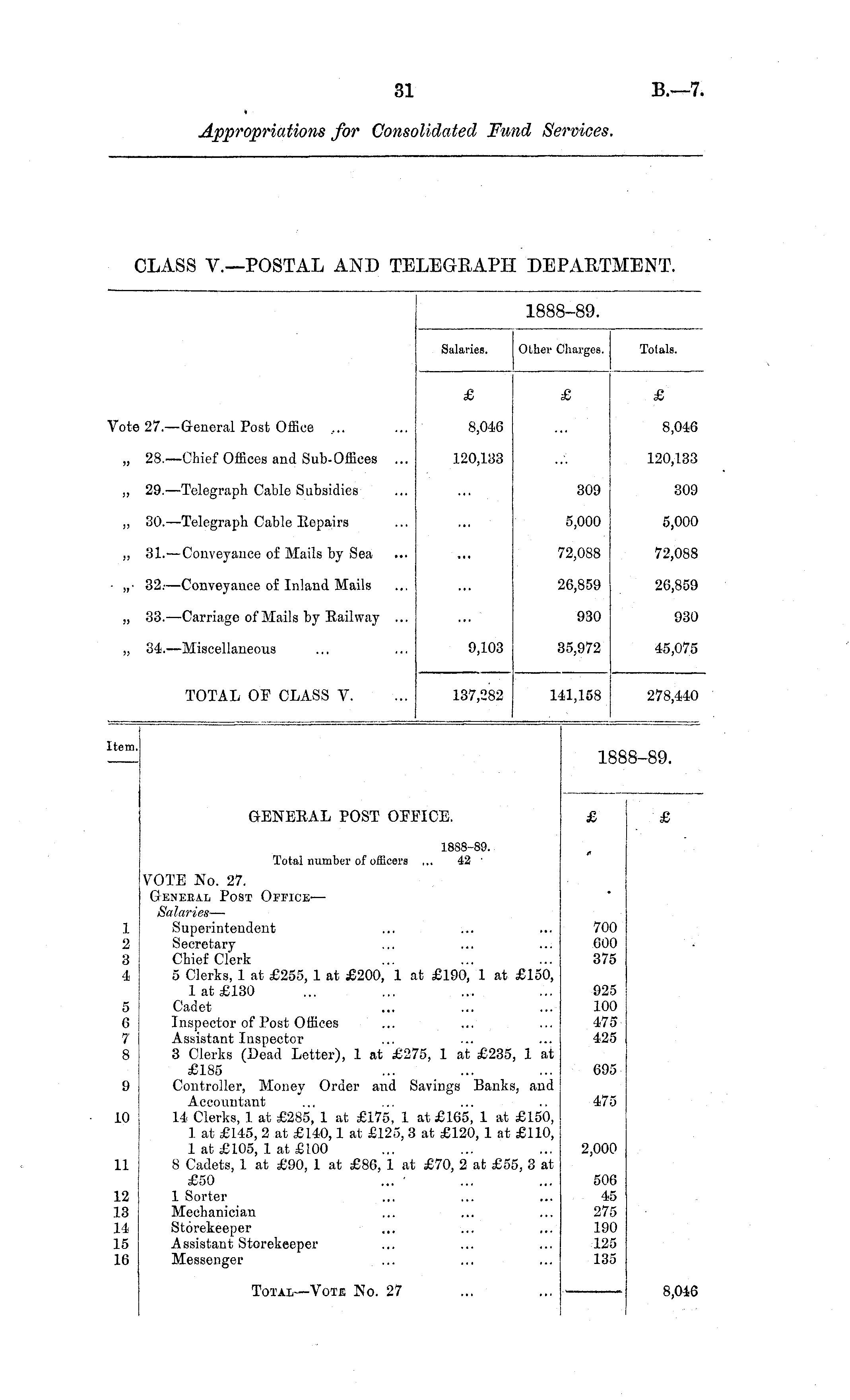 1888-89. Salaries. Other Charges. Totals. £ £ £ Vote 27.—General Post Office .... 8,046 8,046 „ 28.—Chief Offices and Sub-Offices 120,133 120,133 „ 29. —Telegraph Cable Subsidies 309 309 „ 30.—Telegraph Cable Repairs 5,000 5,000 „ 81. —Conveyance of Mails by Sea 72,088 72,088 • „■ 32.- —Conveyance of Inland Mails 26,859 26,859 „ 33. —Carriage of Mails by Bailway 930 930 „ 34. —Miscellaneous 9,103 35,972 45,075 TOTAL OF CLASS V. 137,282 .1,158 278,440 tem. .8-89. GENERAL POST OFFICE. £ £ 1888-89. Total number of officers ,.. 42 ■ ft 1 2 3 4 5 6 7 8 9 VOTE No. 27. General Post Office— Salaries — Superintendent Secretary Chief Clerk 5 Clerks, 1 at £255, 1 at £200, 1 at £190, 1 at £150, 1 at £130 Cadet Inspector of Post Offices Assistant Inspector 3 Clerks (Dead Letter), 1 at £275, 1 at £235, 1 at £185 Controller, Money Order and Savings Banks, and Accountant 14 Clerks, 1 at £285, 1 at £175, 1 at £165, 1 at £150, 1 at £145, 2 at £140,1 at £125, 3 at £120, 1 at £110, 1 at £105, 1 at £100 8 Cadets, 1 at £90, 1 at £86, 1 at £70, 2 at £55, 3 at £50 1 Sorter Mechanician Storekeeper Assistant Storekeeper Messenger 700 600 375 925 100 475 425 695 10 475 2,000 11 506 45 275 190 125 135 12 13 U 15 16 8,046 Total—Vote No. 27