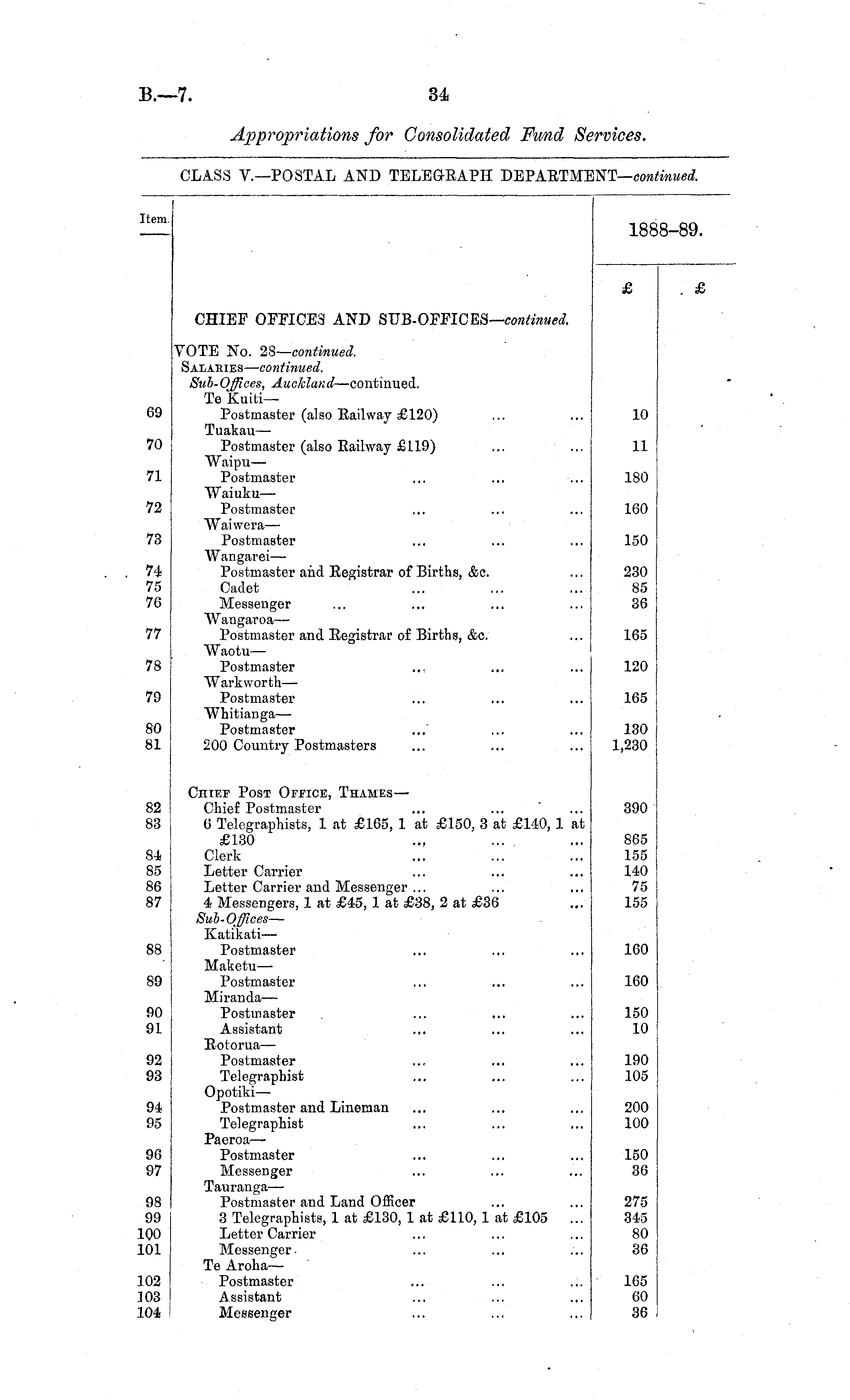 Item. 1888-89. . £ CHIEF OFFICES AND SUB-OFFICES— continued. 69 70 71 72 78 74 75 76 VOTE No. 28— continued. Salaries — continued. Sub-Offices, Auckland —continued. Te Kuiti— Postmaster (also Bail way £120) Tuakau— Postmaster (also Railway £119) Waipu— Postmaster Waiuku — Postmaster Waiwera — Postmaster Wangarei— Postmaster and Registrar of Births, &c. Cadet Messenger Wangaroa— Postmaster and Registrar of Births, &c. Waotu — Postmaster Warkworth — Postmaster Whitianga— Postmaster 200 Country Postmasters 10 11 180 160 150 230 85 36 77 165 78 120 79 165 80 81 130 1,230 82 88 84 85 86 87 88 89 Chief Post Office, Thames— Chief Postmaster (5 Telegraphists, 1 at £165, 1 at £150, 3 at £140, 1 at £130 Clerk Letter Carrier Letter Carrier and Messenger ... 4 Messengers, 1 at £45, 1 at £38, 2 at £36 Sub-Offices— Katikati — Postmaster Maketu — Postmaster Miranda— Postmaster Assistant Rotorua— Postmaster Telegraphist Opotiki — Postmaster and Lineman Telegraphist Paeroa— Postmaster Messenger 390 865 155 140 75 155 160 160 90 91 150 10 92 93 190 105 94 95 200 100 96 97 150 36 98 99 .00 .01 Tauranga— Postmaster and Land Officer 8 Telegraphists, 1 at £130, 1 at £110, 1 at £105 ... Letter Carrier Messenger. Te Aroha— Postmaster Assistant Messenger 275 345 80 36 .02 03 .04 165 60 36