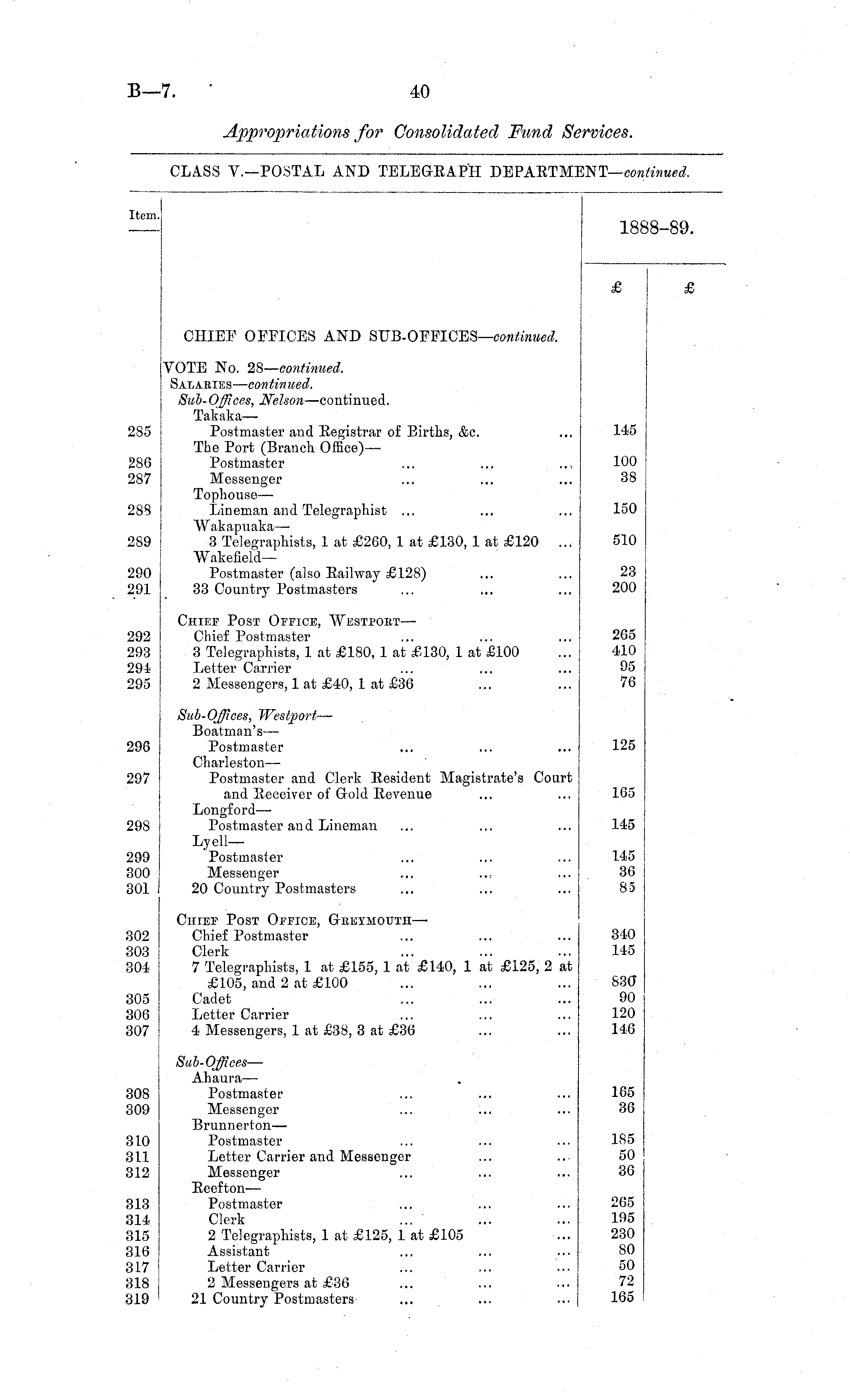 Item. 18 8-89. CHIEF OFFICES AND SUB-OFFICES— continued. 285 286 287 VOTE No. 28— continued. Salakies — continued. Sub-Offices, Nelson —continued. Takaka— Postmaster and Registrar of Births, &c. The Port (Branch Office)— Postmaster Messenger Tophouse— Lineman and Telegraphist ... Wakapuaka— 3 Telegraphists, 1 at £260, 1 at £180, 1 at £120 ... Wakefield— Postmaster (also Railway £128) 33 Country Postmasters 145 100 38 288 150 289 510 290 291 23 200 592 >93 291 195 Chief Post Office, Westpoet—■ Chief Postmaster 3 Telegraphists, 1 at £180, 1 at £130, 1 at £100 Letter Carrier 2 Messengers, 1 at £40, 1 at £36 265 410 95 76 196 !97 Sub-Offices, TVestport— Boatman's — Postmaster Charleston — Postmaster and Clerk Resident Magistrate's Court and Receiver of Gold Revenue Longford— Postmaster and Lineman Ly ellPostmaster Messenger 20 Country Postmasters 125 165 198 145 199 JOO 301 145 36 85 ;02 103 iO-1 Chief Post Office, Gteexmouth — Chief Postmaster Clerk 7 Telegraphists, 1 at £155, 1 at £140, 1 at £125, 2 at £105, and 2 at £100 Cadet Letter Carrier 4 Messengers, 1 at £38, 3 at £36 340 145 830" 90 120 146 !05 106 107 108 109 HO 111 112 Sub-Offices— Ahaura— Postmaster Messenger Brunnerton— Postmaster Letter Carrier and Messenger Messenger Reefton — Postmaster Clerk 2 Telegraphists, 1 at £125, 1 at £105 Assistant Letter Carrier 2 Messengers at £36 21 Country Postmasters 165 36 185 50 36 113 114 115 116 1L7 118 119 265 195 230 80 50 72 165