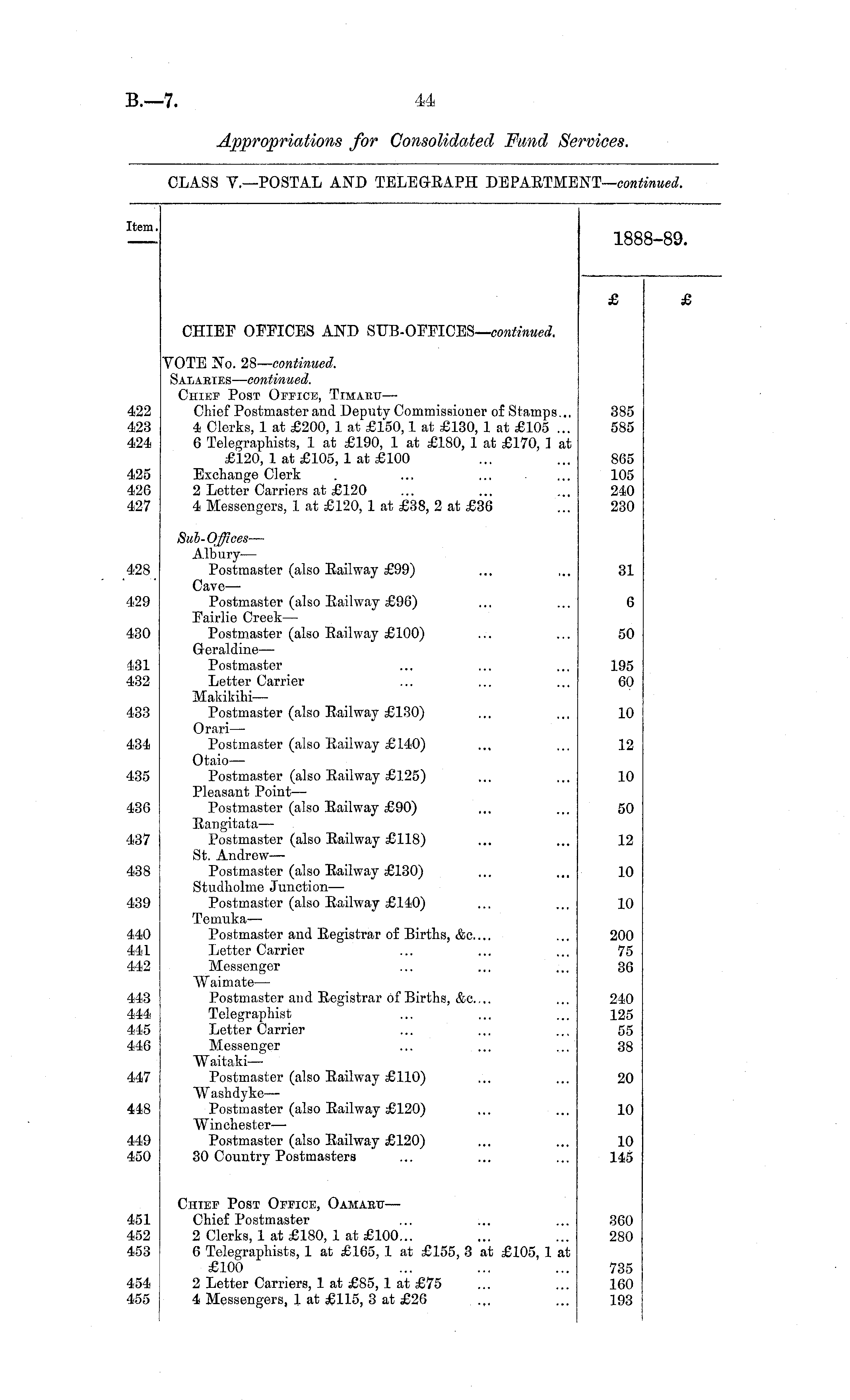 "tern. 1888-89. CHIEF OFFICES AND SUB-OFFICES— continued. .22 ,23 i24 VOTE No. 28— continued. Salabies — continued. Chief Post Office, Timabu— Chief Postmaster and Deputy Commissioner of Stamps.., 4 Clerks, 1 at £200, 1 at £150,1 at £130, 1 at £105 ... 6 Telegraphists, 1 at £190, 1 at £180, 1 at £170, ] at £120, 1 at £105, 1 at £100 Exchange Clerk 2 Letter Carriers at £120 4 Messengers, 1 at £120, 1 at £38, 2 at £36 385 585 •25 ,27 865 105 240 230 Sub-Offices— Albury — Postmaster (also Railway £99) 31 t28 129 130 131 132 133 134 135 136 137 138 Cave — Postmaster (also Railway £96) Fairlie Creek— Postmaster (also Railway £100) Q-eraldine — Postmaster Letter Carrier Makikihi — Postmaster (also Railway £130) Orari — Postmaster (also Railway £140) Otaio— Postmaster (also Railway £125) Pleasant Point — Postmaster (also Railway £90) Eangitata — Postmaster (also Railway £118) St. AndrewPostmaster (also Railway £130) Studholme Junction — Postmaster (also Railway £140) Temuka— Postmaster and Registrar of Births, &c.... Letter Carrier Messenger "Waimate — Postmaster and Registrar of Births, &c.... Telegraphist Letter Carrier Messenger "Waitaki — Postmaster (also Railway £.110) Washdyke — Postmaster (also Railway £120) Winchester — Postmaster (also Railway £120) 30 Country Postmasters 6 50 195 60 10 12 10 50 12 10 139 10 140 141 142 200 75 36 143 144 145 146 240 125 55 38 147 20 148 10 149 150 10 145 f 51 .52 ,53 Chief Post Office, Oamaett— Chief Postmaster 2 Clerks, 1 at £180, 1 at £100... 6 Telegraphists, 1 at £165, 1 at £155, 3 at £105, 1 at £100 2 Letter Carriers, 1 at £85, 1 at £75 4 Messengers, 1 at £115, 3 at £26 360 280 ,54 •55 735 160 193