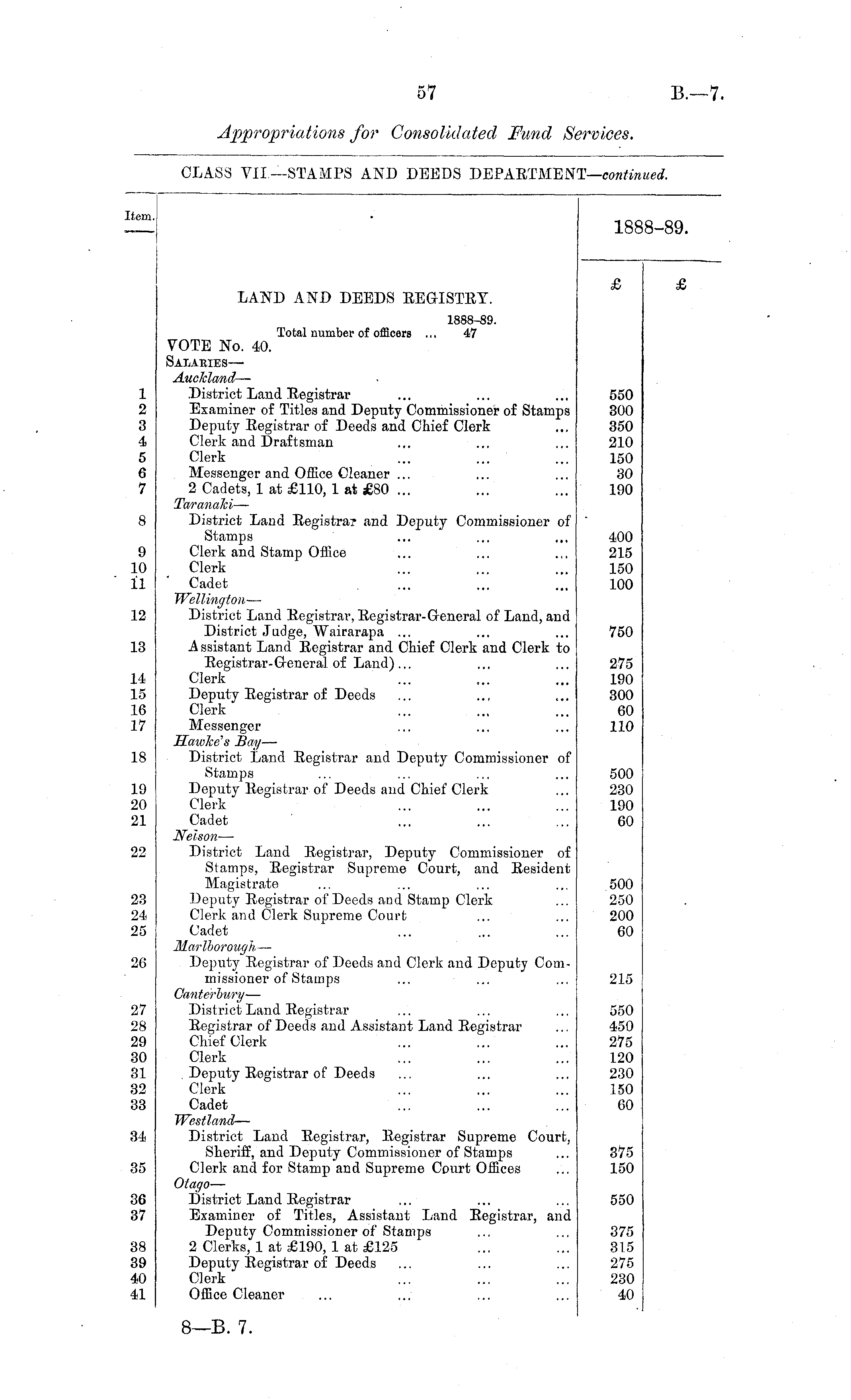 .tem. 1888-89. LAND AND DEEDS EEGISTEY. 1888-89. Total number of officers ,., 47 l 2 8 4 5 6 7 8 9 10 11 12 13 14 15 16 17 18 19 20 21 VOTE No. 40. Sit ABIES — Auckland — .District Land Eegistrar Examiner of Titles and Deputy Commissioner of Stamps Deputy Eegistrar of Deeds and Chief Clerk Clerk and Draftsman Clerk Messenger and Office Cleaner ... 2 Cadets, 1 at £110, 1 at £80 ... Taranahi — District Land Registrar and Deputy Commissioner of Stamps Clerk and Stamp Office Clerk Cadet Wellington — District Land Eegistrar, Eegistrar-Greneral of Land, and District Judge, Wairarapa ... Assistant Land Eegistrar and Chief Clerk and Clerk to Eegistrar- General of Land) ... Clerk Deputy Eegistrar of Deeds Clerk Messenger Hawlce's Bay — District Land Registrar and Deputy Commissioner of Stamps Deputy Eegistrar of Deeds and Chief Clerk Clerk Cadet Nelson — District Land Eegistrar, Deputy Commissioner of Stamps, Eegistrar Supreme Court, and Eesident Magistrate Deputy Eegistrar of Deeds and Stamp Clerk Clerk and Clerk Supreme Court Cadet Marlborouglb — Deputy Eegistrar of Deeds and Clerk and Deputy Commissioner of Stamps Oanterhury — District Land Eegistrar Eegistrar of Deeds and Assistant Land Eegistrar Chief Clerk Clerk Deputy Eegistrar of Deeds Clerk Cadet Westland — District Land Eegistrar, Eegistrar Supreme Court, Sheriff, and Deputy Commissioner of Stamps Clerk and for Stamp and Supreme Court Offices Otago — District Land Eegistrar Examiner of Titles, Assistant Land Eegistrar, and Deputy Commissioner of Stamps 2 Clerks, 1 at £190, 1 at £125 Deputy Eegistrar of Deeds Clerk Office Cleaner 550 300 350 210 150 30 190 400 215 150 100 750 275 190 300 60 110 500 230 190 60 22 23 24 25 500 250 200 60 26 215 27 2S 20 80 31 82 83 550 450 275 120 230 150 60 34 375 150 35 86 37 550 88 30 40 41 375 315 275 230 40