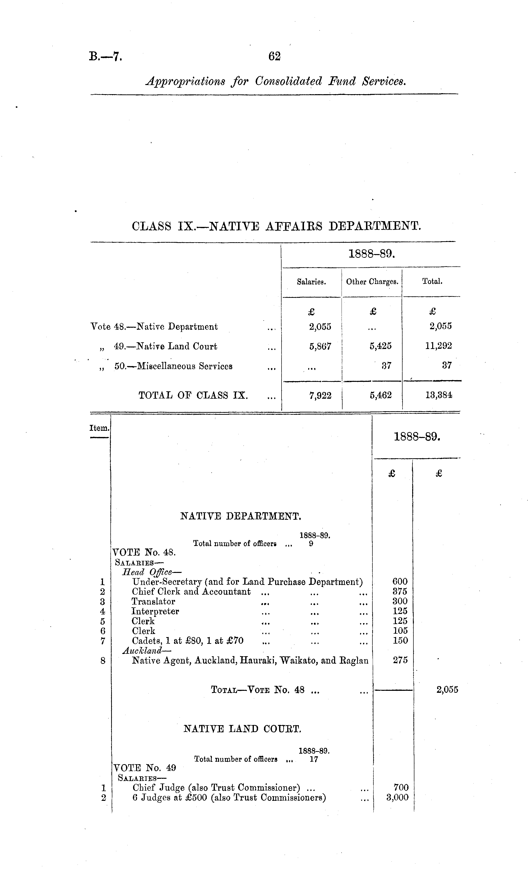 1888-89. Salaries. Other Charges. Total. £ £ £ Vote 48.—Native Department 2,055 2,055 „ 49.—Native Land Court 5,867 I I 5,425 11,292 „ 50.—Miscellaneous Services 37 37 TOTAL OF CLASS IX. 7,922 5,462 13,384 Item. '88-89. NATIVE DEPARTMENT. 1888-89. Total number of officers .,. 9 1 2 3 4 5 6 7 VOTE No. 48. Salaeies— Head Office — Under-Secretary (and for Land Purchase Department) Chief Clerk and Accountant ... Translator Interpreter Clerk Clerk Cadets, 1 at £80, 1 at £70 Auckland — Native Agent, Auckland, Hauraki, "Waikato, and Raglan 600 375 300 125 125 105 150 8 275 Total—Vote No. 48 ... 2,055 NATIVE LAND COURT. 1888-89. Total number of officers ... 17 VOTE No. 49 Salaeies — Chief Judge (also Trust Commissioner) ... 6 Judges at £500 (also Trust Commissioners) 1 2 700 3,000