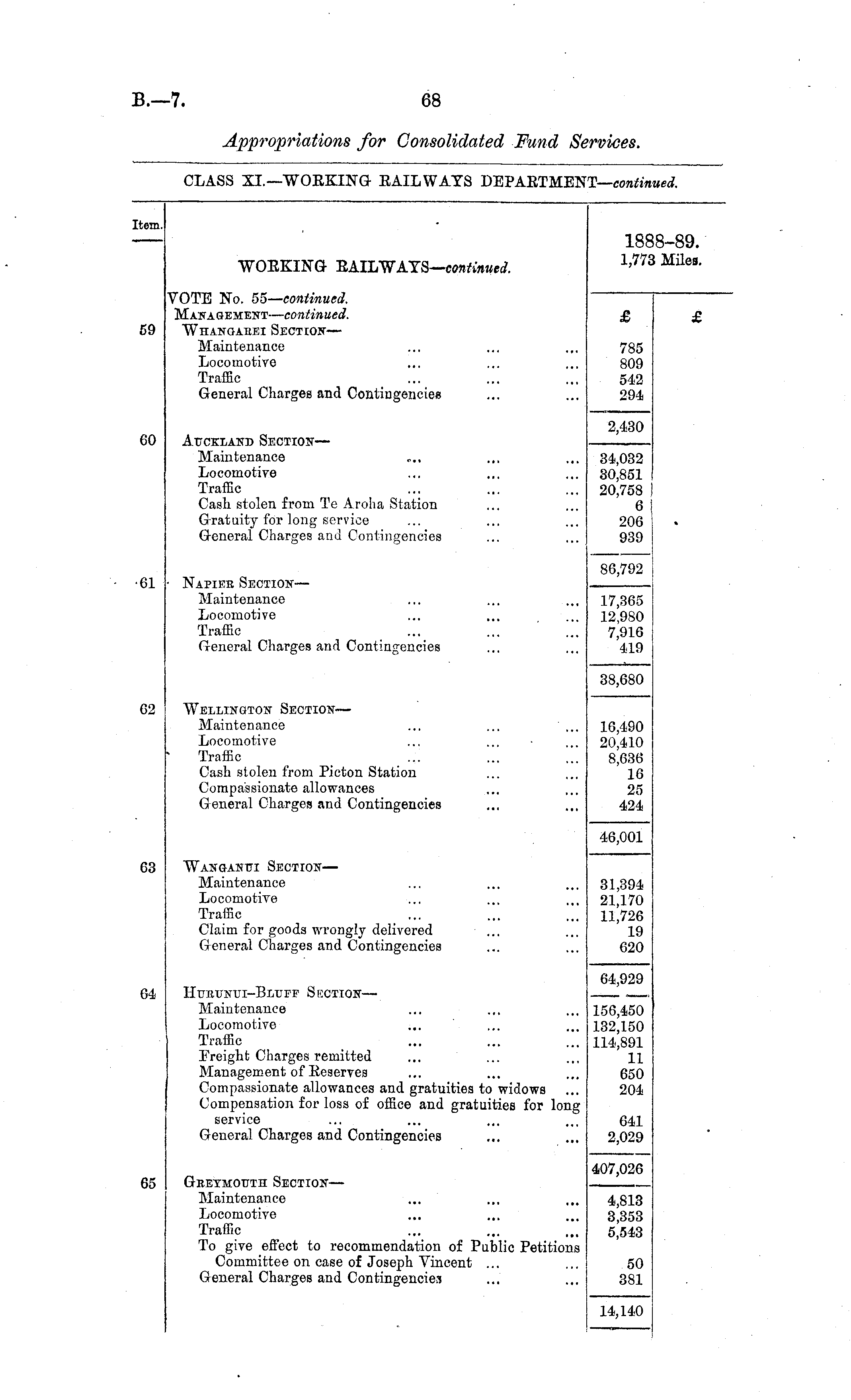 item. WOKKING "RAILWAYS—continued. 18? 1,77: 18-89. ! Miles. 59 VOTE No. 55— continued. Management— continued. Whanoaeei Section— Maintenance Locomotive Traffic General Charges and Contingencies £ 785 809 542 294 Auckland Section— Maintenance Locomotive Traffic Cash stolen from Te Aroha Station Gratuity for long service General Charges and Contingencies 2,430 00 34,032 30,851 20,758 I 6i 206 939 ■61 • Napiek Section— Maintenance Locomotive Traffic General Charges and Contingencies 86,792 17,365 12,980 7,916 419 38,680 G2 Wellington Section— Maintenance ... ... ... Locomotive ' Traffic Cash stolen from Picton Station Compassionate allowances General Charges and Contingencies 16,490 20.410 8,636 16 25 424 46,001 68 Wanganui Section— Maintenance Locornotiye Traffic Claim for goods wrongly delivered General Charges and Contingencies 31,394 21,170 11,726 19 620 HtriiuNui-Bi/uFF Section— Maintenance Locomotive Traffic Freight Charges remitted Management of Reserves Compassionate allowances and gratuities to widows Compensation for loss of office and gratuities for long service General Charges and Contingencies 64,929 64 156,450 132,150 114,891 11 650 204 641 2,029 Geetmouth Section— Maintenance Locomotive Traffic To give effect to recommendation of Public Petitions Committee on case of Joseph Vincent ... General Charges and Contingencies 407,026 65 4,813 3,353 5,543 50 381 14,140
