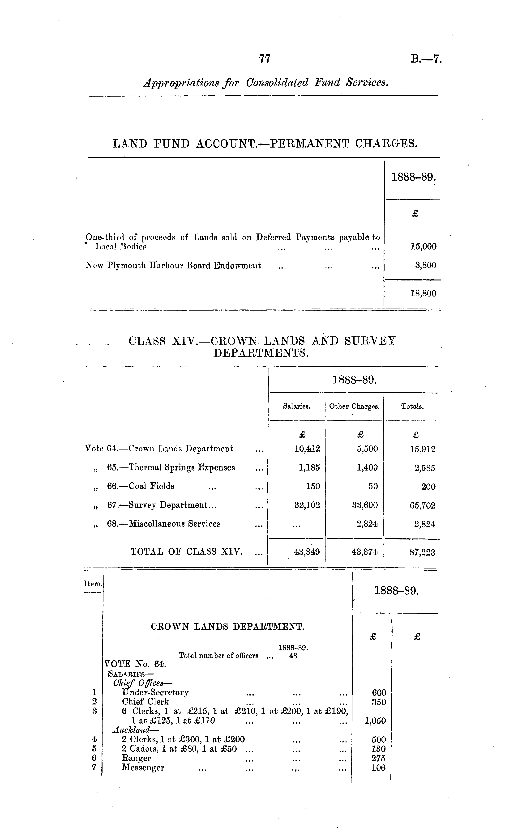 1888-89. Salaries. Other Charges. Totals. £ £ £ Vote 64.—Crown Lands Department 10,412 5,500 15,912 „ 65. —Thermal Springs Expenses 1,185 1,400 2,585 „ 66.—Coal Fields 150 50 200 „ 67.—Survey Department... 32,102 33,600 65,702 „ 68.—Miscellaneous Services 2,824 2,824 TOTAL OF CLASS XIV. 43,849 *3,374 87,223 Item. 8-89. CEOWN LANDS DEPAETMENT. 1888-89. Total number of officers ,., 48 1 2 3 70TE No. 64. Salakies — Chief Offices— Under-Secretary Chief Clerk 6 Clerks, 1 at £215, 1 at £210, 1 at £200,1 at £190, 1 at £125, 1 at £110 Auckland — 2 Clerks, 1 at £300, 1 at £200 2 Cadets, 1 at £80, 1 at £50 ... Eanger Messenger 600 350 1,050 4 5 6 7 500 130 275 106