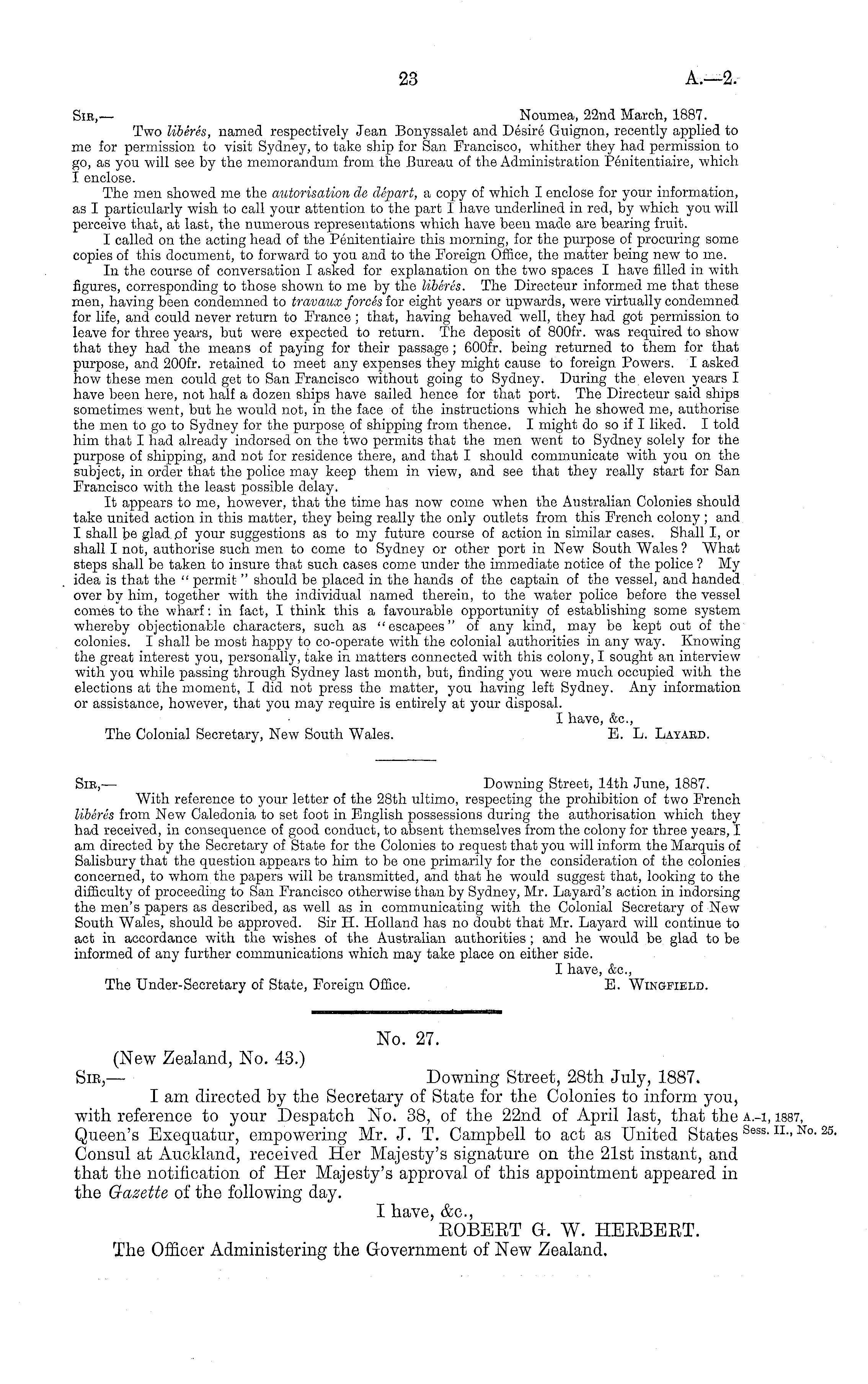 No. 27. (New Zealand, No. 43.) Sir,— Downing Street, 28th July, 1887. I am directed by the Secretary of State for the Colonies to inform you, with reference to your Despatch No. 38, of the 22nd of April last, that the Queen's Exequatur, empowering Mr. J. T. Campbell to act as United States Consul at Auckland, received Her Majesty's signature on the 21st instant, and that the notification of Her Majesty's approval of this appointment appeared in the Gazette of the following day. I have, &c, EOBEET G. W. HEEBEET. The Officer Administering the Government of New Zealand.