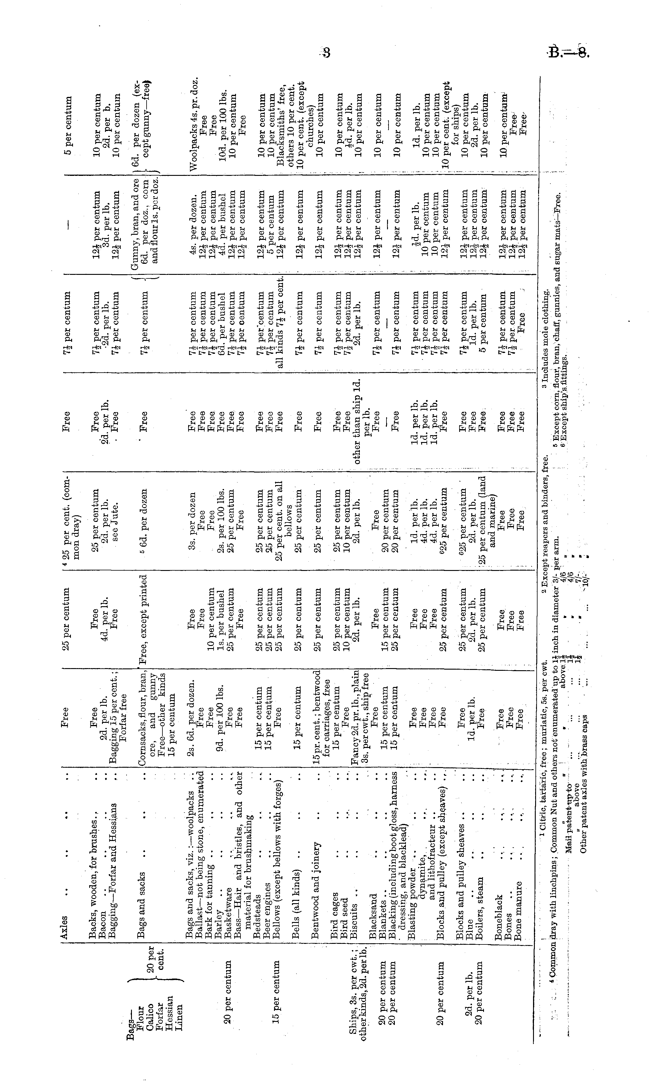 Axles .. .. ,. Free 25 per centum 4 25 per cent, (common dray) Free 7} per centum 5 per centum Backs, wooden, for brushes.. Bacon .. .. Bagging— Forfar and Hessians Free 2d. per lb. Bagging 15 per cent.; Forfar free Free 4d. per lb. Free 25 per centum 2d. per lb. see Jute. Free 2d. per lb. ■ Free 7} per centum •2d. per lb. 7} per centum 12 J per centum 3d. per lb. 12} per centum 10 per centum 2d. per b. 10 per centum Bags — *\ Flour Calico 20 per Forfar " cent. Hessian Linen ; Bags and sacks Cornsacks, flour, bran, ore, and gunny Free —other kinds 15 per centum Free, except printed s 6d. per dozen Free 7} per centum \ Gunny, bran, and ore 6d. per doz., corn and flour Is. per doz. | 6d. per dozen (ex- [■ cept gunny —free) 20 per centum Bags and sacks, viz.: —woolpacks Ballast —not being stone, enumerated Bark for tanning Barley Basketware Bass —Hair and bristles, and other material for brushmaking Bedsteads Beer engines Bellows (except bellows with forges) 2s. Od. per dozen. Free Free 9d. per 100 lbs. Free Free Free Free 10 per centum Is. per bushel 25 per centum Free 3s. per dozen Free Free 2s. per 100 lbs. 25 per centum Free Free Free Free Free Free Free 7} per centum 7} per centum 7} per centum Od. per bushel 7} per centum 7} per centum 4s. per dozen. 12} per centum 12} per centum 4d. per bushel 12} per centum 12} per centum Woolpacks 4s. pr. doz. Free Free lOd. per 100 lbs. 10 per centum Free 15 per centum 15 per centum 15 per centum Free 25 per centum 25 per centum 25 per centum 25 per centum 25 per centum 25 per cent, on all bellows 25 per centum Free Free Free 7} per'centum 7} per centum all kinds 7} per cent. 12} per centum 5 per centum 12} per centum 10 per centum 10 per centum Blacksmiths' free, others 10 per cent. 10 per cent, (except churches) 10 per centum Bells (all kinds) .. 15 per centum 25 per centum Free 7} per centum 12} per centum Ships, 3s. per cwt.; other kinds, 2d. per lb. Bentwood and joinery Bird cages Bird seed Biscuits 15 pr. cent.; bentwood for carriages, free 15 per centum Free Fancy 2d. pr. lb., plain 3s. percwt., ship free Free 15 per centum 15 per centum 25 per centum 25 per centum 10 per centum 2d. per lb. 25 per centum 25 per centum 10 per centum 2d. per lb. Free Free Free other than ship Id. per lb. Free 7} per centum 7} per centum 7} per centum 2d. per lb. 12 J per centum 12} per centum 12} per centum 12} per centum 10 per centum }d. per lb. I 10 per centum 20 per centum 20 per centum Blacksand Blankets Blacking (including boot gloss, harness dressing, and blaeklead) Blasting powder dynamite, and lithofracteur Blocks and pulley (except sheaves) ... Free 15 per centum 25 per centum Free 7} per centum 12} per centum 10 per centum 20 per centum 20 per centum Free 7} per centum 12} per centum 10 per centum Free Free Free Free Free Free Free 25 per centum Id. per lb. 4d. per lb. 4d. per lb. 625 per centum Id. per lb. Id. per lb. Id. per lb. Free 7} per centum 7} per centum 7} per centum 7} per centum }d. per lb. 10 per centum 10 per centum 12} per centum j Id. per lb. 10 per centum 10 per centum ; 10 per cent, (except for ships) 10 per centum 2d. per lb. 10 per centum 20 per centum 2d. per lb. 20 per centum Blocks and pulley sheaves Blue Boilers, steam Free Id. per lb. Free 25 per centum 2d. per lb. 25 per centum c25 per centum 2d. per lb. 25 per centum (land and marine) Free Free Free Free Free Free 7_ per centum Id. per lb. 5 per centum 12} per centum 12} per centum 12} per centum Bonehlack ... ., , Bones .. .. Bone manure .. . ._ Free Free Free Free Free Free Free Free Free 7} per centum 7} per centum Free 12} per centum 12} per centum 12} per centum 10 per centum Free Freer Citric, tartaric, free; muriatic, 5s. per cwt. 2 Except reapers and binders, free. 8 Includes mole clothing. --. . • e ' * Common dray with linchpins; Common Nut and others not enumerated up to li inch in diameter 3/- per arm. 5 Except corn, flour, bran, chaff, gunnies, and sugar mats—Free „ ., » » ' above 1} , 4/6 „ 6 Except ship's fittings. — - Mail patent up to ... ...... if „ 4/6 , „ above ... ... ... 1J _ 7/Other patent axles with brass caps ... ... ... -10/- .