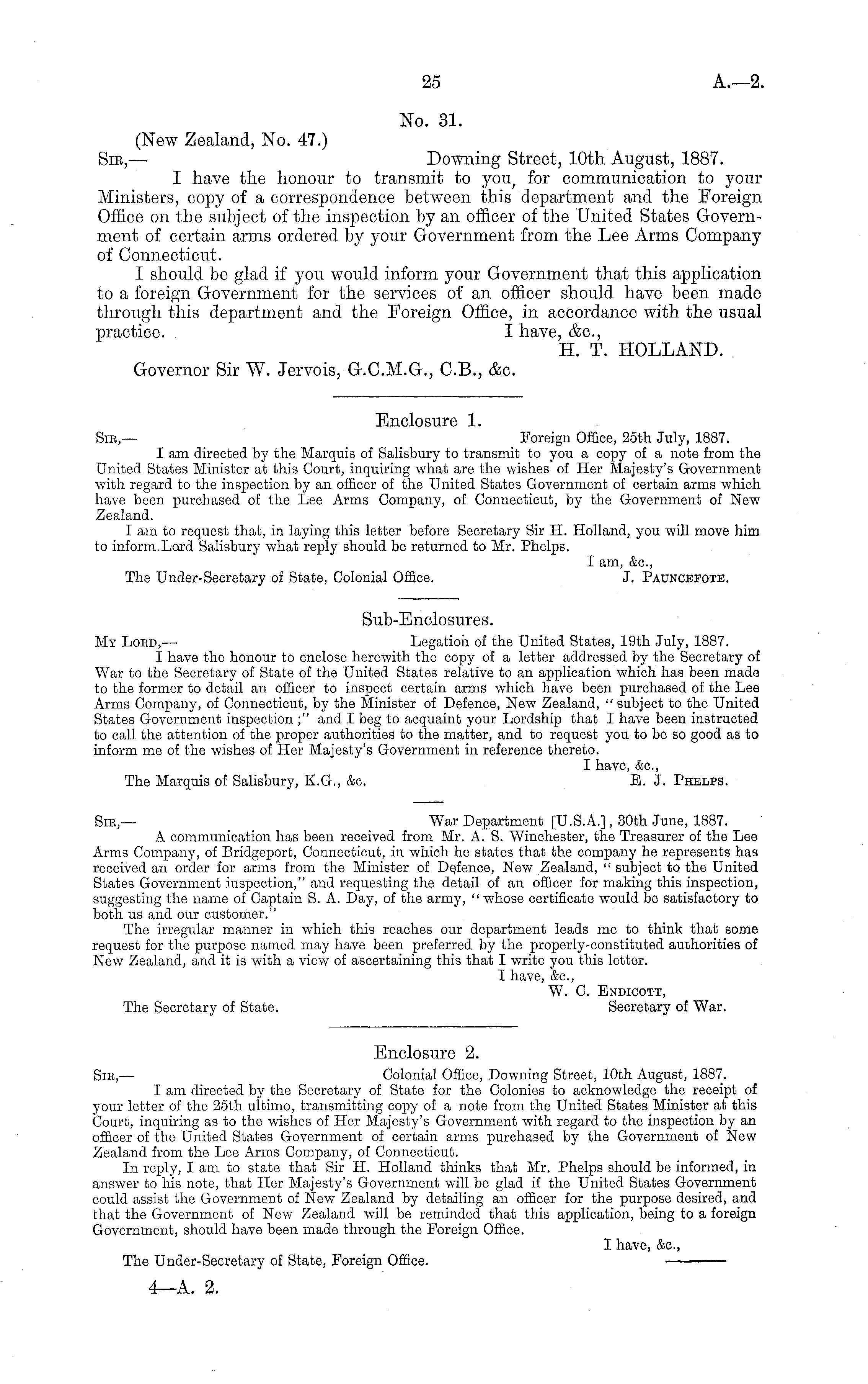 Enclosure 1. Sib,— Foreign Office, 25th July, 1887. I am directed by the Marquis of Salisbury to transmit to you a copy of a note from the United States Minister at this Court, inquiring what are the wishes of Her Majesty's Government with regard to the inspection by an officer of the United States Government of certain arms which have been purchased of the Lee Arms Company, of Connecticut, by the Government of New Zealand. I am to request that, in laying this letter before Secretary Sir H. Holland, you will move him to inform.Loxd Salisbury what reply should be returned to Mr. Phelps. 1 am, &c, The Under-Secretary of State, Colonial Office. J. Pauncefote.