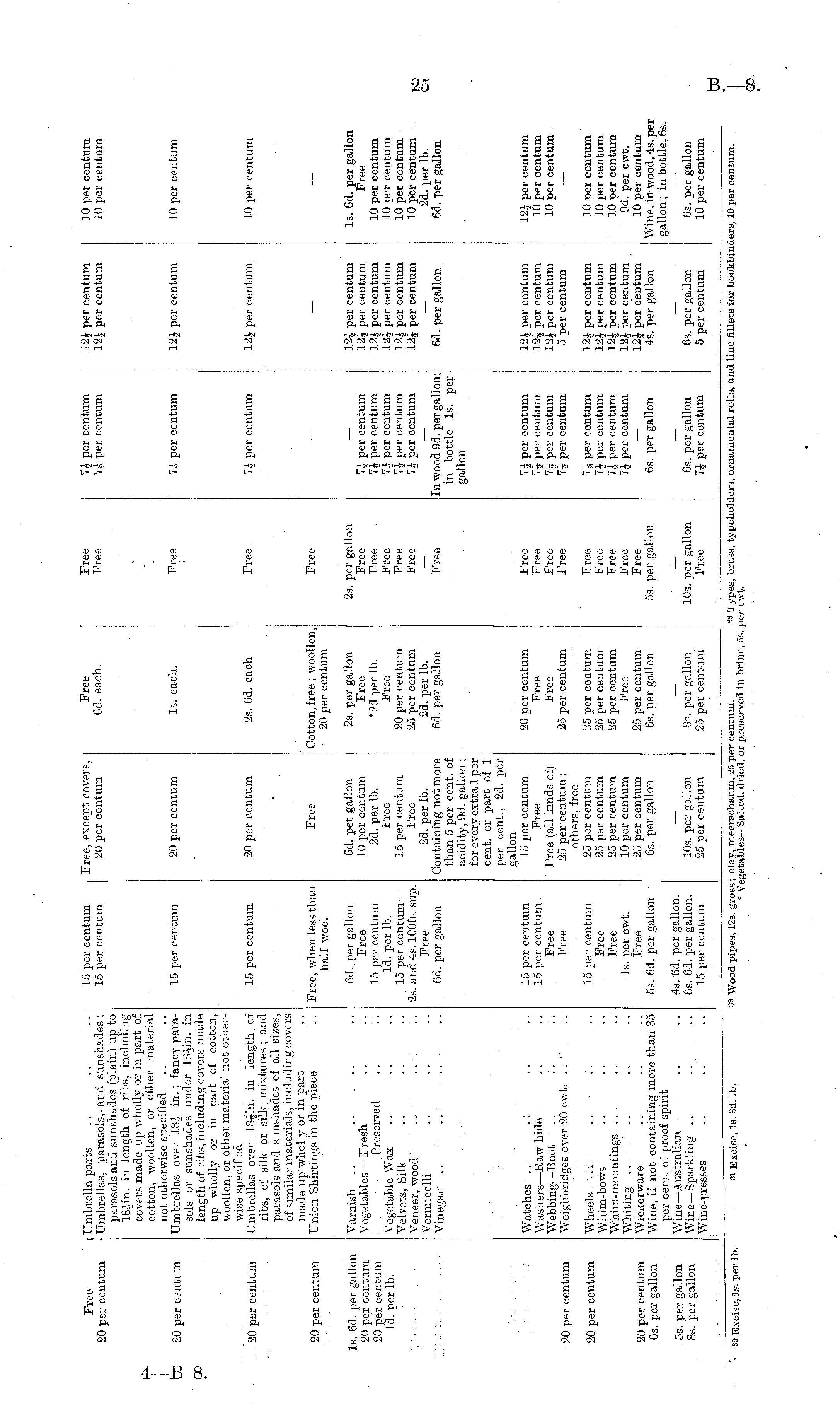 Free 20 per centum 20 per cantum Umbrella parts Umbrellas, parasols,- and sunshades; parasols and sunshades (plain) up to 18}in. in length of ribs, including covers made up wholly or in part of cotton, woollen, or other material not otherwise specified Umbrellas over 18} in. ; fancy parasols or sunshades under IS}in. in length of ribs, including covers made up wholly or in part of cotton, woollen, or other material not otherwise specified Umbrellas over 18}in. in length of ribs, of silk or silk mixtures ; and parasols and sunshades of all sizes, of similar materials, including covers made up wholly or in part Union Shirtings in the piece 15 per centum 15 per centum 15 per centum Free, except covers, 20 per centum 20 per centum Free Od. each. Is. each. Free Free Free 7} per centum 7} per centum 7} per centum 12} per centum 12} per centum 12} per centum 10 per centum 10 per centum 10 per centum . 20 per centum 15 per centum 20 per centum 2s. 6d. each Free 7} per centum 12} per centum 10 per centum 20 per centum Free, when less than half wool Free Cotton, free ; woollen, 20 per centum Free Is. 6d. per gallon 20 per centum 20 per centum Id. per lb. Varnish .. .. . . • A regetables —Fresh Preserved Vegetable Wax Velvets, Silk Veneer, wood .. Vermicelli Vinegar .. Od. per gallon Free 15 per centum Id. per lb. 15 per centum 2s. and 4s. 100ft. sup. Free Od. per gallon Gd. per gallon 10 per centum 2d. per lb. Free 15 per centum Free 2d. per lb. Containing not more than 5 per cent, of acidity, 9d. gallon; for every extra 1 percent, or part of 1 per cent., 2d. pelgallon 15 per centum Free Free (all kinds of) 25 per centum; others, free 25 per centum 25 per centum 25 per centum 10 per centum 25 per centum 6s. per gallon 2s. per gallon Free *2d per lb. Free 20 per centum 25 per centum 2d. per lb. Gd. per gallon 2s. per gallon Free Free Free Free Free 7} per centum 7} per centum 7} per centum 7} per centum 7} per centum 12} per centum 12} per centum 12} per centum 12r} per centum 12} per centum 12} per centum Od. per gallon Is. Gd. per gallon Free 10 per centum 10 per centum 10 per centum 10 per centum 2d. per lb. Gd. per gallon Free In wood 9d. per gallon; in bottle Is. per gallon Watches .. ■ ■ Washers —Raw hide Webbing —Boot Weighbridges over 20 cwt. 15 per centum 15 per centum. Free Free 20 per centum Free Free Free Free Free Free 7} per centum 7} per centum 7} per centum 7} per centum 12} per centum 12} per centum 12} per centum 5 per centum 12} per centum 10 per centum 10 per centum 20 per centum 25 per centum 20 per centum Wheels Whim-bows Whim-mountings Whiting .. Wickerware Wine, if not containing more than 35 per cent, of proof spirit Wine —Australian Wine —Sparkling Wine-presses 15 per centum Free Free 25 per centum 25 per centum 25 per centum Free Free Free Free Free Free 7} per centum 7} per centum 7t} per centum 7} per centum 12} per centum 12} per centum 12} per centum 12} per centum 12} per centum 4s. per gallon 10 per centum 10 per centum 10 per centum 9d. per cwt. 10 per centum Wine, in wood, 4s.pt gallon; in bottle, 6s 20 per centum 6s. per gallon Is. per cwt. Free 5s. 6d. per gallon 25 per centum 6s. per gallon - 0s. per gallon 5s. per gallon 5s. per gallon 8s. per gallon 4s. 6d. per gallon. 6s. 6d, per gallon. 15 per centum 10s. per gallon 25 per centum 8«*. per gallon 25 per centum 10s. per gallon Free Gs. per gallon 7} per centum 6s. per gallon 5 per centum Gs. per gallon 10 per centum ■ 450 Excise, Is. per lb. 31 Excise, Is. fid. lb. 32 Wood pipes, 12s. gross; clay, meerschaum, 25 per centum. S3 types, brass, typeholders, ornamental rolls, and line fillets for bookbinders, 10 per centum. * Vegetables —Salted, dried, or preserved in brine, 5s. per cwt.