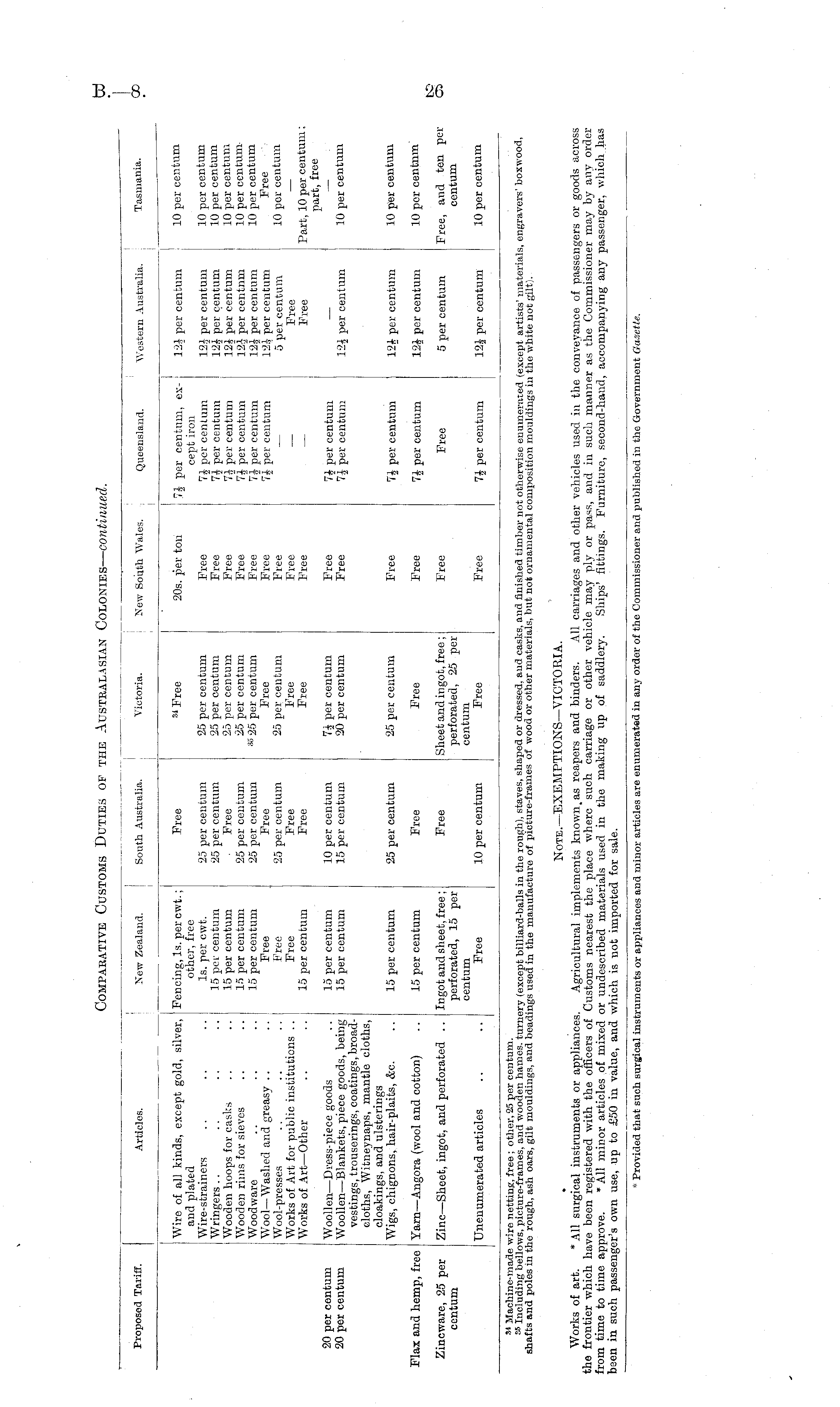 Proposed Tariff. Articles. New Zealand. South Australia. Victoria. New South Wales. Queensland. Western Australia. Tasmania. 1 i Wire of all kinds, except gold, silver, and plated Wire-strainers Wringers Wooden hoops for caslcs Wooden rims for sieves Woodware Wool —Washed and greasy Wool-presses Works of Art for public institutions .. Works of Art—Other Fencing, Is. per cwt.; other, free Is. per cwt. 15 per centum 15 per centum 15 per centum 15 per centum Free Free Free Free 34 Free 20s. per ton 7| per centum, except iron 7J per centum 7^ per centum 7i per centum 7| per centum 7i per centum 7£ per centum 12i per centum 10 per centum 25 per centum 25 per centum Free 25 per centum 25 per centum Free 25 per centum 25 per centum 25 per centum 25 per centum 36 25 per centum Free 25 per centum Free Free Free Free Free Free Free Free Free Free Free 12$ per centum 12J per centum 12J per centum 12J per centnrn 12J per centum 12i\ per centum 5 per centum Free Free 10 per centum 10 per centum 10 per centum 10 per centum 10 per centum Free 10 per centum 25 per centum Free Free 15 per centum Part, 10 per centum : part, free 20 per centum 20 per centum Woollen —Dress-piece goods Woollen —Blankets, piece goods, being vestings, trouserings, coatings, broadcloths, Witneynaps, mantle cloths, cloakings, and ulsterings Wigs, chignons, hair-plaits, &c. 15 per centum 15 per centum 10 per centum 15 per centum 7^ per centum 20 per centum Free Free 7J per centum 7J per centum 12^ per centum 10 per centum Flax and hemp, free 15 per centum 25 per centum 25 per centum Free 7J per centum 12J per centum 10 per centum Yarn —Angora (wool and cotton) 15 per centum Free Free Free 7J per centum 12j per centum 10 per centum Zincware, 25 per centum Zinc —Sheet, ingot, and perforated .. Ingot and sheet, free; perforated, 15 per centum Free Free Sheet and ingot, free; perforated, 25 per centum Free Free Free 5 per centum Free, and ten per centum Unenumerated articles 10 per centum Free 7J per centum 12J per centum 10 per centum M Machine-made wire netting, free ; other, 25 per centum. 86 Including bellows, picture-frames, and wooden names, turnery (except billiard-balls in the rougli), staves, shaped or dressed, and casks, and finished timber not otherwise enumerated (except artists' materials, engravers' boxwood, shafts and r>oles in the rough, ash oars, gilt mouldings, and headings used in the manufacture of picture-frames of wood or other materials, but not ornamental composition mouldings in the white not gilt).