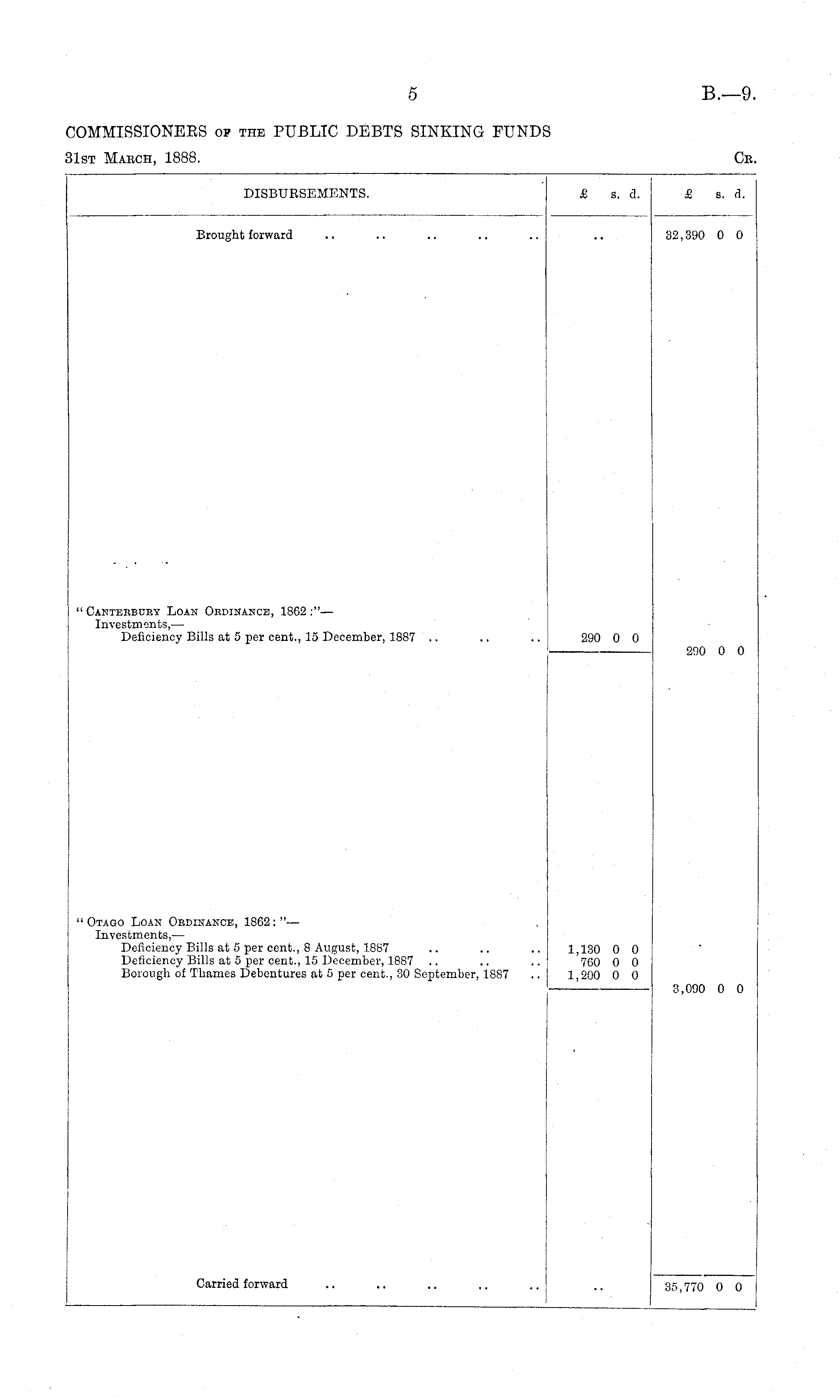 1st Maech, DISBURSEMENTS. £ s. d. £ s. d. Brought forward 32,390 0 0 " Canterbury Loan Obdinance, 18G2 :"— Investments, — Deficiency Bills at 5 per cent., 15 December, 1887 290 0 0 290 0 0 " Otago Loan Ordinance, 1862: " — Investments, — Deficiency Bills at o per cent., 8 August, 1887 Deficiency Bills at 5 per cent., 15 December, 1887 .. Borough of Thames Debentures at 5 per cent., 30 September, 1887 1,130 0 0 760 0 0 1,200 0 0 3,090 0 0 Carried forward 35,770 0 0