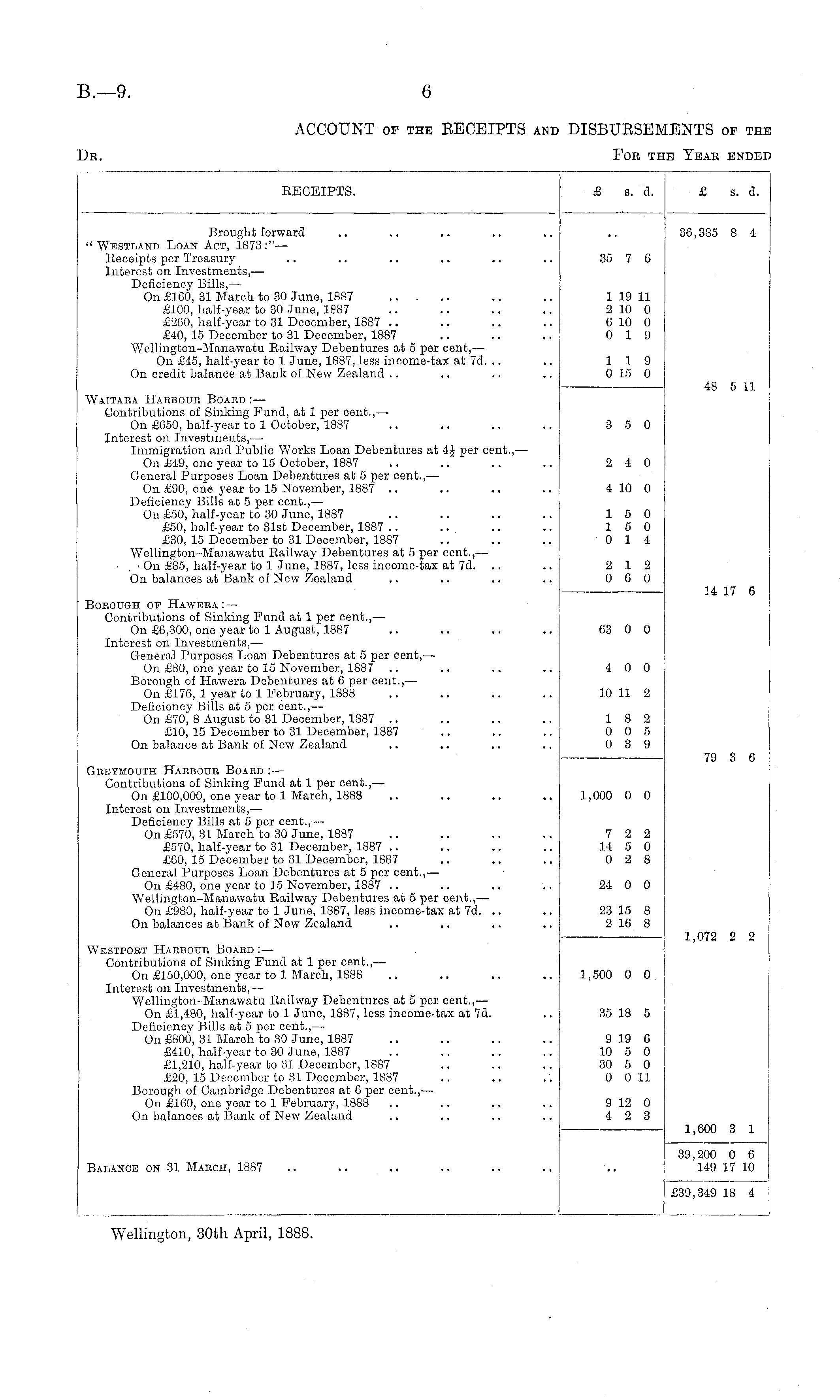 >B. OR T EAB ENDE RECEIPTS. £ s. d. £ s. d. Brought forward " Westland Loan Act, 1873:" — Receipts per Treasury Interest on Investments, — Deficiency Bills, — On £160, 31 March to 30 Juno, 1887 £100, half-year to 30 June, 1887 £200, half-year to 31 December, 1887 .. £40, 15 December to 31 December, 1887 Wellington-Manawatu Railway Debentures at 5 per cent, — On £45, half-year to 1 June, 1887, less income-tax at 7d. .. On credit balance at Bank of New Zealand .. 35 7 0 1 19 11 2 10 0 G 10 0 0 19 30,385 8 4 1 1 9 0 15 0 48 5 11 Waitara Harbour Board :— Contributions of Sinking Fund, at 1 per cent., — On £050, half-year to 1 October, 1887 Interest on Investments, — Immigration and Public Works Loan Debentures at 4J per cent., — On £49, one year to 15 October, 1887 General Purposes Loan Debentures at 5 per cent., — On £90, one year to 15 November, 1887 Deficiency Bills at 5 per cent., — On £50, half-year to 30 June, 1887 £50, half-year to 31st December, 1887 £30, 15 December to 31 December, 1887 Wellington-Manawatu Railway Debentures at 5 per cent., — - . ■ On £85, half-year to 1 June, 1887, less income-tax at 7d. On balances at Bank of New Zealand 3 5 0 2 4 0 4 10 0 15 0 15 0 0 14 2 12 0 G 0 Borough op Haweka :— Contributions of Sinking Fund at 1 per cent., — On £6,300, one year to 1 August, 1887 Interest on Investments, — General Purposes Loan Debentures at 5 per cent, — On £80, one year to 15 November, 1887 Borough of Hawera Debentures at 6 per cent., — On £176, 1 year to 1 February, 1888 Deficiency Bills at 5 per cent., — On £70, 8 August to 31 December, 1887 £10, 15 December to 31 December, 1887 On balance at Bank of New Zealand G3 0 0 4 0 0 10 11 2 18 2 0 0 5 0 3 9 Greymouth Harbour Board :— Contributions of Sinking Fund at 1 per cent., — On £100,000, one year to 1 March, 1888 Interest on Investments, — Deficiency Bills at 5 per cent., — On £570, 31 March to 30 June, 1887 £570, half-year to 31 December, 1887 £60, 15 December to 31 December, 1887 General Purposes Loan Debentures at 5 per cent., — On £480, one year to 15 November, 1887 Wellington-Manawatu Railway Debentures at 5 per cent., — On £980, half-year to 1 June, 1887, less income-tax at 7d. .. On balances at Bank of New Zealand 79 3 6 1,000 0 0 7 2 2 14 5 0 0 2 8 24 0 0 28 15 8 2 16 8 Westport Harbour Board :— Contributions of Sinking Fund at 1 per cent., — On £150,000, one year to 1 March, 1888 Interest on Investments, — Wellington-Manawatu Railway Debentures at 5 per cent., — On £1,480, half-year to 1 June, 1887, less income-tax at 7d. Deficiency Bills at 5 per cent., — On £800, 31 March to 30 Juno, 1887 £410, half-year to 30 June, 1887 £1,210, half-year to 31 December, 1887 £20, 15 December to 31 December, 1887 Borough of Cambridge Debentures at 0 per cent., — On £160, one year to 1 February, 1888 On balances at Bank of New Zealand 1,072 2 2 1,500 0 0 35 18 5 9 19 6 10 5 0 30 5 0 0 0 11 9 12 0 4 2 3 1,600 3 1 Balance on 31 March, 1887 t i 39,200 0 6 149 17 10 £39,349 18 4
