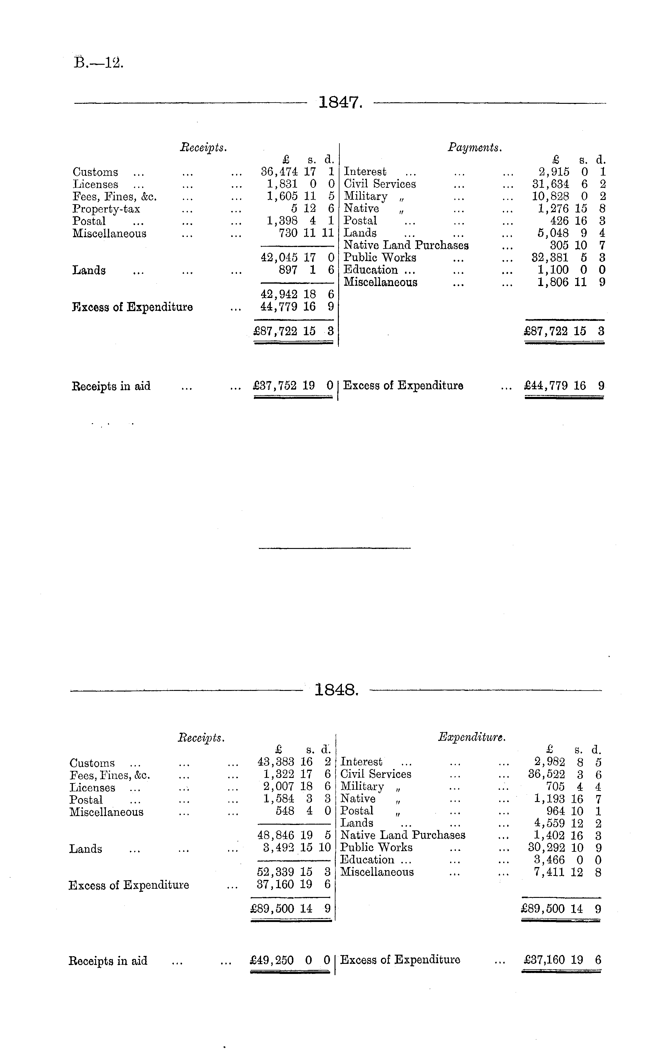 1847. Receipts. Payments. £ s. d. £ s. d. Customs ... ... ... 36,474 17 1 Interest ... ... ... 2,915 0 1 Licenses ... ... ... 1,831 0 0 Civil Services ... ... 31,634 6 2 Fees, Fines, &c. ... ... 1,605 11 5 Military „ ... ... 10,828 0 2 Property-tax ... ... 512 6 Native „ ... ... 1,276 15 8 Postal ... ... ... 1,398 4 1 Postal ... ... ... 426 16 3 Miscellaneous ... ... 730 11 11 Lands ... ... ... 5,048 9 4 —.— Native Land Purchases ... 305 10 7 42,045 17 0 Public Works ... ... 32,381 5 3 Lands ... ... ... 897 1 6 Education ... ... ... 1,100 0 0 Miscellaneous ... ... 1,806 11 9 42,942 18 6 Excess of Expenditure ... 44,779 16 9 £87,722 15 3 £87,722 15 3 Eeceipts in aid ... ... £37,752 19 0 Excess of Expenditure ... £44,779 16 9