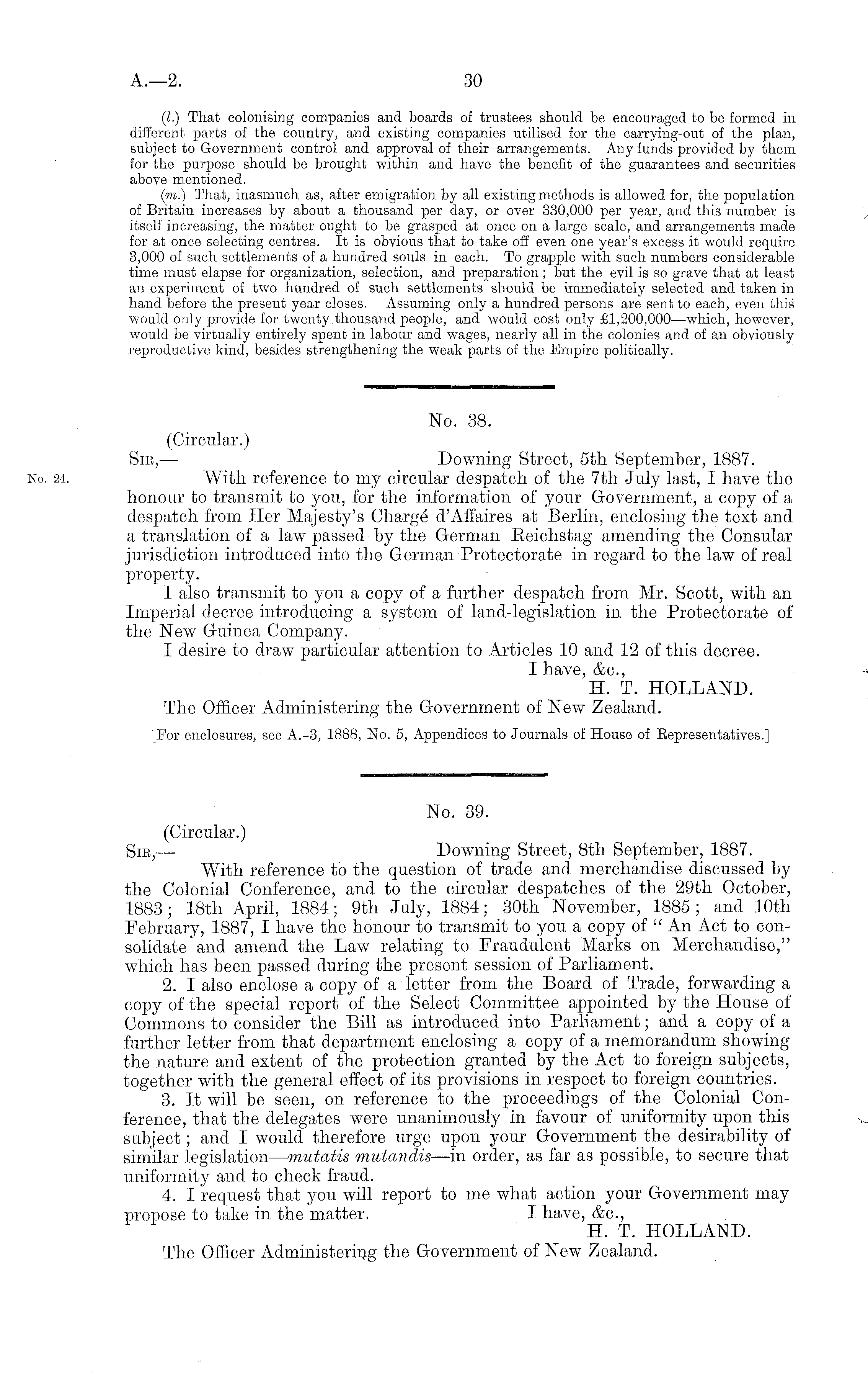 No. 39. (Circular.) Sir,— Downing Street, Bth September, 1887. With reference to the question of trade and merchandise discussed by the Colonial Conference, and to the circular despatches of the 29th October, 1883; 18th April, 1884; 9th July, 1884; 30th November, 1885; and 10th February, 1887, I have the honour to transmit to you a copy of " An Act to consolidate and amend the Law relating to Fraudulent Marks on Merchandise," which has been passed during the present session of Parliament. 2. I also enclose a copy of a letter from the Board of Trade, forwarding a copy of the special report of the Select Committee appointed by the House of Commons to consider the Bill as introduced into Parliament; and a copy of a further letter from that department enclosing a copy of a memorandum showing the nature and extent of the protection granted by the Act to foreign subjects, together with the general effect of its provisions in respect to foreign countries. 3. It will be seen, on reference to the proceedings of the Colonial Conference, that the delegates were unanimously in favour of uniformity upon this subject; and I would therefore urge upon your Government the desirability of similar legislation — mutatis mutandis —in order, as far as possible, to secure that uniformity and to check fraud. 4. I request that you will report to me what action your Government may propose to take in the matter. I have, &c, H. T. HOLLAND. The Officer Administering the Government of New Zealand.