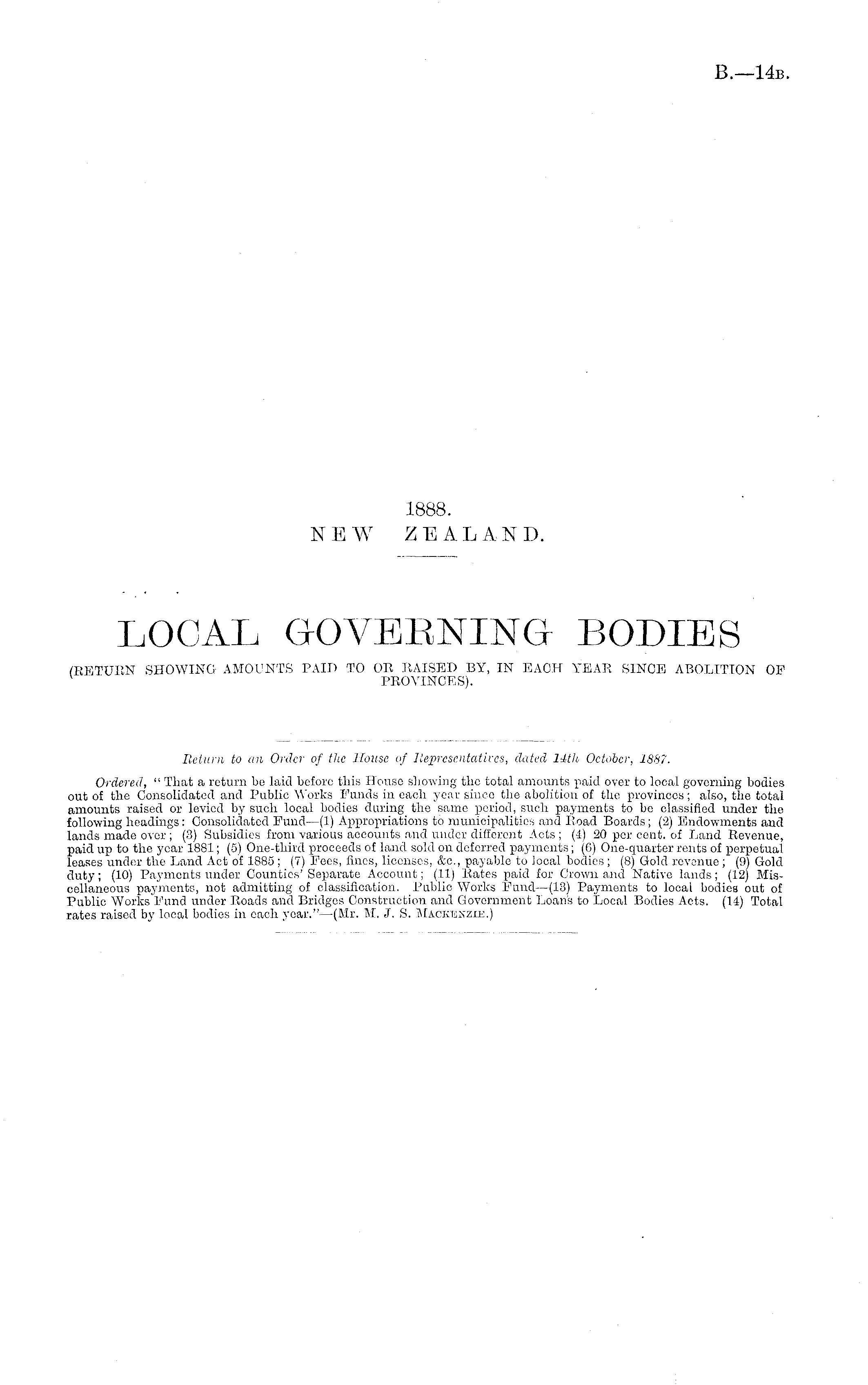 Return to an Order of the House of Representatives, dated 14th October, 1887. Ordered, " That a return be laid before tins House showing the total amounts paid over to local governing bodies out of the Consolidated and Public Works Funds in each year since the abolition of the provinces; also, the total amounts raised or levied by such local bodies during the same period, such payments to be classified under the following headings: Consolidated Fund —(1) Appropriations to municipalities and Road Boards; (2) Endowments and lands made over; (3) Subsidies from various accounts and under different Acts ; (4) 20 per cent, of Land Revenue, paid up to the year 1881; (5) One-third proceeds of land sold on deferred payments; (6) One-quarter rents of perpetual leases under the Land Act of 1885; (7) Fees, fines, licenses, &0., payable to local bodies; (8) Gold revenue; (9) Gold duty; (10) Payments under Counties' Separate Account; (11) Rates paid for Crown and Native lands; (12) Miscellaneous payments, not admitting of classification. Public Works Fund —(13) Payments to local bodies out of Public Works Fund under Roads and Bridges Construction and Government Loan's to Local Bodies Acts. (14) Total rates raised by local bodies in each year."—(Mr. M. J. S. Mackenzie.)