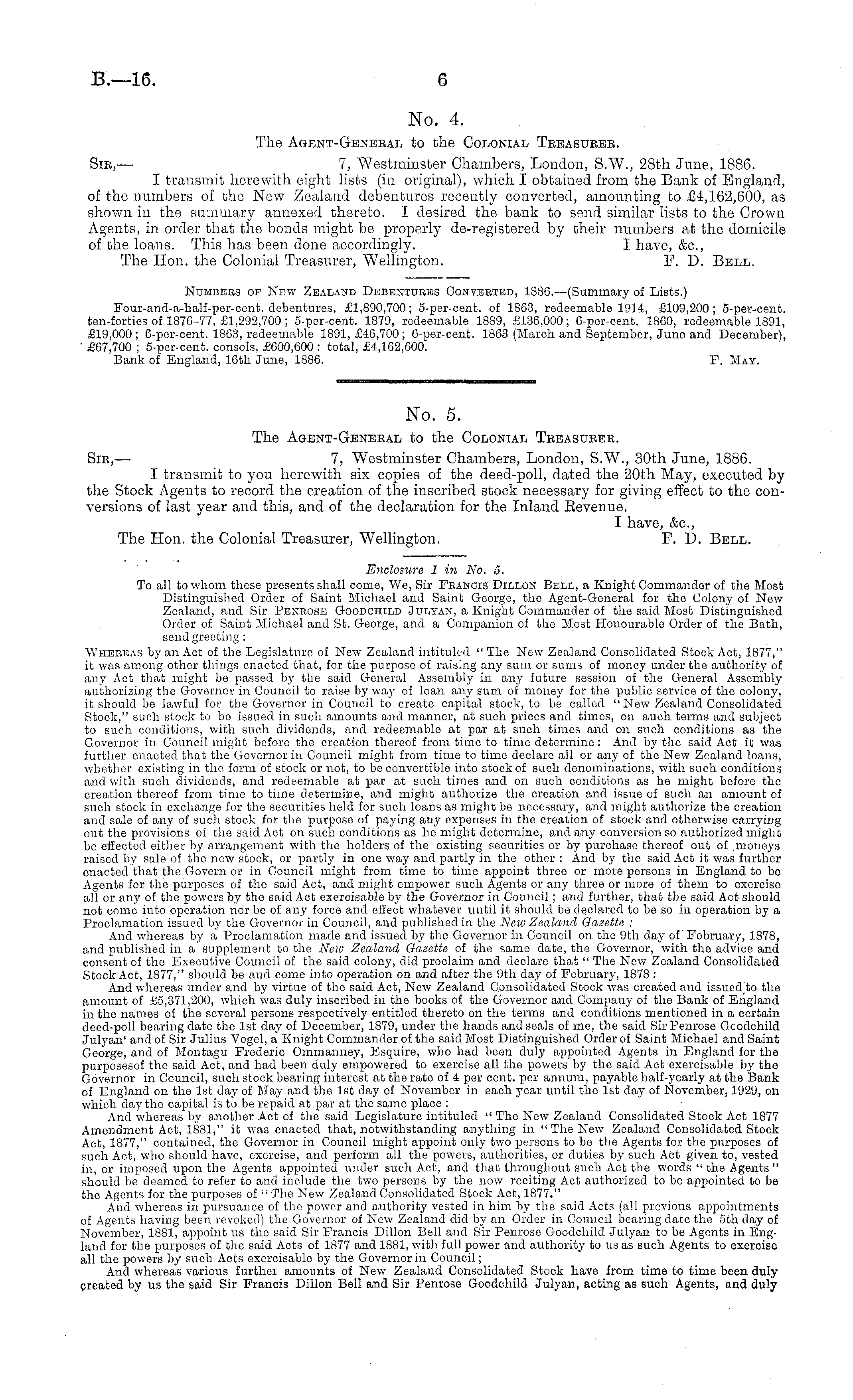 No. 5. The Agent-General to the Colonial Treasurer. Sir, — 7, Westminster Chambers, London, S.W., 30th June, 1886. I transmit to you herewith six copies of the deed-poll, dated the 20th May, executed by the Stock Agents to record the creation of the inscribed stock necessary for giving effect to the conversions of last year and this, and of the declaration for the Inland Revenue. I have, &c, The Hon. the Colonial Treasurer, Wellington. F. D. Bell.