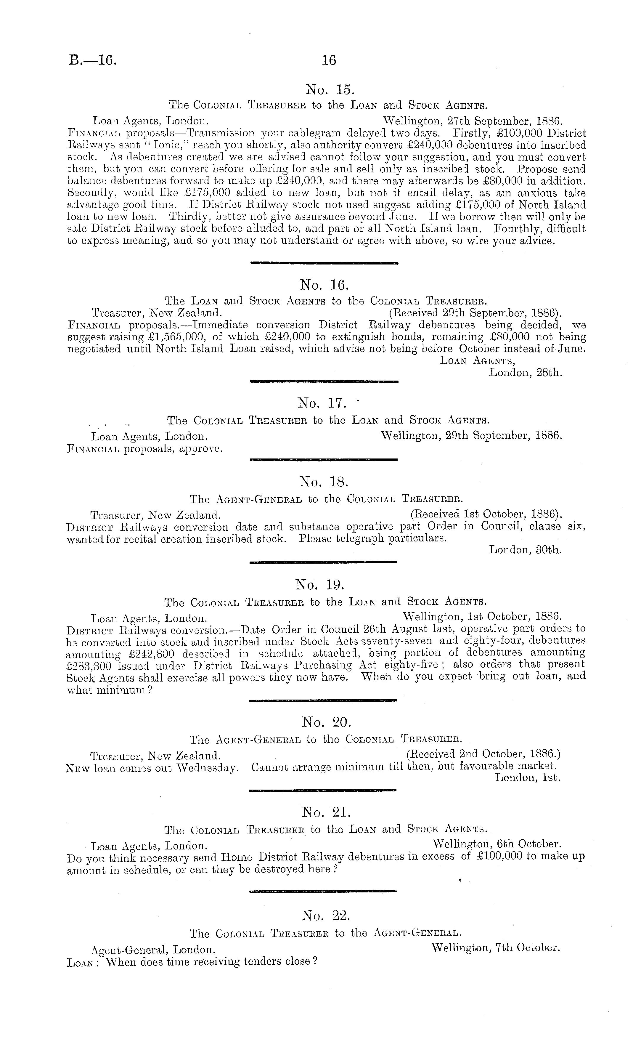 No. 15. The Colonial Treasurer to the Loan and Stock Agents. Loan Agents, London. Wellington, 27th September, 1886. Financial proposals—Transmission your cablegram delayed two days. Firstly, £100,000 District Bailways sent "lonic," reach you shortly, also authority convert £240,000 debentures into inscribed stock. As debentures created we are advised cannot follow your suggestion, and you must convert them, but you can convert before offering for sale and sell only as inscribed stock. Propose send balance debentures forward to make up £240,000, and there may afterwards be £80,000 in addition. Secondly, would like £175,000 added to new loan, but not if entail delay, as am anxious take advantage good time. If District Bailway stock not used suggest adding £175,000 of North Island loan to new loan. Thirdly, better not give assurance beyond June. If we borrow then will only be sale District Bailway stock before alluded to, and part or all North Island loan. Fourthly, difficult to express meaning, and so you may not understand or agree with above, so wire your advice.