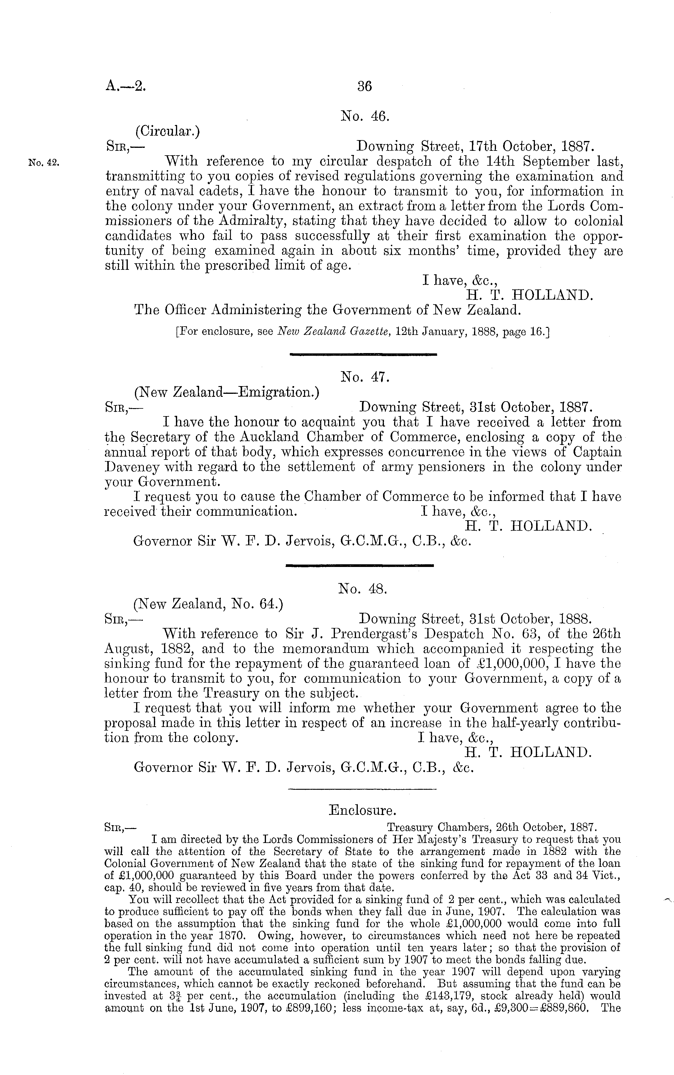 Enclosure. Sm, — Treasury Chambers, 26th October, 1887. I am directed by the Lords Commissioners of Her Majesty's Treasury to request that you will call the attention of the Secretary of State to the arrangement made in 1882 with the Colonial Government of New Zealand that the state of the sinking fund for repayment of the loan of £1,000,000 guaranteed by this Board under the powers conferred by the Act 33 and 34 Viet., cap. 40, should be reviewed in five years from that date. You will recollect that the Act provided for a sinking fund of 2 per cent., which was calculated to produce sufficient to pay off the bonds when they fall due in June, 1907. The calculation was based on the assumption that the sinking fund for the whole £1,000,000 would come into full operation in the year 1870. Owing, however, to circumstances which need not here be repeated the full sinking fund did not come into operation until ten years later; so that the provision of 2 per cent, will not have accumulated a sufficient sum by 1907 to meet the bonds falling due. The amount of the accumulated sinking fund in the year 1907 will depend upon varying circumstances, which cannot be exactly reckoned beforehand. But assuming that the fund can be invested at 3f per cent., the accumulation (including the £143,179, stock already held) would amount on the Ist June, 1907, to £899,160; less income-tax at, say, 6d., £9,300=£889,860, The