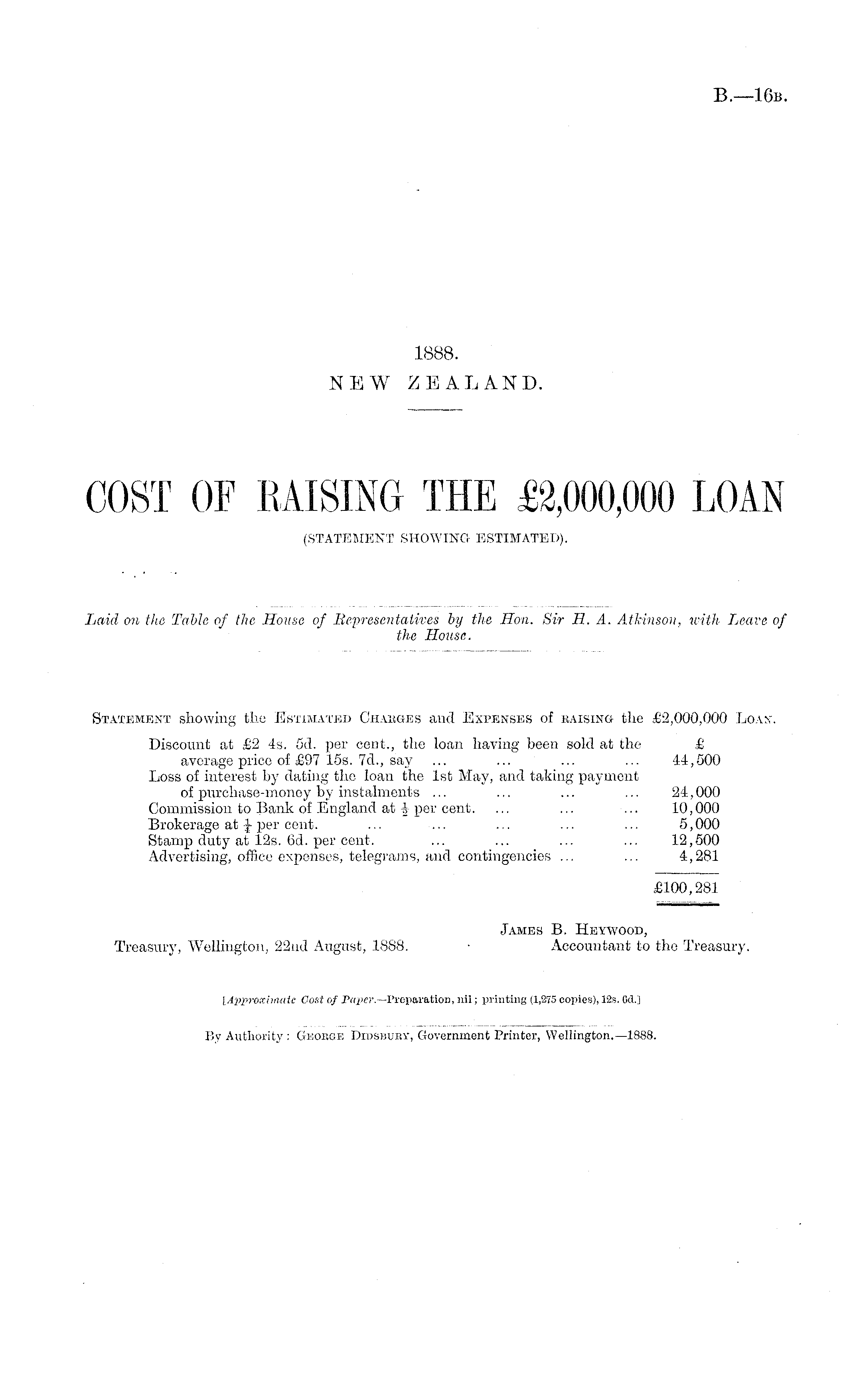 Statement showing the Estimated Chakges and Expenses of baising the £2,000,000 Loan Discount at £2 4s. sd. per cent., the loan having been sold at the £ average price of £97 15s. 7d., say ... ... ... ... 44,500 Loss of interest by dating the loan the Ist May, and taking payment of purchase-money by instalments ... ... ... ... 24,000 Commission to Bank of England at i 5 per cent. •■• ■■• ■•• 10,000 Brokerage at £ per cent. ... ... ... ... ... 5,000 Stamp duty at 12s. 6d. per cent. ... ... ... ... 12,500 Advertising, office expenses, telegrams, and contingencies ... ... 4,281 £100,281 James B. Heywood, Treasury, Wellington, 22nd August, 1888. Accountant to the Treasury. {dpproccimato Cost of Paper.-—Preparation, nil; printing (1,275 copies), 12s. Gd.J