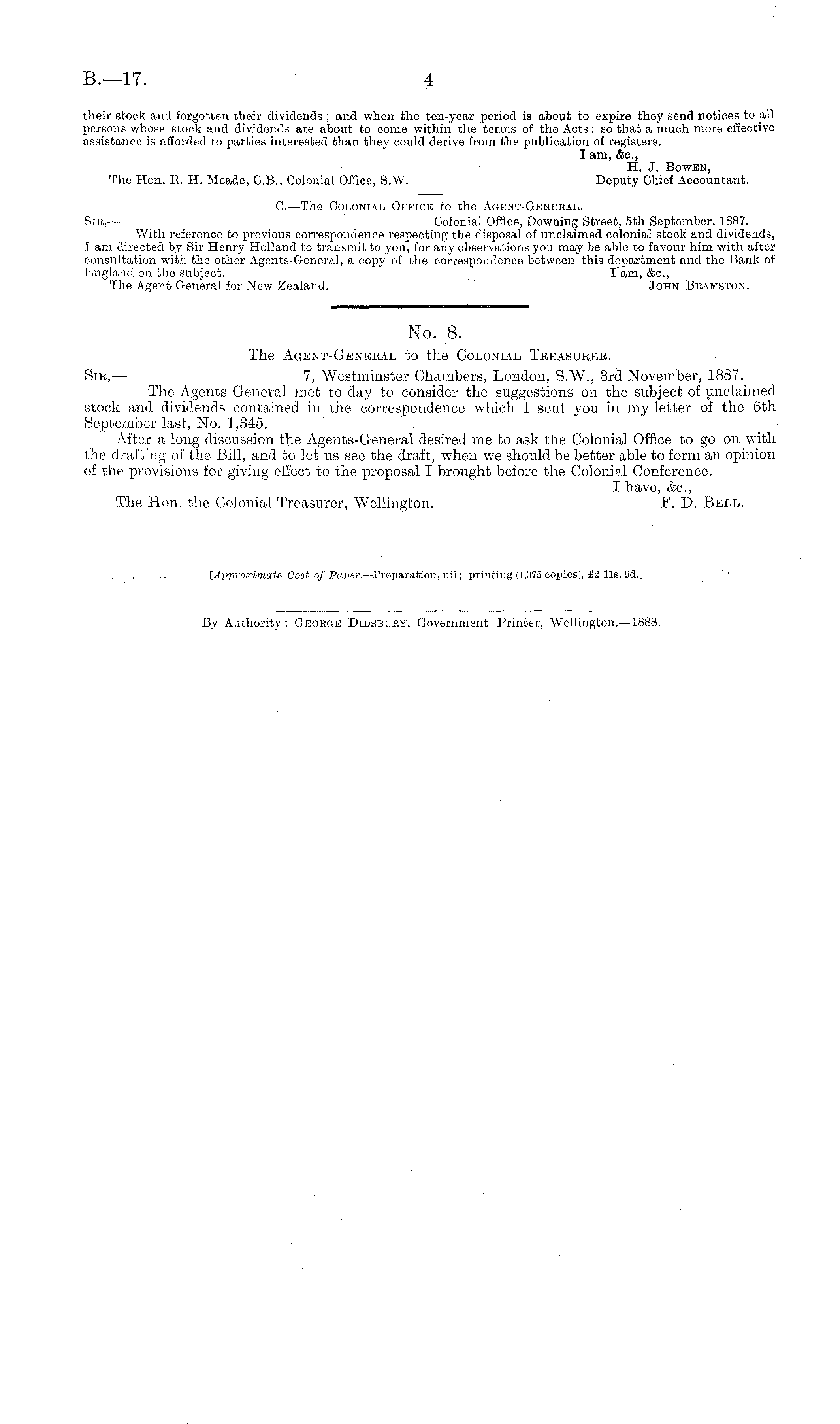 No. 8. The Agent-General to the Colonial Treasurer. Sib, — 7, Westminster Chambers, London, S.W., 3rd November, 1887. The Agents-General met to-day to consider the suggestions on the subject of unclaimed stock and dividends contained in the correspondence which I sent you in my letter of the 6th September last, No. 1,345. After a long discussion the Agents-General desired me to ask the Colonial Office to go on with the drafting of the Bill, and to let us see the draft, when we should be better able to form an opinion of the provisions for giving effect to the proposal I brought before the Colonial Conference. I have, &c, The Hon. the Colonial Treasurer, Wellington. F. D. Bell.