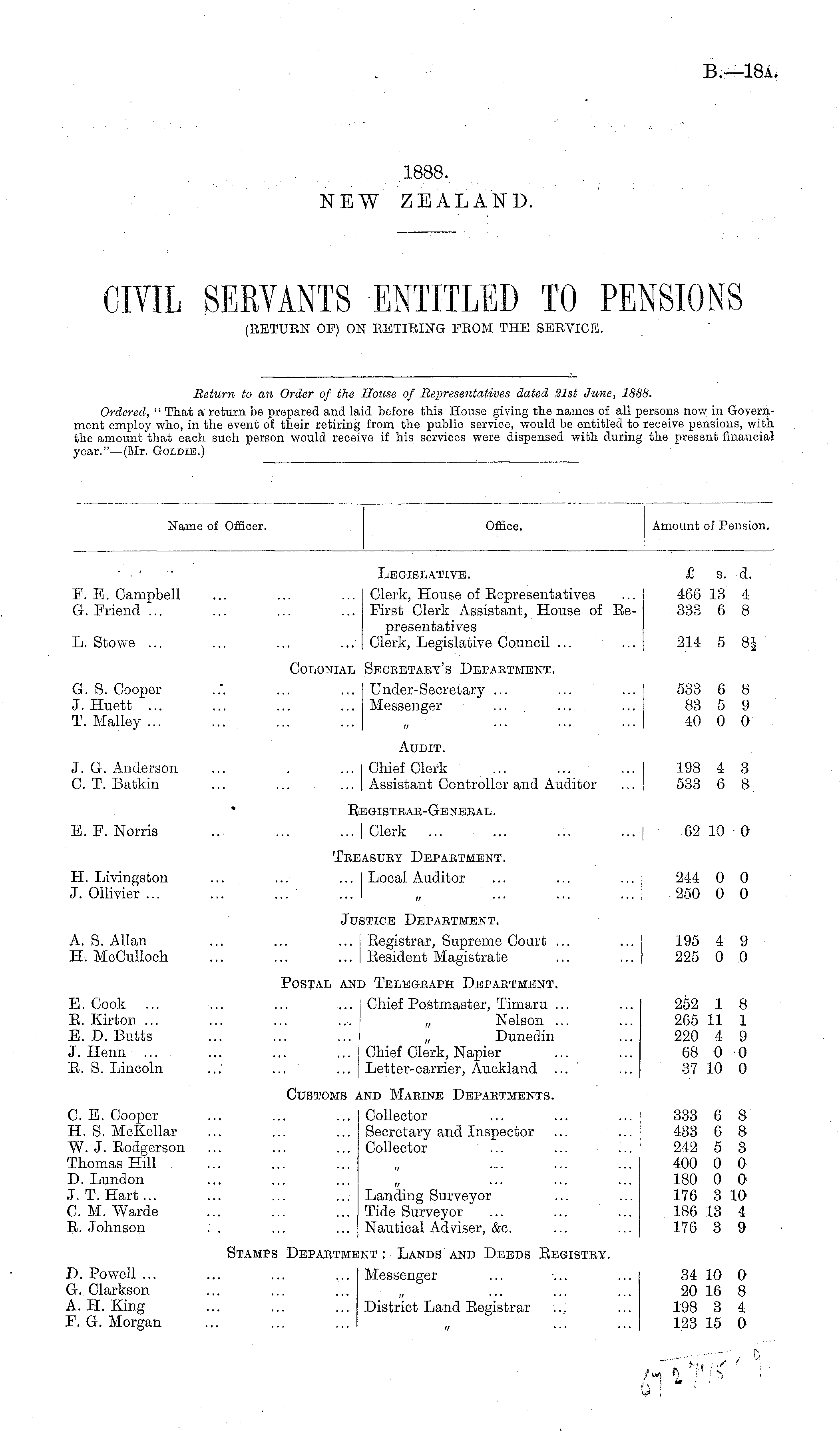 Name of Officer. Office. Amount of Pension. Legislative. £ s. d. F. E. Campbell G. Friend ... L. Stowe ... ... Clerk, House of Eepresentatives ... 466 13 4 ... First Clerk Assistant, House of Ee- 333 6 8 presentatives ... Clerk, Legislative Council ... ... 214 5 8f Colonial Seceetaey's Department. G. S. Cooper J. Huett ... T. Malley ... ... Under-Secretary ... ... ... ! 533 6 8 ... Messenger ... ... ... 83 5 9 40 0 0 Audit. J. G. Anderson C. T. Batkin ... Chief Clerk ... ... ... 198 4 3 ... Assistant Controller and Auditor ... 533 6 8 Eegistbae-Geneeal. E. F. Norris ... Clerk ... ... ... ... | 62 10 0 Tbeasury Department. H. Livingston J. Ollivier ... ... Local Auditor ... ... ... 244 0 0 250 0 0 Justice Depabtment. A. S. Allan H, MoCulloch ... Eegistrar, Supreme Court ... ... 195 4 9 ... Eesident Magistrate ... ... 225 0 0 Postal and Telbgeaph Department. E. Cook ... E. Kirton ... E. D. Butts J. Henri E. S. Lincoln ... i Chief Postmaster, Timaru ... ... 252 1 8 Nelson ... ... 265 11 1 Dunedin ... 220 4 9 ... i Chief Clerk, Napier ... ... 68 0 0 ... ... Letter-carrier, Auckland ... ... 37 10 0 Customs and Mabine Departments. C. E. Cooper H. S. McKellar W. J. Eodgsrson Thomas Hill D. Lund on J. T.Hart... C. M. Warde E. Johnson ... Collector ... ... ... 333 6 8 ... Secretary and Inspector ... ... 433 6 8 ... Collector ... ... ... 242 5 3 400 0 0 180 0 0 ... Landing Surveyor ... ... 176 3 10 ... Tide Surveyor ... ... ... 186 13 4 ... Nautical Adviser, &c. ... ... 176 3 9 Stamps Depabtment: Lands and Deeds Eegistby. D. Powell ... G. Clarkson A. H. King F. G. Morgan ... Messenger ... ... ... 34 10 0 20 16 8 ... District Land Eegistrar ... ... 198 3 4 123 15 0 (>V
