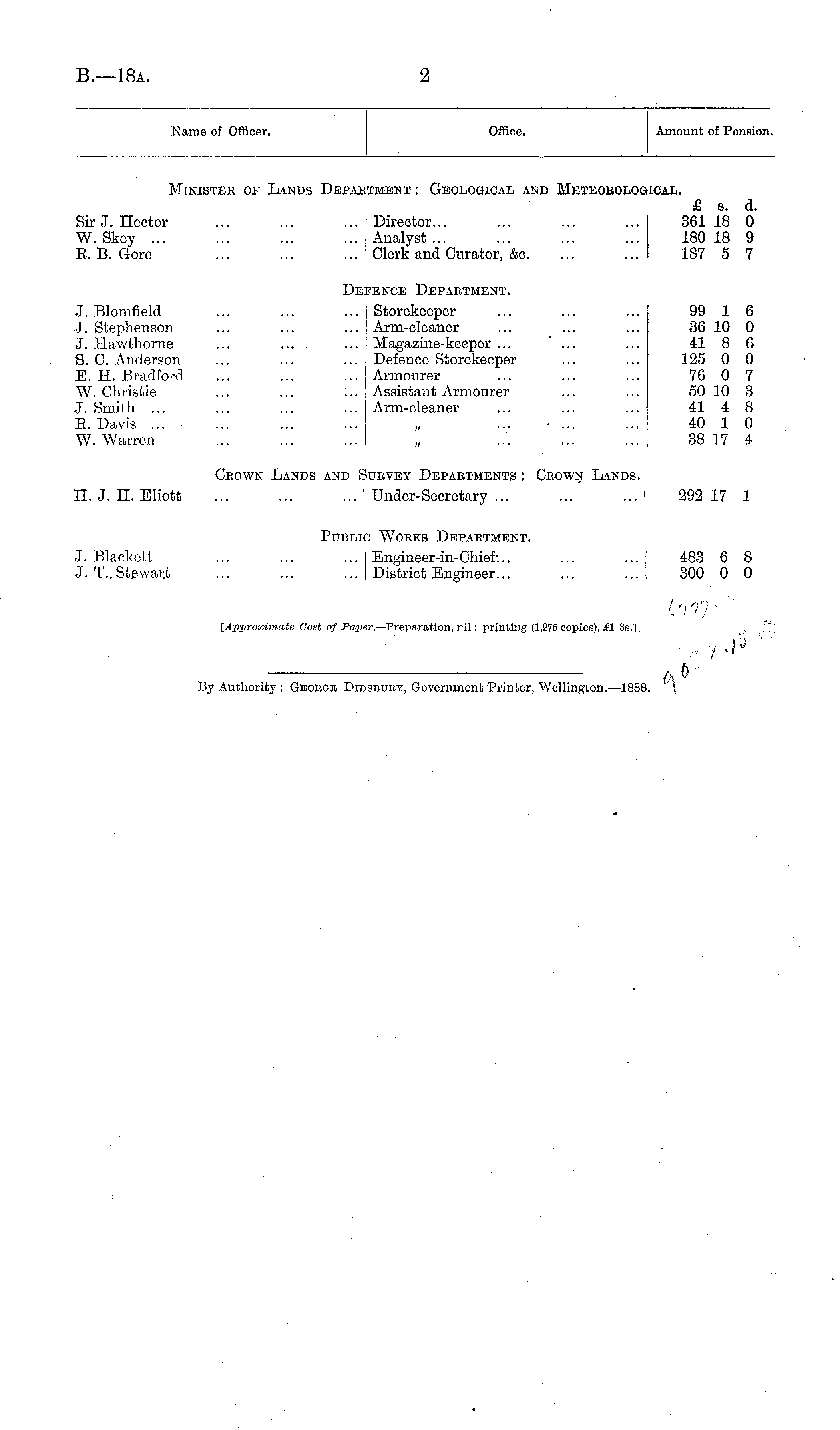 Name of Officer. Office. Amount of Pension. Ministeb of Lands Depabtment : Geological and Meteoeological. £ s. Sir J. Hector ... ... ... Director... ... ... ... 36118 V. Skey ... ... ... ... Analyst... ... ... ... 180 18 I. B. Gore ... ... ... Clerk and Curator, &o. ... ... 187 5 d. 0 9 7 Defence Depaetment. . Blomfield ... ... ... Storekeeper ... ... ... 99 1 '. Stephenson ... ... ... Arm-cleaner ... ... ... 36 10 . Hawthorne ... ... ... Magazine-keeper ... "... ... 41 8 !. C. Anderson ... ... ... Defence Storekeeper ... ... 125 0 0. H. Bradford ... ... ... Armourer ... ... ... 76 0 V. Christie ... ... ... Assistant Armourer ... ... 50 10 . Smith ... ... ... ... Arm-cleaner ... ... ... 41 4 1. Davis ... ... ... ... „ ... • ... ... 40 1 V. Warren ... ... ... „ ... ... ... 38 17 6 0 6 0 7 3 8 0 4 Ceown Lands and Suevey Depaetments : Ceown Lands. I. J. H. Eliott ... ... ... | Under-Secretary ... ... ... | 292 17 1 Public Wobks Depaetment. . Blackett ... ... ... Engineer-in-Chief:.. ... ... 483 6 . T..Stewart ... ... ... District Engineer... ... ... 300 0 8 0