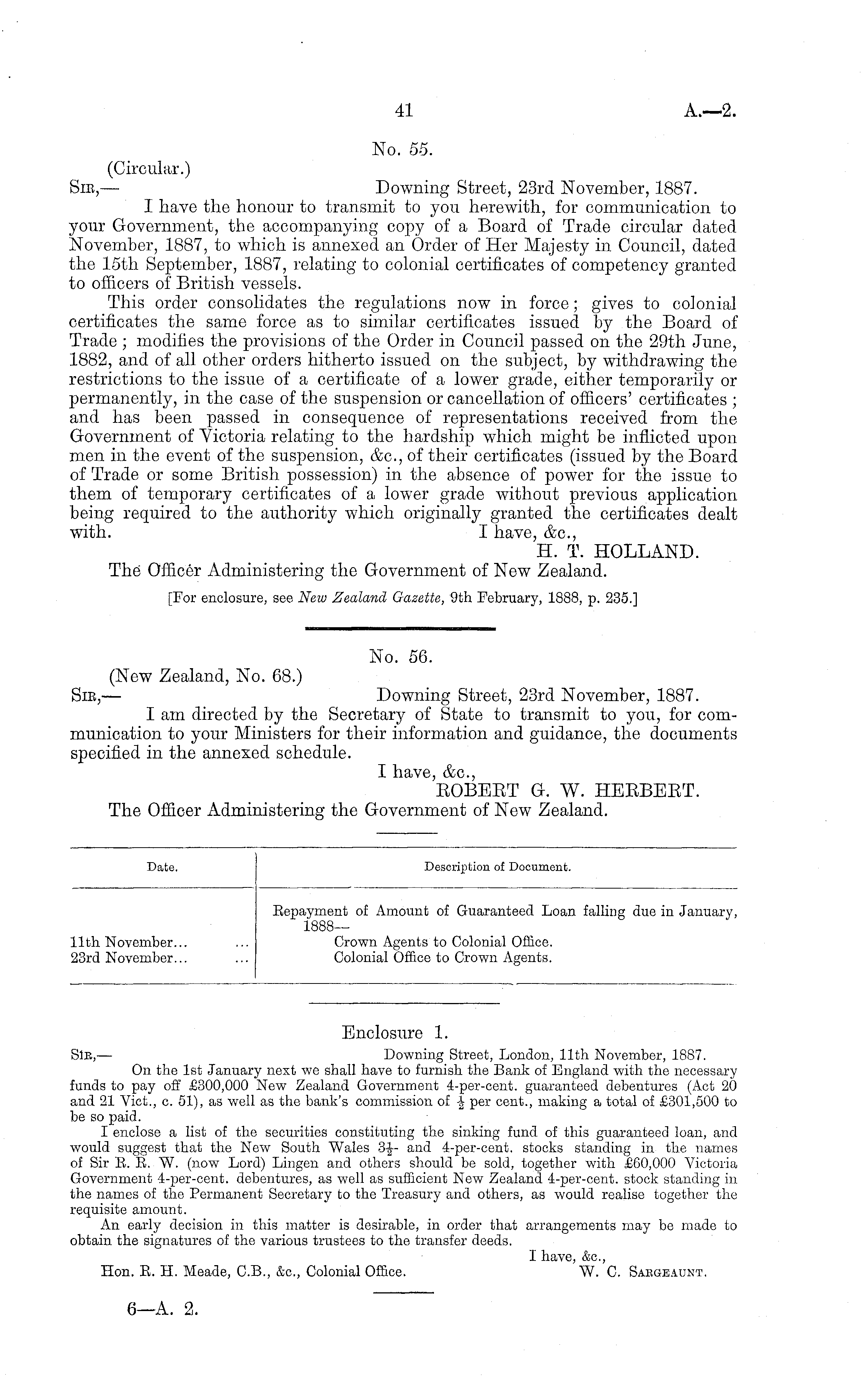 Enclosure 1. SIE, — Downing Street, London, 11th November, 1887. On the Ist January next we shall have to furnish the Bank of England with the necessary funds to pay off £300,000 New Zealand Government 4-per-cent. guaranteed debentures (Act 20 and 21 Viet., c. 51), as well as the bank's commission of -J per cent., making a total of £301,500 to be so paid. I enclose a list of the securities constituting the sinking fund of this guaranteed loan, and would suggest that the New South Wales 3-|- and 4-per-cent. stocks standing in the names of Sir E. B. W. (now Lord) Lingen and others should be sold, together with £60,000 Victoria Government 4-per-cent. debentures, as well as sufficient New Zealand 4-pcr-cent. stock standing in the names of the Permanent Secretary to the Treasury and others, as would realise together the requisite amount. An early decision in this matter is desirable, in order that arrangements may be made to obtain the signatures of the various trustees to the transfer deeds. I have, &c, Hon. E. H. Meade, C.8., &c, Colonial Office. W. C. Sakgeaunt.
