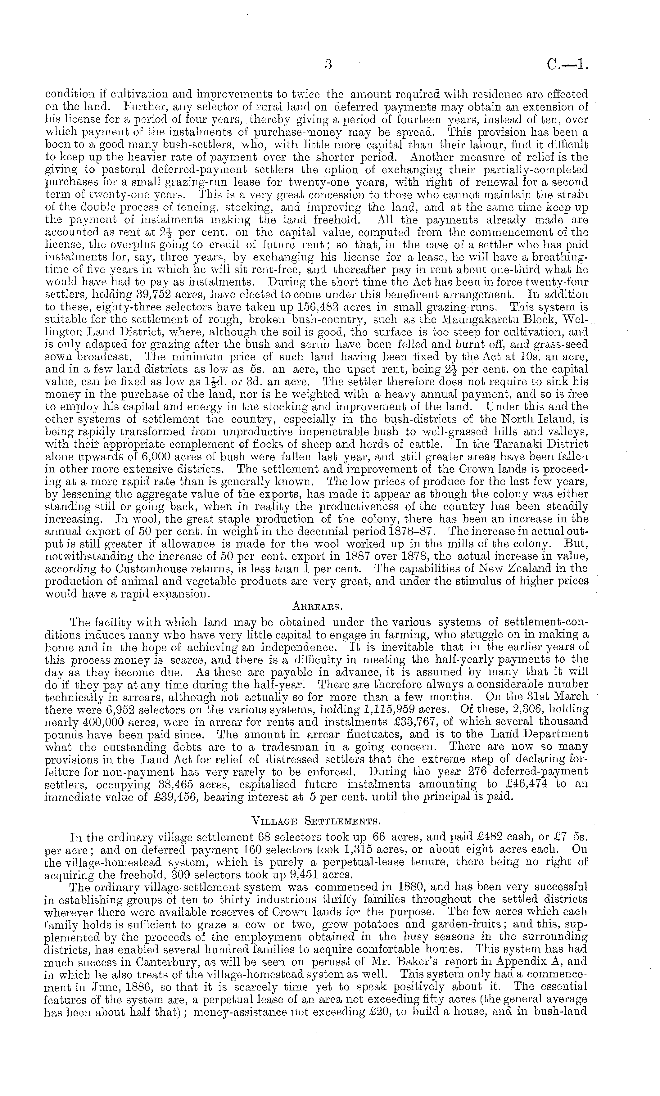 condition if cultivation and improvements to twice the amount required with residence are effected on the land. Further, any selector of rural land on deferred payments may obtain an extension of his license for a period of four years, thereby giving a period of fourteen years, instead of ten, over which payment of the instalments of purchase-money may be spread. This provision has been a boon to a good many bush-settlers, who, with little more capital than their labour, find it difficult to keep up the heavier rate of payment over the shorter period. Another measure of relief is the giving to pastoral deferred-payment settlers the option of exchanging their partially-completed purchases for a small grazing-run lease for twenty-one years, with right of renewal for a second term of twenty-one years. This is a very great concession to those who cannot maintain the strain of the double process of fencing, stocking, and improving the land, and at the same time keep up the payment of instalments making the land freehold. All the payments already made are accounted as rent at 2J per cent, on the capital value, computed from the commencement of the license, the overplus going to credit of future rent; so that, in the case of a settler who has paid instalments for, say, three years, by exchanging his license for a lease, he will have a breathingtime of five years in which he will sit rent-free, and thereafter pay in rent about one-third what he would have had to pay as instalments. During the short time the Act has been in force twenty-four settlers, holding 39,752 acres, have elected to come under this beneficent arrangement. In addition to these, eighty-three selectors have taken up 156,482 acres in small grazing-runs. This system is suitable for the settlement of rough, broken bush-country, such as the Maungakaretu Block, Wellington Land District, where, although the soil is good, the surface is too steep for cultivation, and is only adapted for grazing after the bush and scrub have been felled and burnt off, and grass-seed sown broadcast. The minimum price of such land having been fixed by the Act at 10s. an acre, and in a few land districts as low as ss. an acre, the upset rent, being 2-| per cent, on the capital value, can be fixed as low as l^d. or 3d. an acre. The settler therefore does not require to sink his money in the purchase of the land, nor is he weighted with a heavy annual payment, and so is free to employ his capital and energy in the stocking and improvement of the land. Under this and the other systems of settlement the country, especially in the bush-districts of the North Island, is being rapidly transformed from unproductive impenetrable bush to well-grassed hills and valleys, with their appropriate complement of flocks of sheep and herds of cattle. In the Taranaki District alone upwards of 6,000 acres of bush were fallen last year, and still greater areas have been fallen in other more extensive districts. The settlement and improvement of the Crown lands is proceeding at a more rapid rate than is generally known. The low prices of produce for the last few years, by lessening the aggregate value of the exports, has made it appear as though the colony was either standing still or going back, when in reality the productiveness of the country has been steadily increasing. In wool, the great staple production of the colony, there has been an increase in the annual export of 50 per cent, in weight in the decennial period 1878-87. The increase in actual output is still greater if allowance is made for the wool worked up in the mills of the colony. But, notwithstanding the increase of 50 per cent, export in 1887 over 1878, the actual increase in value, according to Customhouse returns, is less than 1 per cent. The capabilities of New Zealand in the production of animal and vegetable products are very great, and under the stimulus of higher prices would have a rapid expansion. Aekeabs. The facility with which land may be obtained under the various systems of settlement-con-ditions induces many who have very little capital to engage in farming, who struggle on in making a home and in the hope of achieving an independence. It is inevitable that in the earlier years of this process money is scarce, and there is a difficulty in meeting the half-yearh 7 payments to the day as they become due. As these are payable in advance, it is assumed by many that it will do if they pay at any time during the half-year. There are therefore always a considerable number technically in arrears, although not actually so for more than a few months. On the 31st March there were 6,952 selectors on the various systems, holding 1,115,959 acres. Of these, 2,306, holding nearly 400,000 acres, were in arrear for rents and. instalments £33,767, of which several thousand pounds have been paid since. The amount in arrear fluctuates, and is to the Land Department what the outstanding debts are to a tradesman in a going concern. There are now so many provisions in the Land Act for relief of distressed settlers that the extreme step of declaring forfeiture for non-payment has very rarely to be enforced. During the year 276 deferred-payment settlers, occupying 38,465 acres, capitalised future instalments amounting to £46,474 to an immediate value of £39,456, bearing interest at 5 per cent, until the principal is paid. Villag-e Settlements. In the ordinary village settlement 68 selectors took up 66 acres, and paid £482 cash, or £7 ss. per acre; and on deferred payment 160 selectors took 1,315 acres, or about eight acres each. On the village-homestead system, which is purely a perpetual-lease tenure, there being no right of acquiring the freehold, 309 selectors took up 9,451 acres. The ordinary village-settlement system was commenced in 1880, and has been very successful in establishing groups of ten to thirty industrious thrifty families throughout the settled districts wherever there were available reserves of